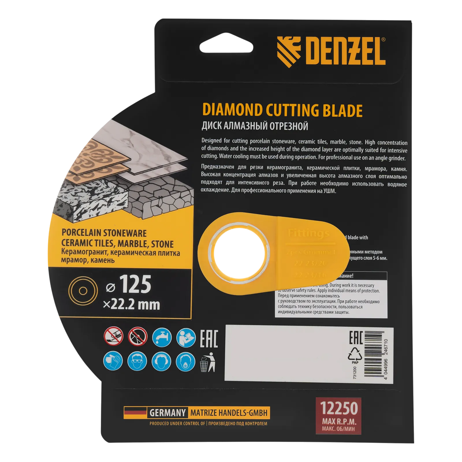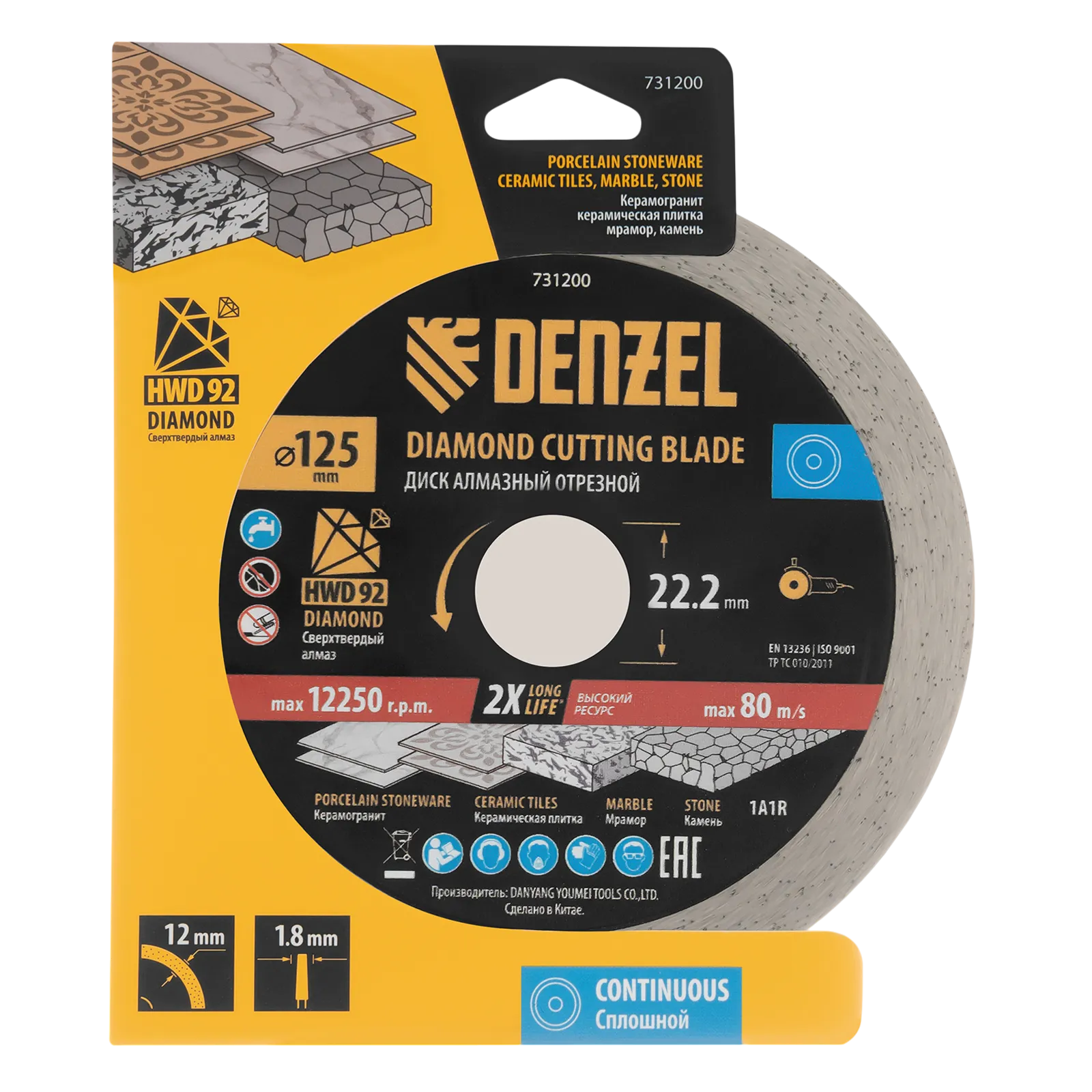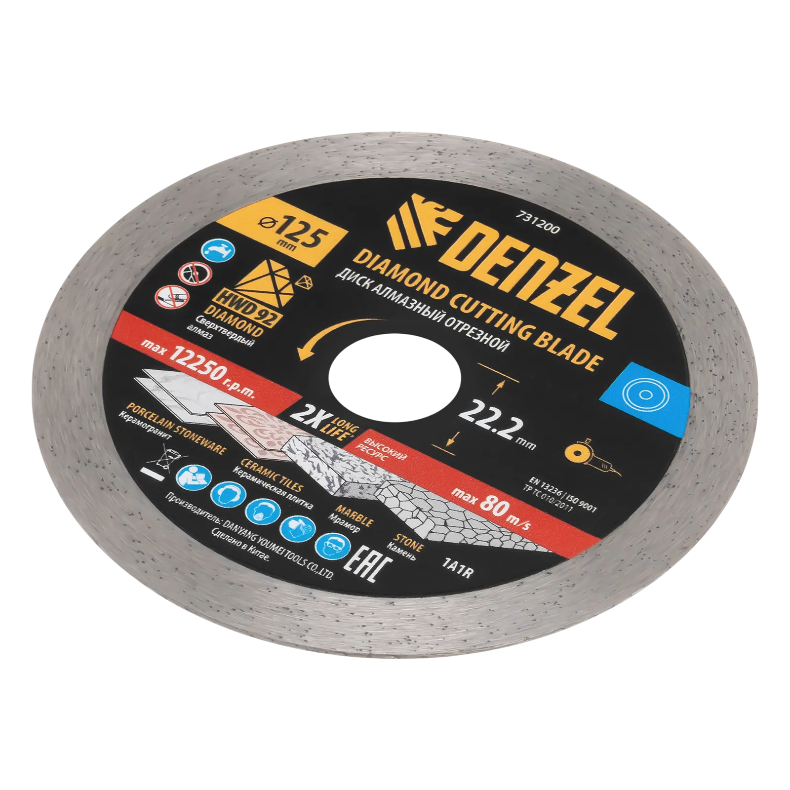 Алмазный отрезной диск Denzel 731200 диаметром 125 x 22,2 мм, со сплошной рабочей частью и слоем сверхтвердых алмазов HWD92, предназначен для мокрого резания твердых материалов. Оптимален для работы с керамогранитом, керамической плиткой, мрамором, камнем. Устанавливается на УШМ, поддерживающую частоту вращения 12250 об/мин. Необходимо использование водяного охлаждения для наиболее эффективной работы и увеличения ресурса оснастки.