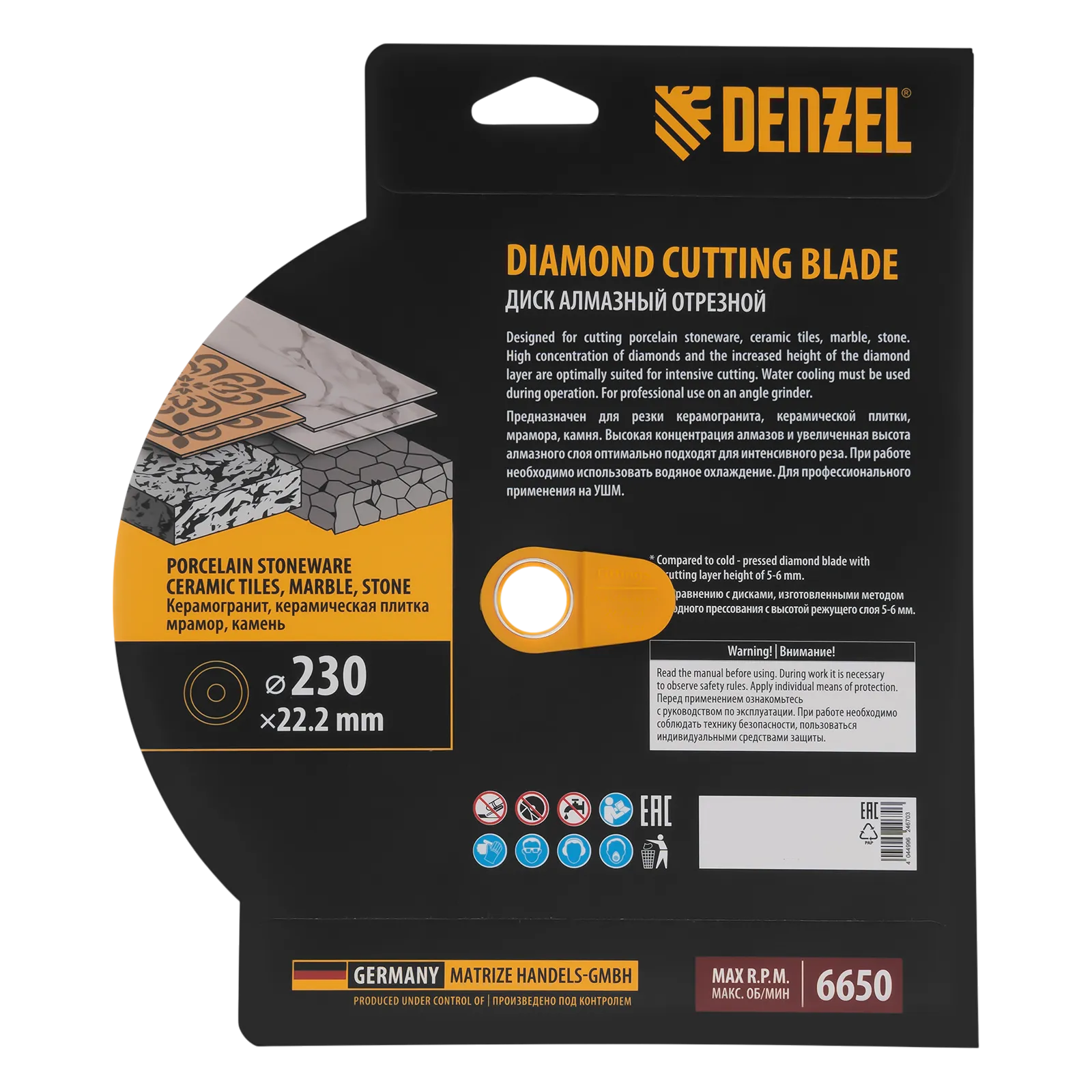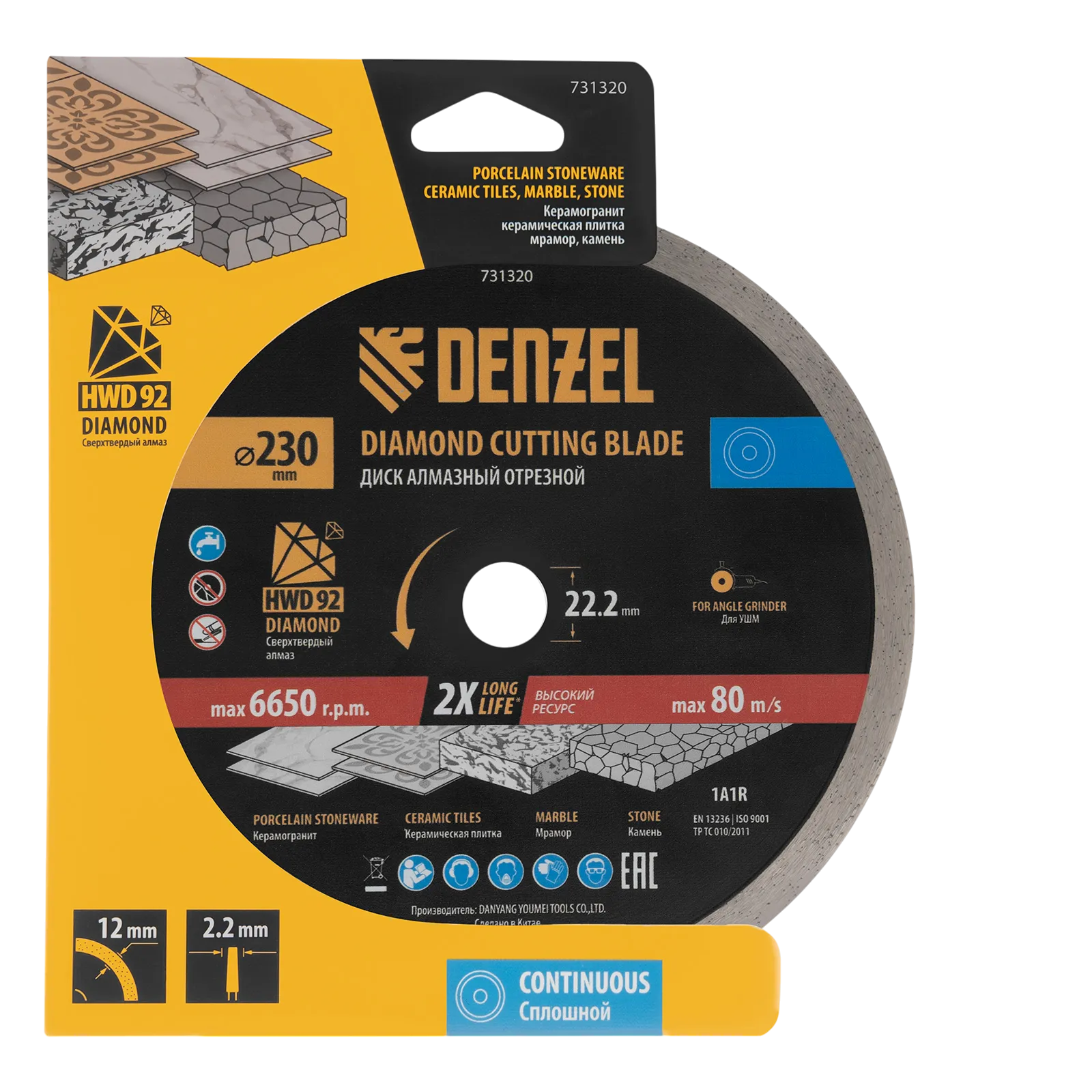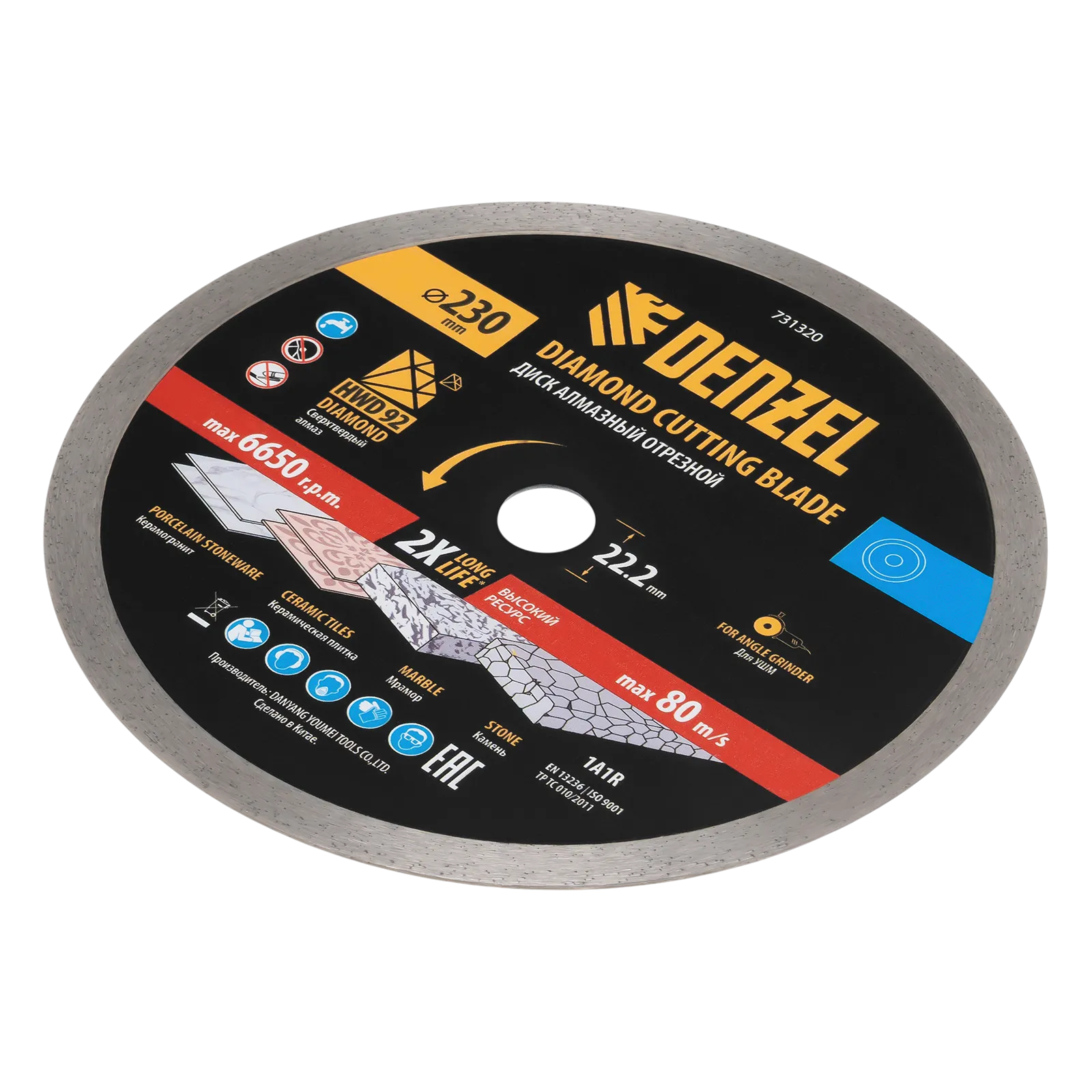 Алмазный отрезной диск Denzel 731320 диаметром 230 x 22,2 мм, со сплошной рабочей частью и слоем сверхтвердых алмазов HWD92, предназначен для мокрого резания твердых материалов. Оптимален для работы с с керамогранитом, керамической плиткой, мрамором, камнем. Устанавливается на УШМ, поддерживающую частоту вращения 6650 об/мин. Необходимо использование водяного охлаждения для наиболее эффективной работы и увеличения ресурса оснастки.