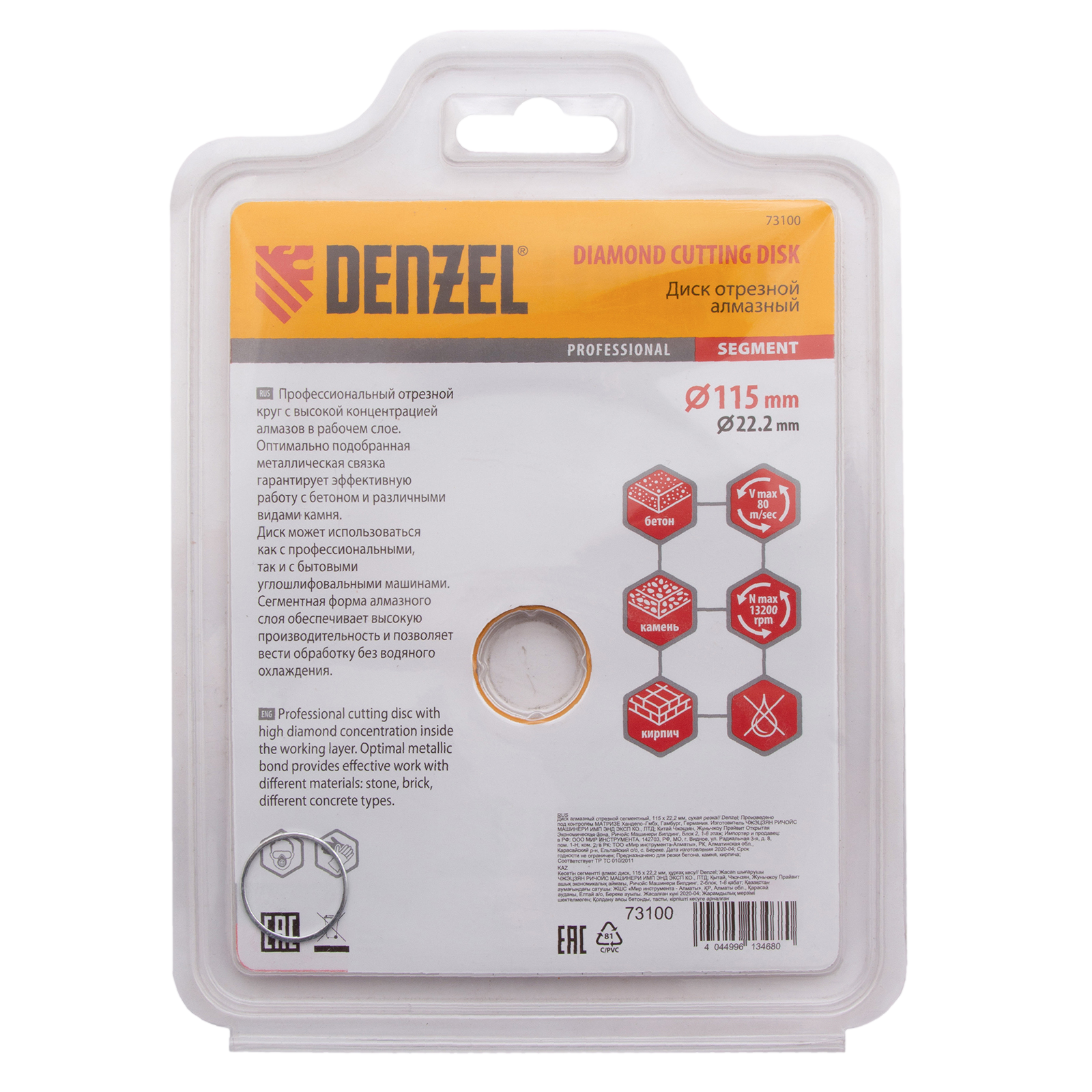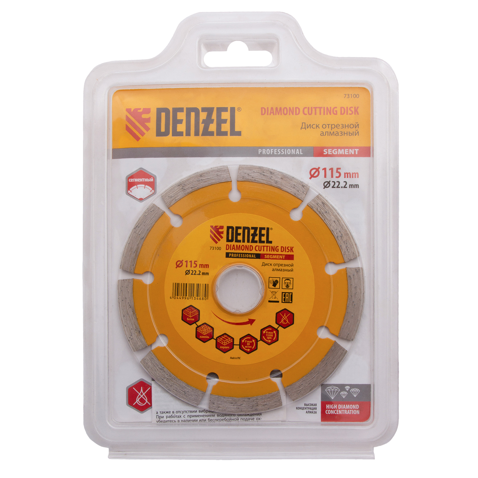 Отрезной сегментный алмазный диск Denzel 73100 диаметром 115 х 22,2 мм — оснастка для УШМ, использующаяся для сухой резки свежего и старого бетона, камня, кирпича, шлакоблока, мрамора, тротуарной плитки, гранита. Диск сегментного типа отличается высокой производительностью даже при интенсивных нагрузках. Подходит для бытового и профессионального использования.