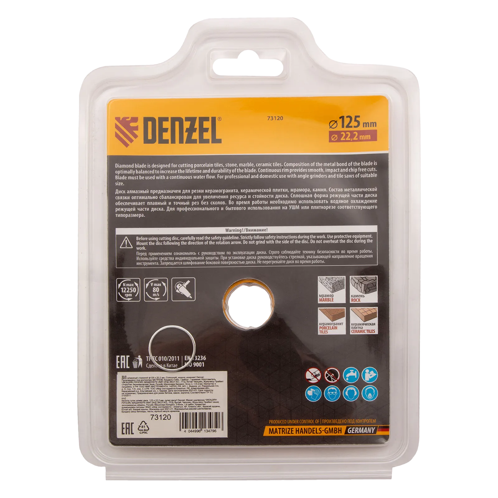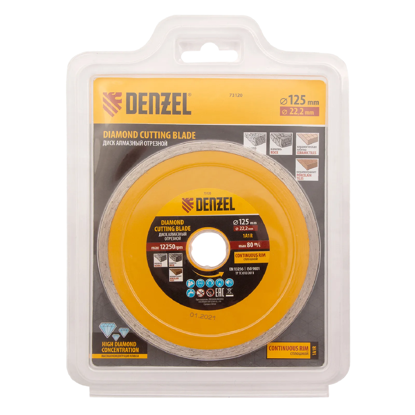 Отрезной алмазный диск Denzel «Сплошной» 73120 диаметром 125 х 22,2 мм используется для «мокрого» резания совместно с углошлифовальной машиной или плиткорезом с соответствующим посадочным диаметром. Режет камень, мрамор, керамогранитную и керамическую плитку. Диск отличается хорошей производительностью за счет высокой скорости реза, поэтому подходит для профессионального применения.
