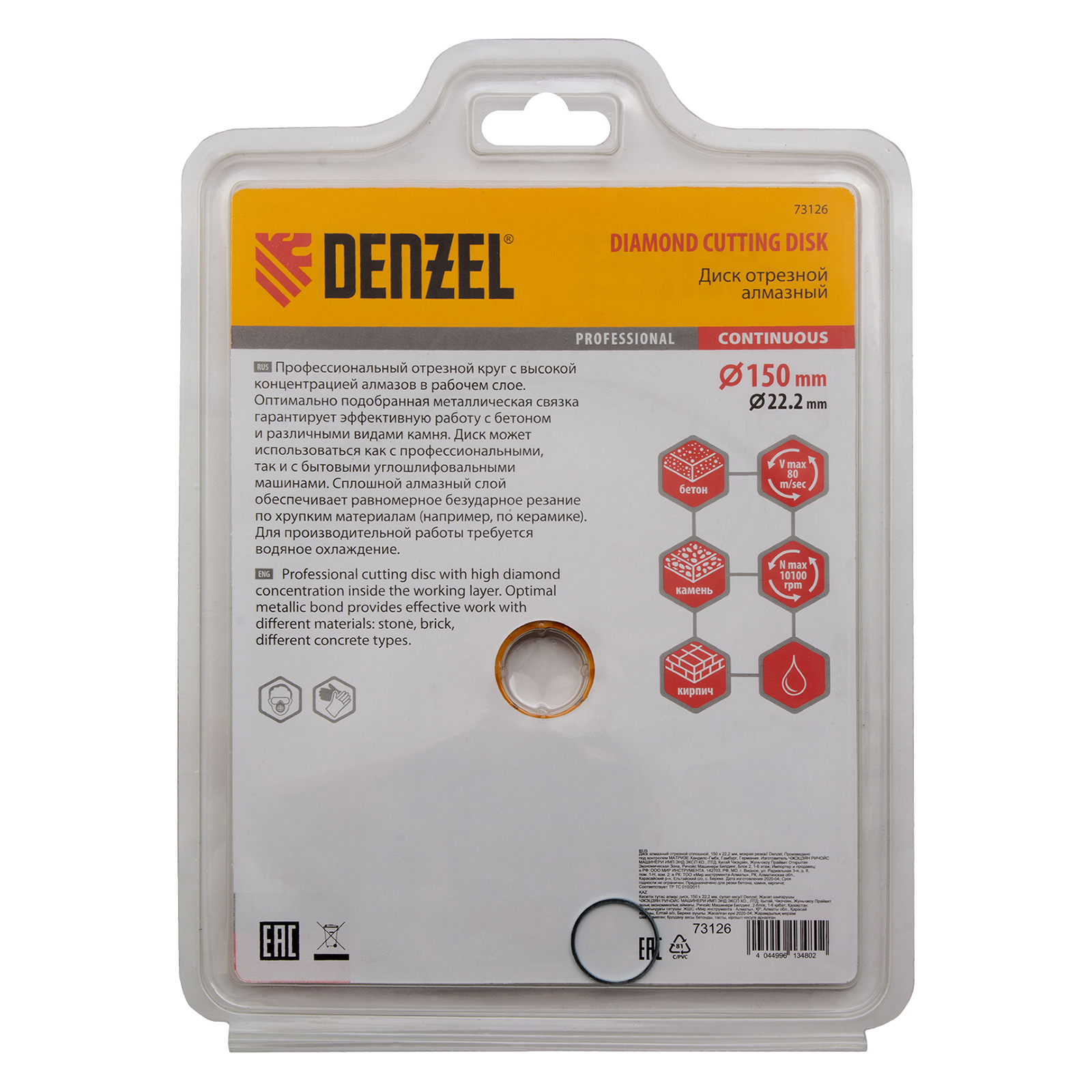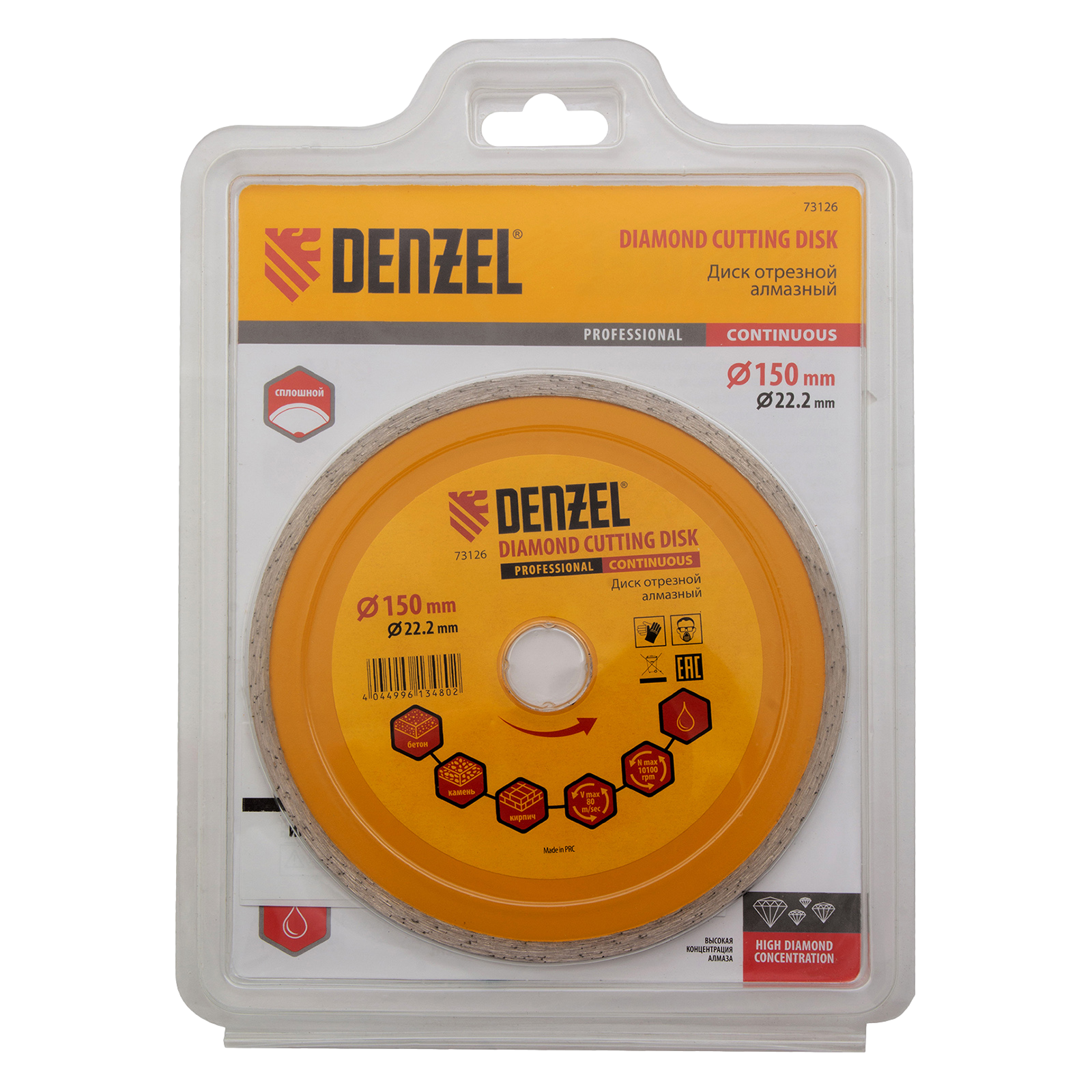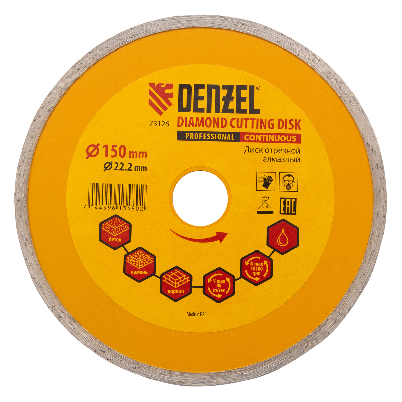 Отрезной алмазный диск Denzel «Сплошной» 73126 диаметром 150 х 22,2 мм используется для «мокрого» резания совместно с углошлифовальной машиной или плиткорезом с соответствующим посадочным диаметром. Режет камень, мрамор, керамогранитную и керамическую плитку. Диск отличается хорошей производительностью за счет высокой скорости реза, поэтому подходит для профессионального применения.