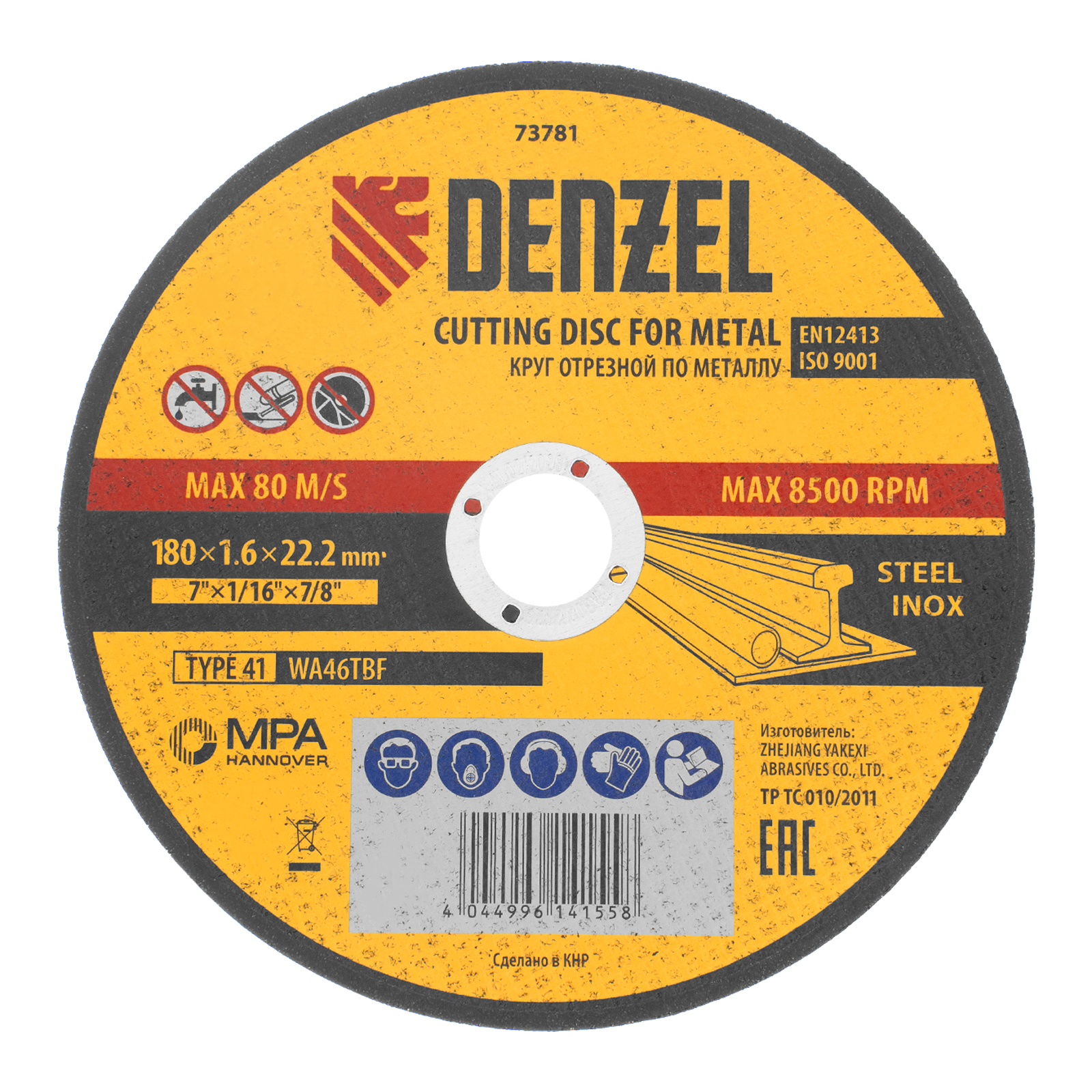 Отрезной круг по металлу Denzel WA46TBF 73781 диаметром 180 мм и толщиной 1,6 мм устанавливается на углошлифовальную машину с посадочным размером 22,2 мм. Предназначен для интенсивного резания углеродистой и нержавеющей стали. Максимальная частота вращения составляет 8500 об/мин. Круг можно использовать не только в быту, но и для решения профессиональных задач.