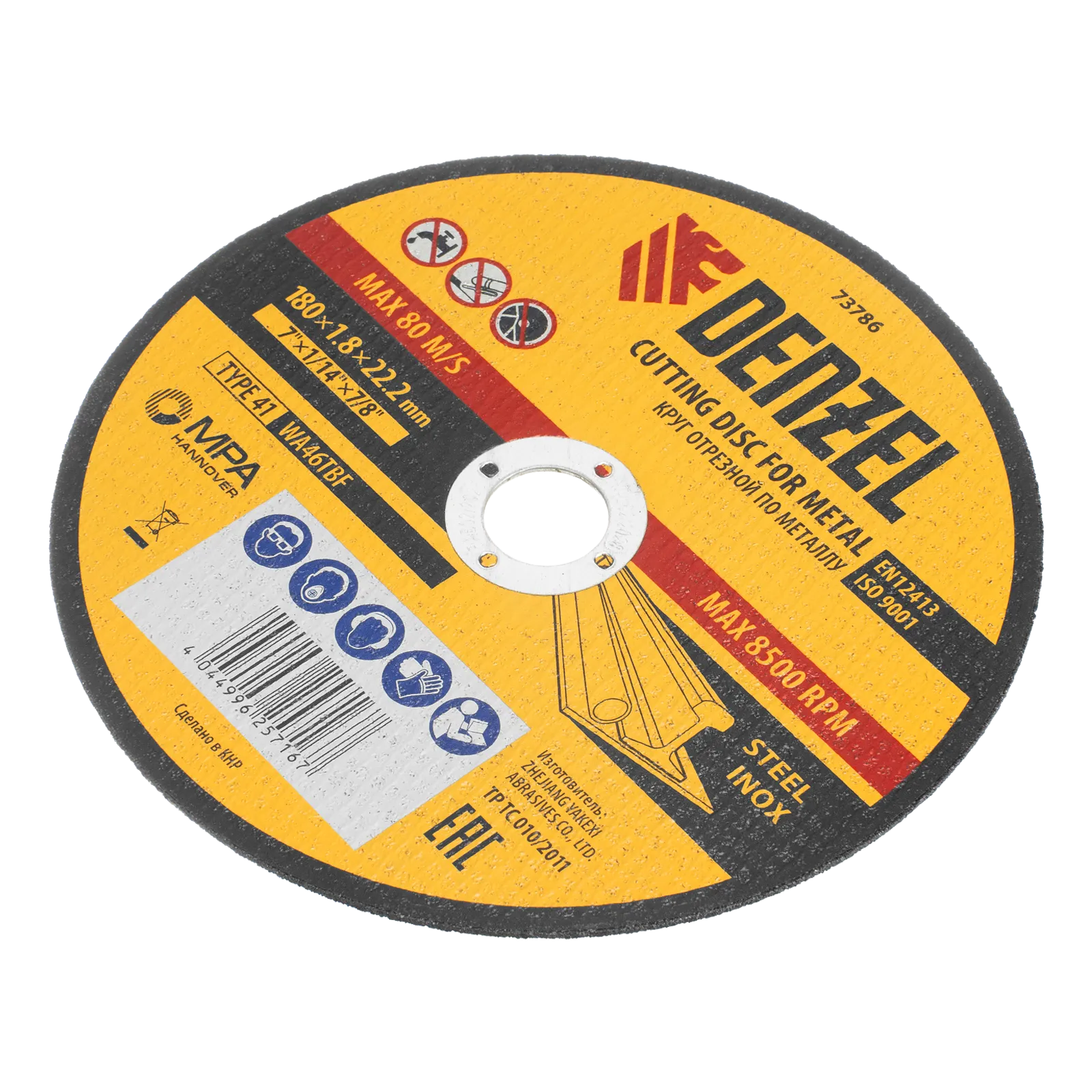 Отрезной круг по металлу Denzel WA46TBF 73786 диаметром 180 мм и толщиной 1,8 мм устанавливается на углошлифовальную машину с посадочным размером 22,2 мм. Предназначен для сухого резания углеродистых и нержавеющих сталей. Максимальная частота вращения составляет 8500 об/мин. Круг пригодится в слесарной мастерской.