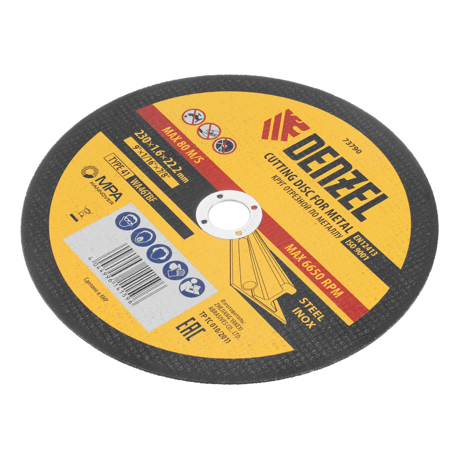 Отрезной круг по металлу Denzel WA46TBF 73790 диаметром 230 мм и толщиной 1,6 мм устанавливается на углошлифовальную машину с посадочным размером 22,2 мм. Предназначен для сухого резания углеродистых и нержавеющих сталей. Максимальная частота вращения составляет 6650 об/мин. Круг пригодится в слесарной мастерской.