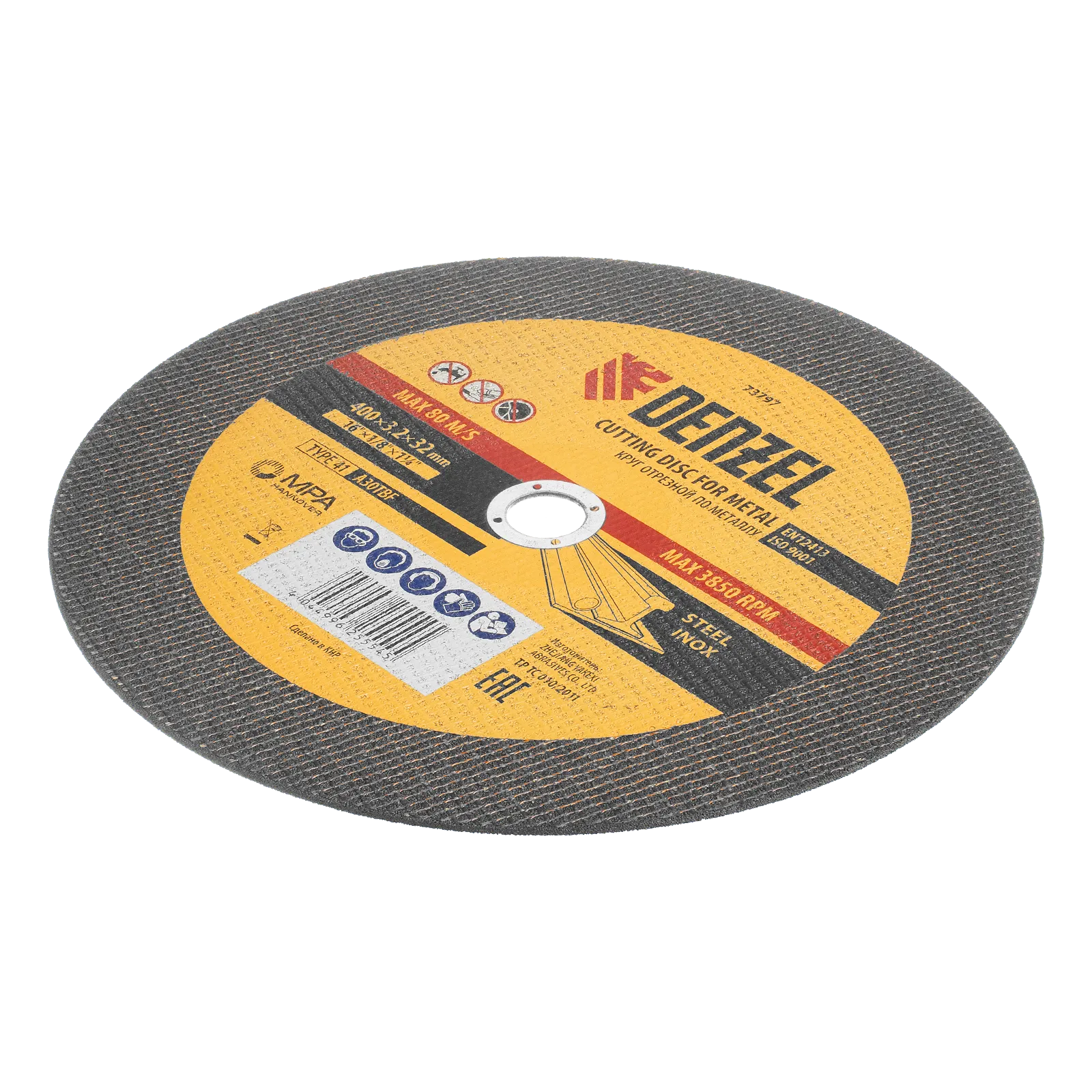 Отрезной круг по металлу Denzel A30TBF 73797 диаметром 400 мм и толщиной 3,2 мм устанавливается на углошлифовальную машину или станок с посадочным размером 32 мм. Предназначен для сухого резания углеродистых и нержавеющих сталей. Максимальная частота вращения составляет 3850 об/мин. Круг пригодится в слесарной мастерской.