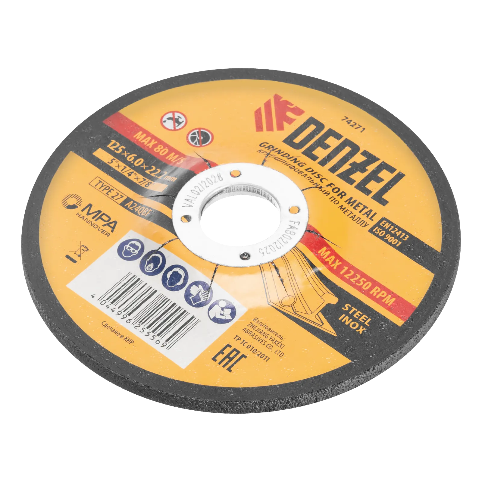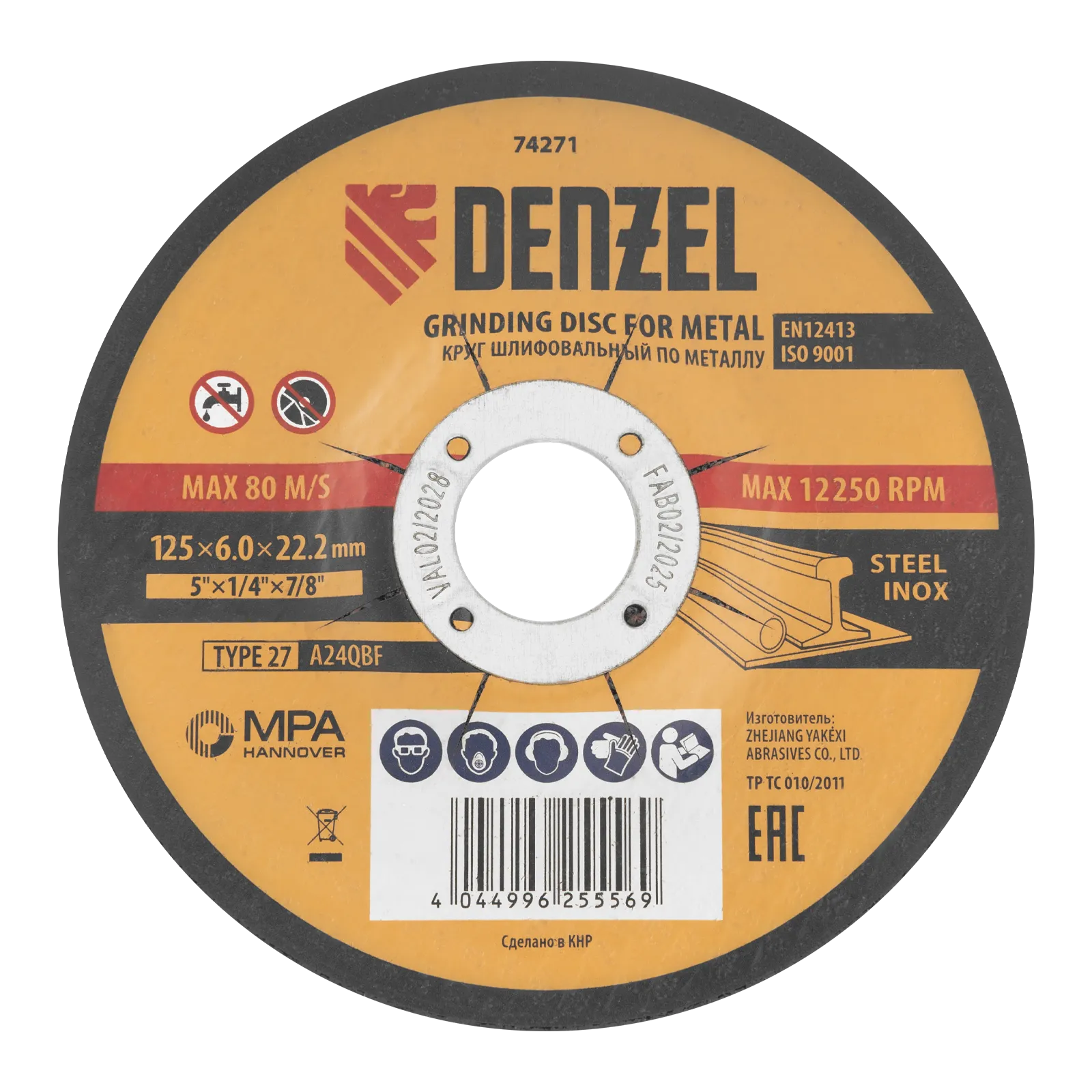 Шлифовальный круг Denzel A24QBF 74271 диаметром 125 мм и толщиной 6,0 мм устанавливается на фланец углошлифовальной машины с посадочным размером 22,2 мм. Максимальная частота вращения составляет 12500 об/мин. Круг предназначен для ручной обработки углеродистых и нержавеющих сталей без использования смазочно-охлаждающих жидкостей. Позволяет эффективно шлифовать поверхности, зачищать сварные швы и кромки после реза, удалять заусенцы, окалину и прочие дефекты. Круг пригодится в слесарной мастерской.