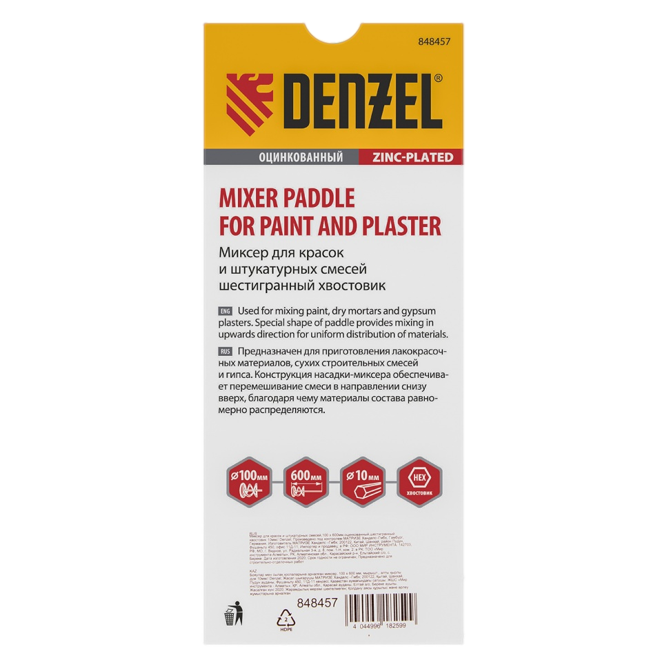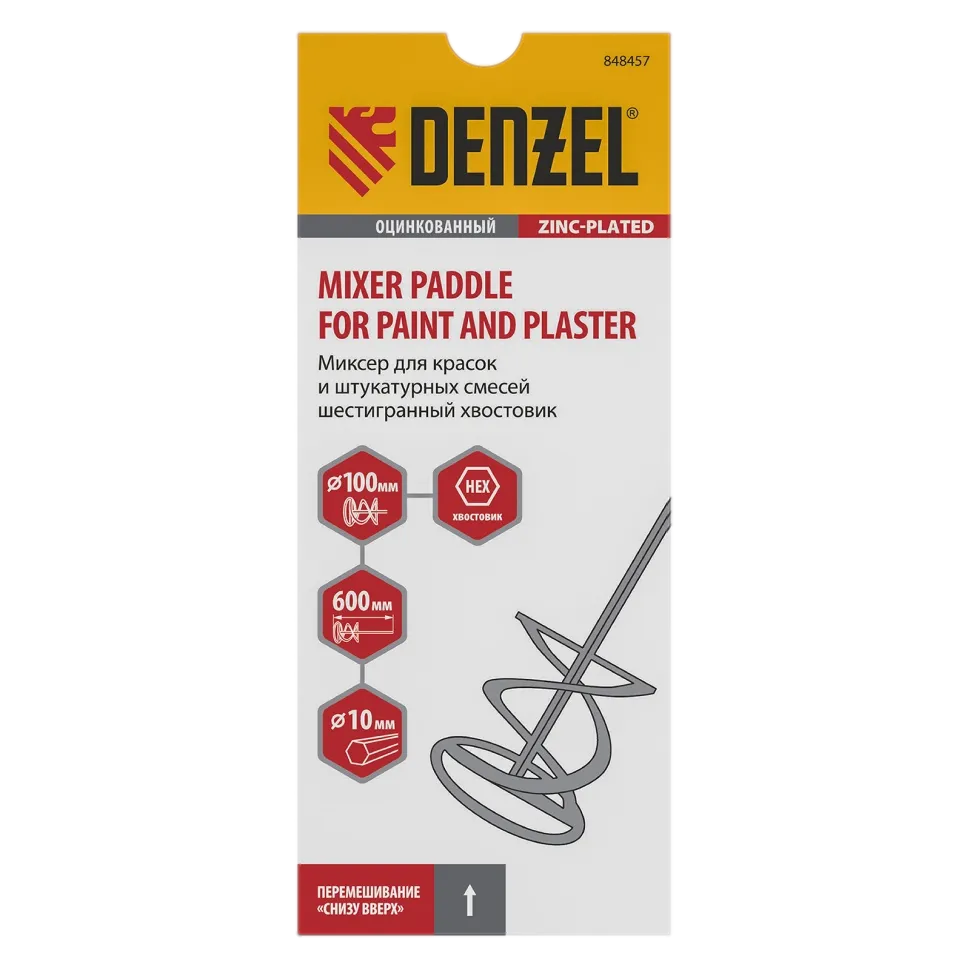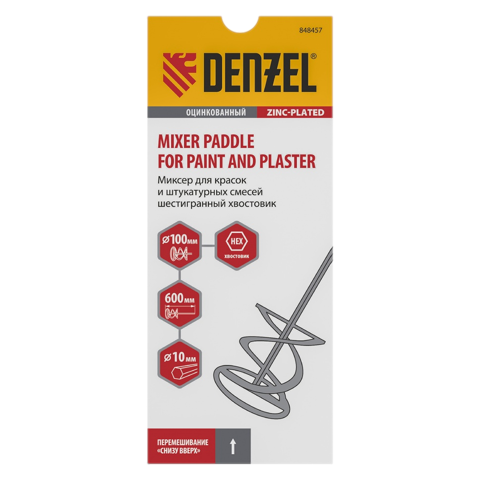 Оцинкованный миксер для красок и штукатурных смесей Denzel 848457 длиной 600 мм, с шестигранным хвостовиком 10 мм, имеет венчик диаметром 100 мм и используется для приготовления строительных растворов. Насадка перемешивает состав снизу вверх, что позволяет добиться полной однородности готовой смеси. Защитное кольцо предотвращает повреждение емкости, в которой готовится раствор. Миксер пригодится во время строительства и ремонта.