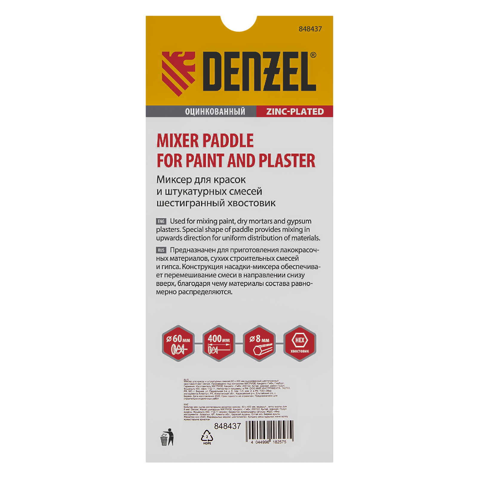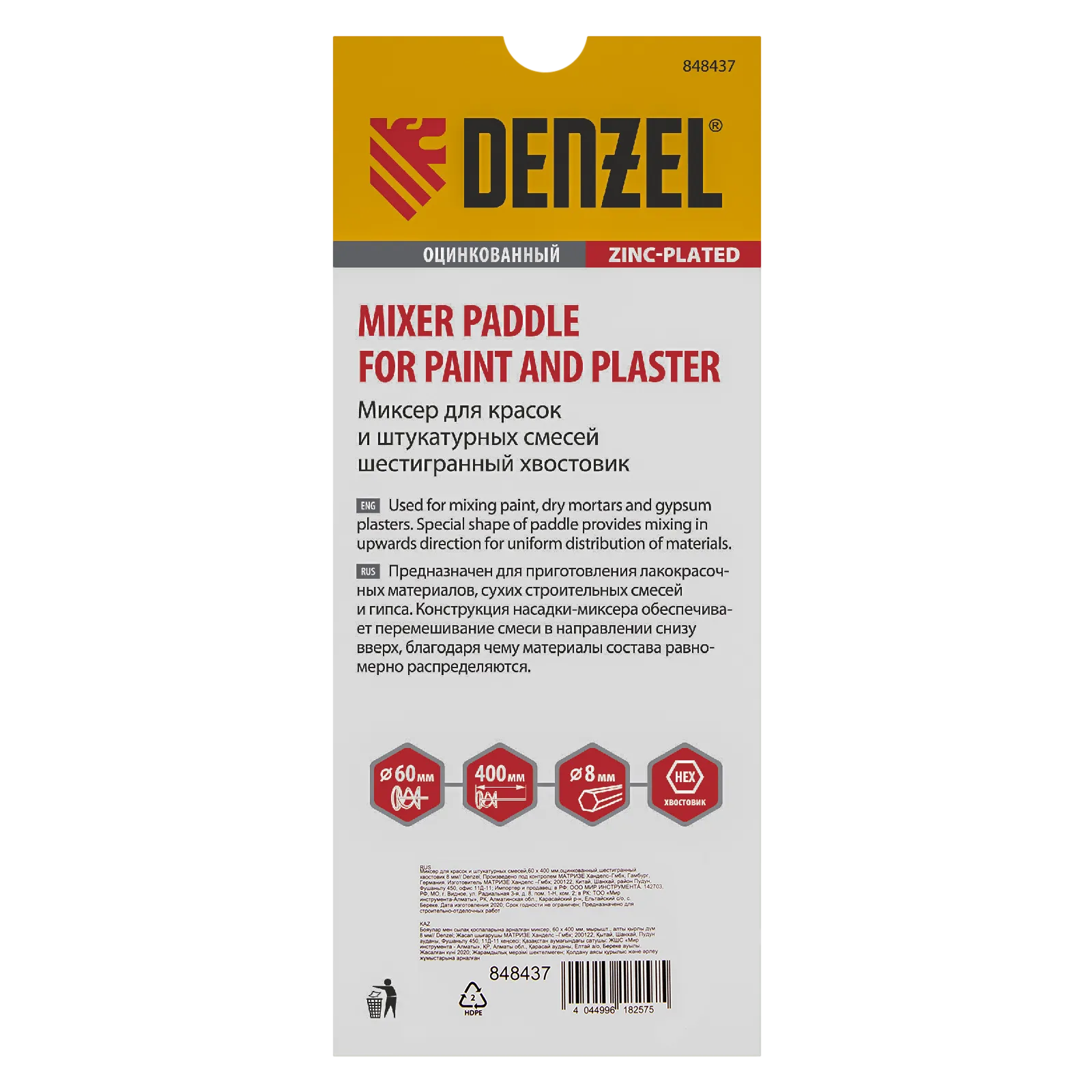 Оцинкованный миксер для красок и штукатурных смесей Denzel 848437 длиной 400 мм, с шестигранным хвостовиком 8 мм, имеет венчик диаметром 60 мм и используется для приготовления строительных растворов. Насадка перемешивает состав снизу вверх, что позволяет добиться полной однородности готовой смеси. Защитное кольцо предотвращает повреждение емкости, в которой готовится раствор. Миксер пригодится во время строительства и ремонта.