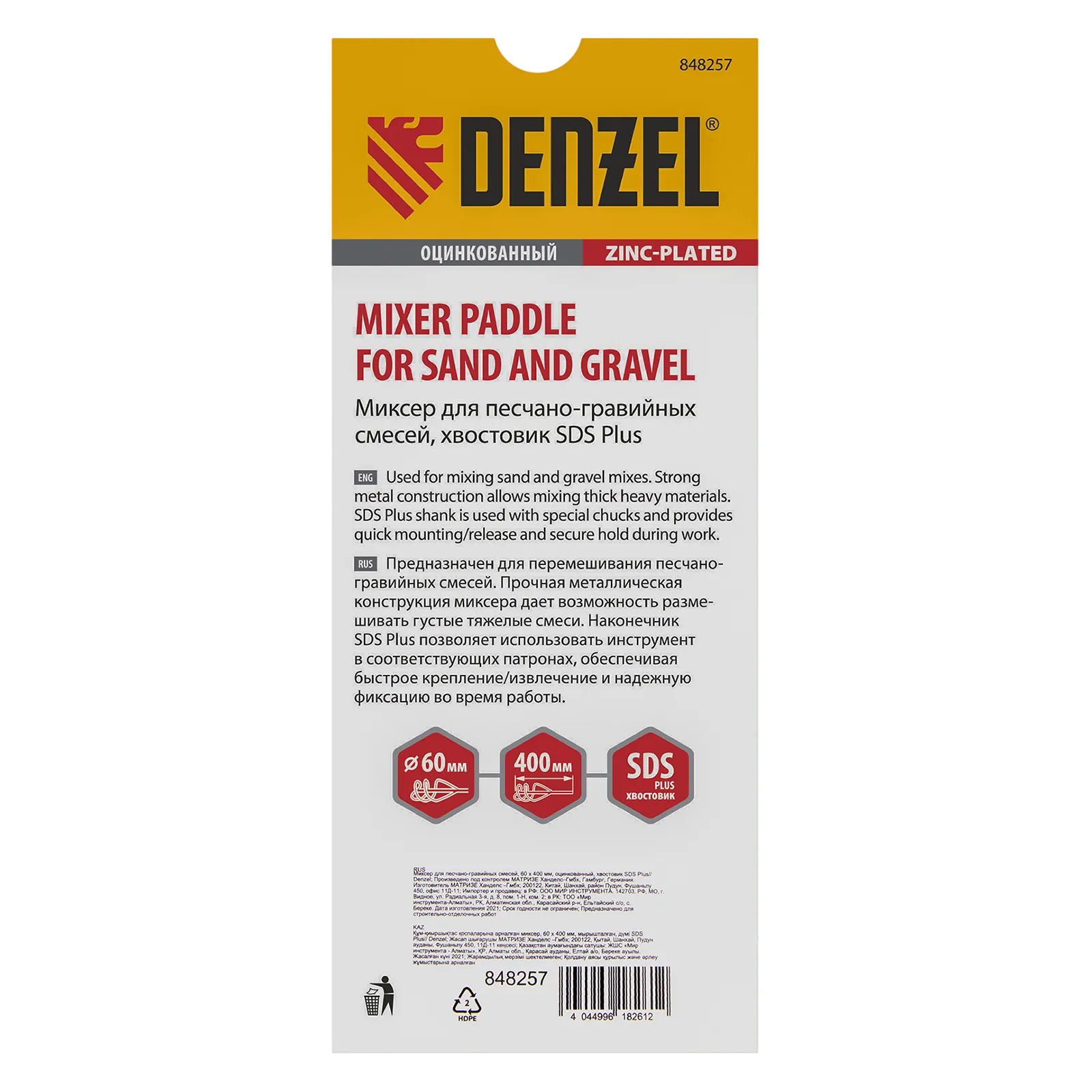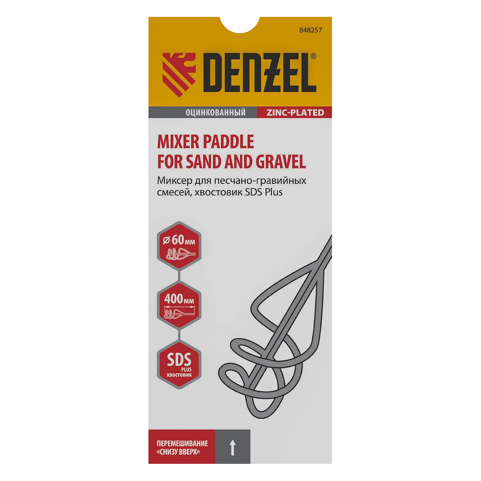 Оцинкованный миксер Denzel 848257 диаметром 60 мм и длиной 400 мм, с хвостовиком SDS-plus, используется во время строительства и ремонта для перемешивания песчано-гравийных и других тяжелых смесей. Вращающаяся спираль движется по часовой стрелке, поднимая тяжелые частицы вверх и придавая однородность размешиваемому составу. Миксер SDS-plus совместим с перфораторами средней и высокой мощности.