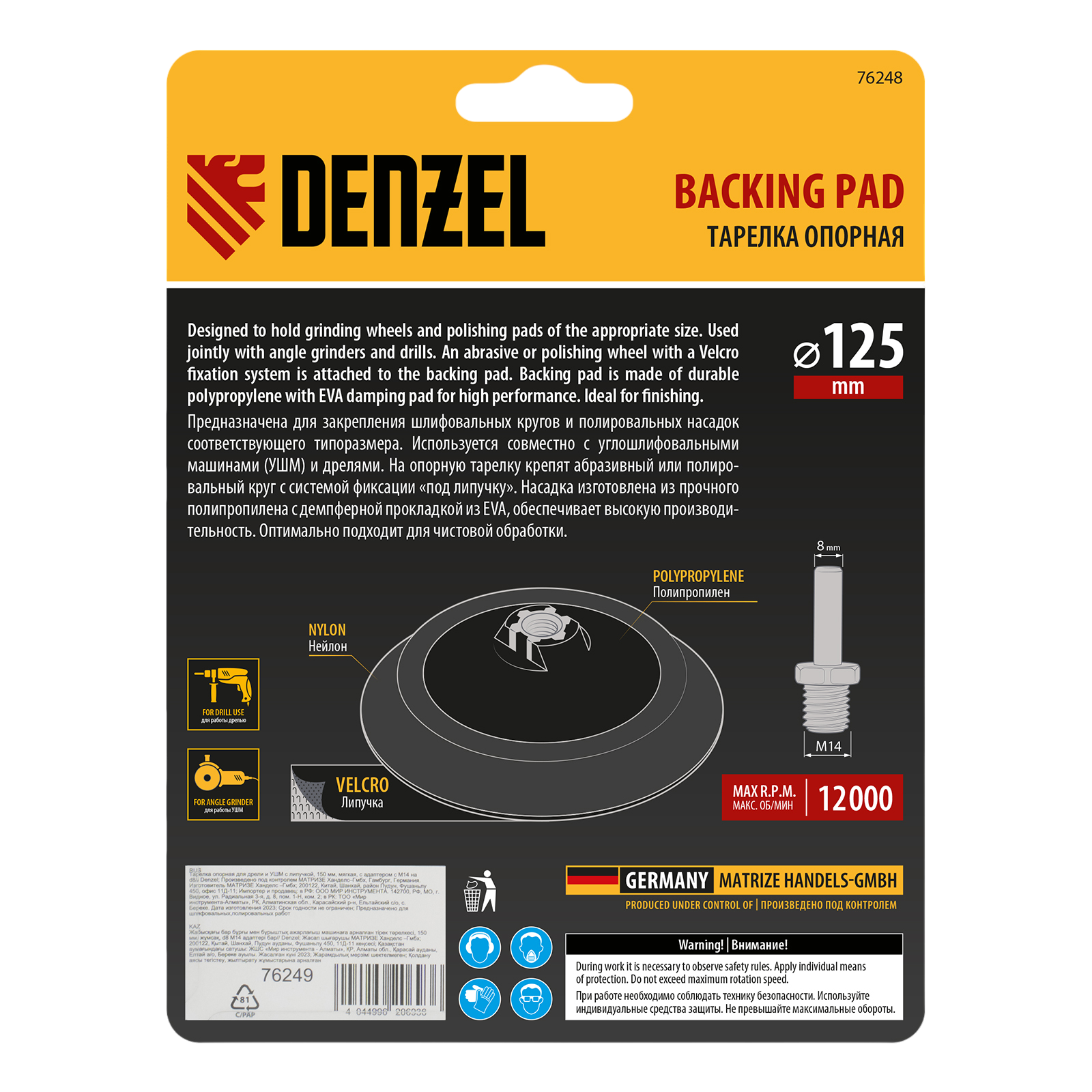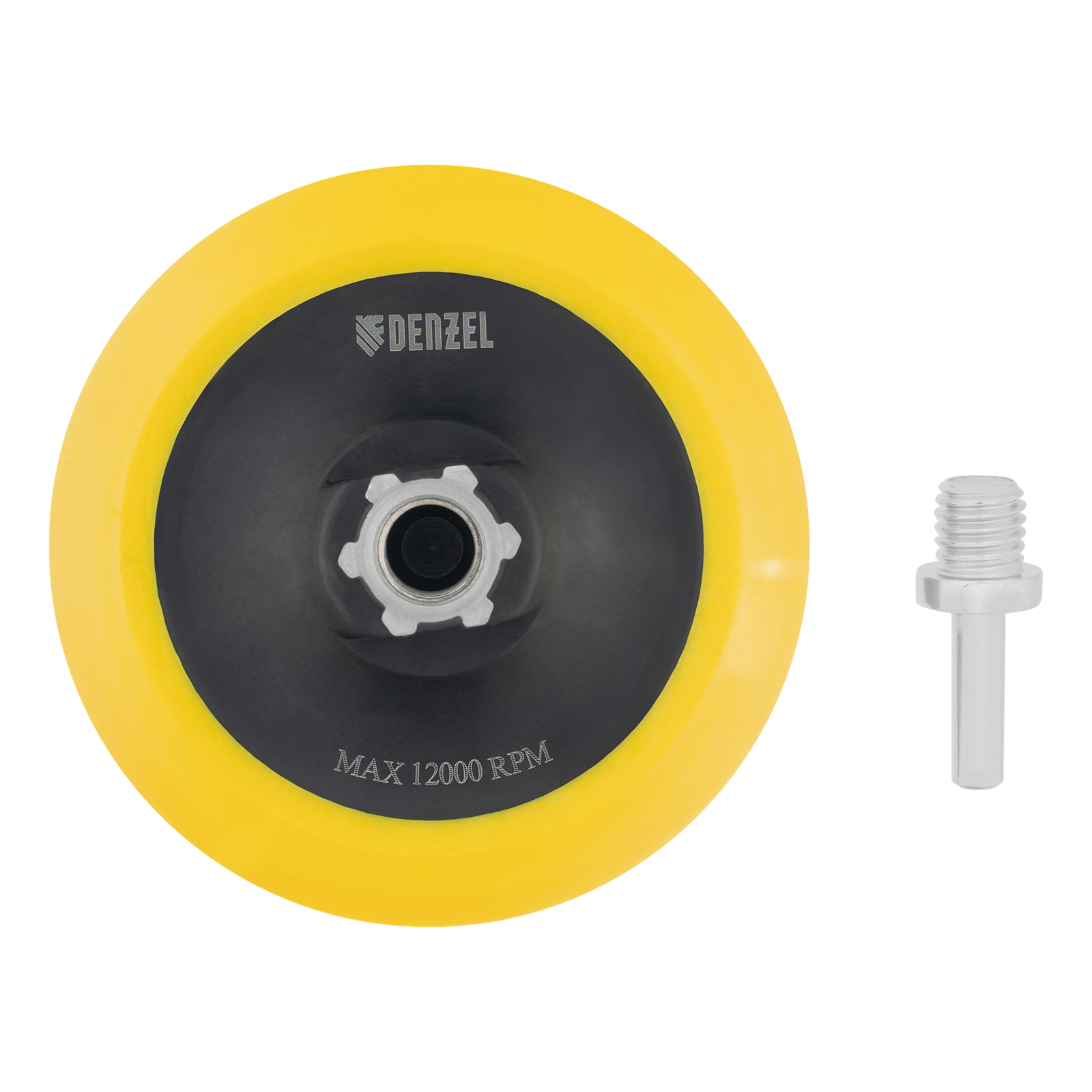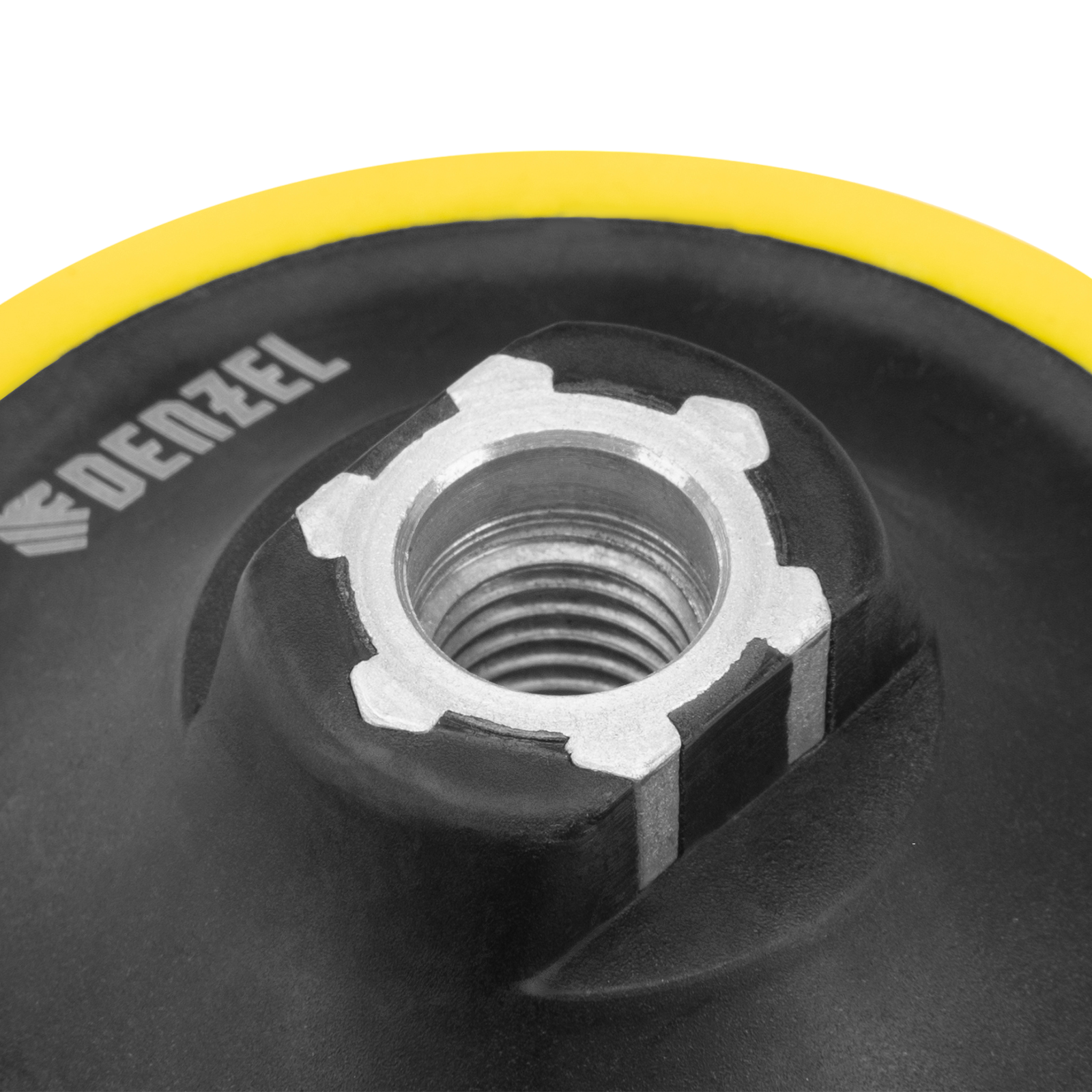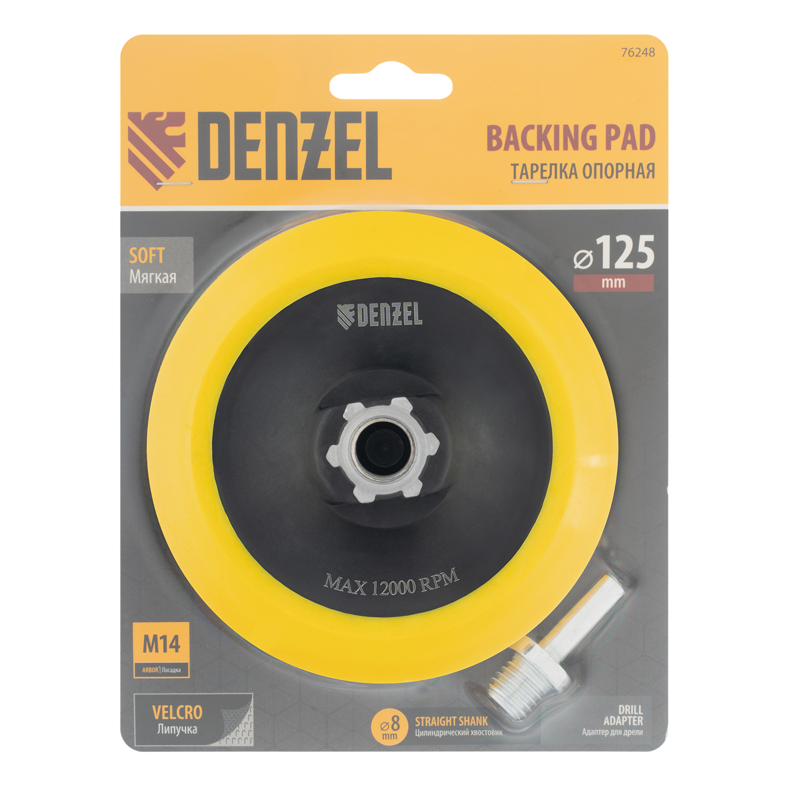 Тарелка опорная Denzel 76248 диаметром 125 мм, с липучкой и адаптером с М14 на d8, мягкая, устанавливается на дрель или углошлифовальную машину (УШМ). Используется для крепления абразивных или полировальных кругов на ворсовой основе, позволяет подготовить поверхность для дальнейшей обработки или придать ей финишную гладкость.