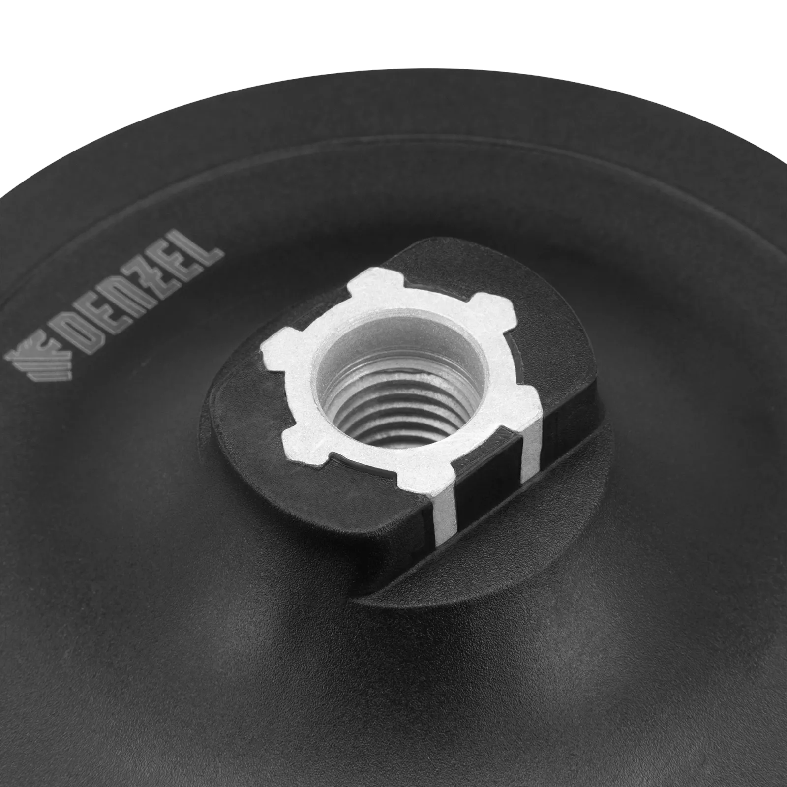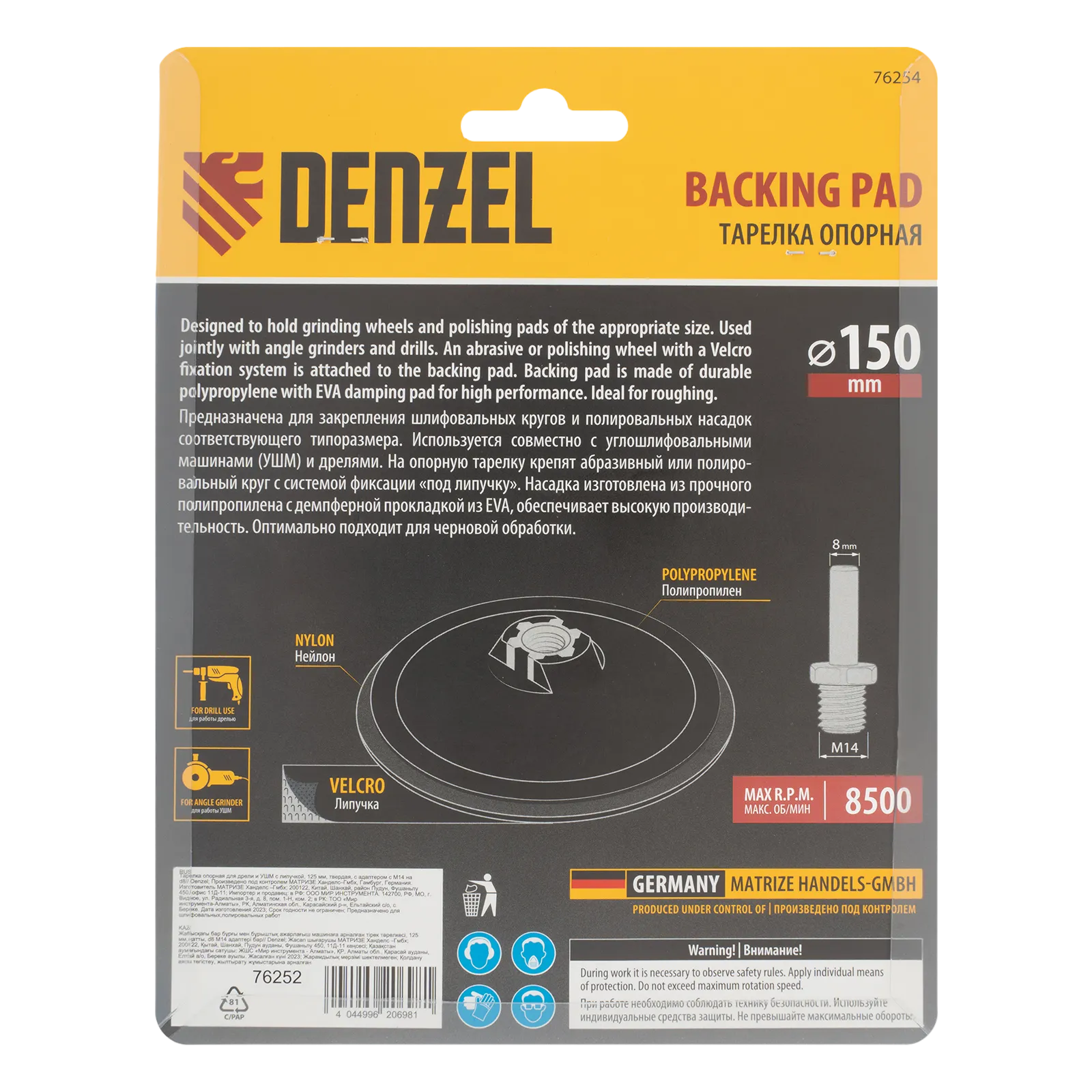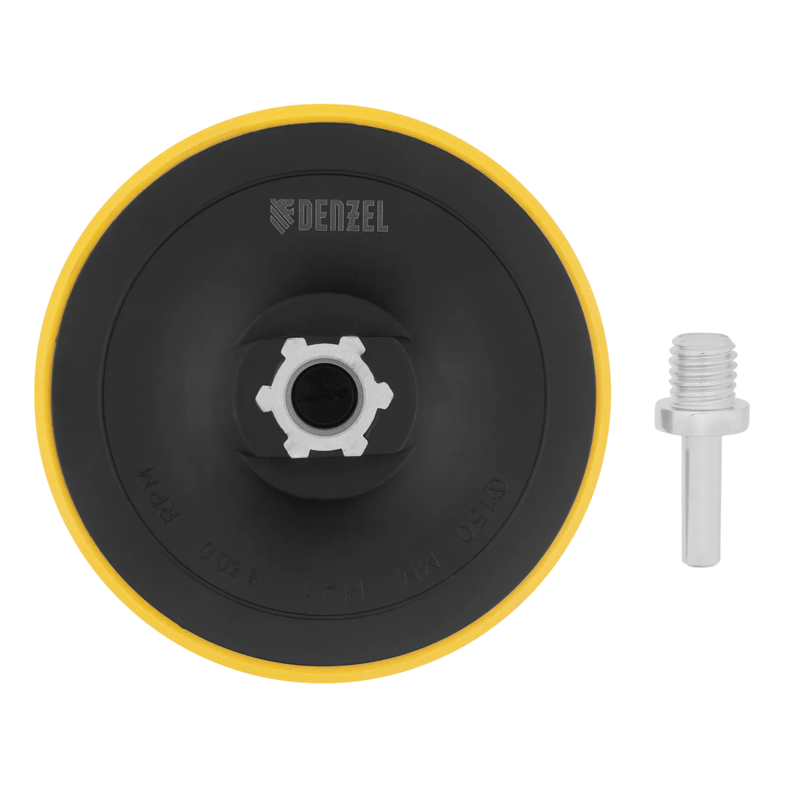 Тарелка опорная Denzel 76252 диаметром 150 мм, с липучкой и адаптером с М14 на d8, стандартная, устанавливается на дрель или углошлифовальную машину (УШМ). Используется для крепления абразивных или полировальных кругов на ворсовой основе, позволяет подготовить поверхность для дальнейшей обработки или придать ей финишную гладкость.