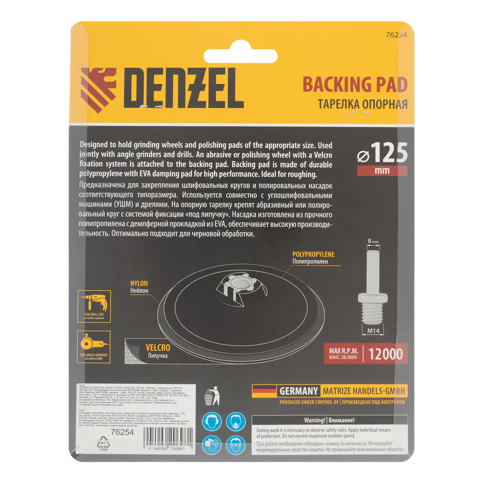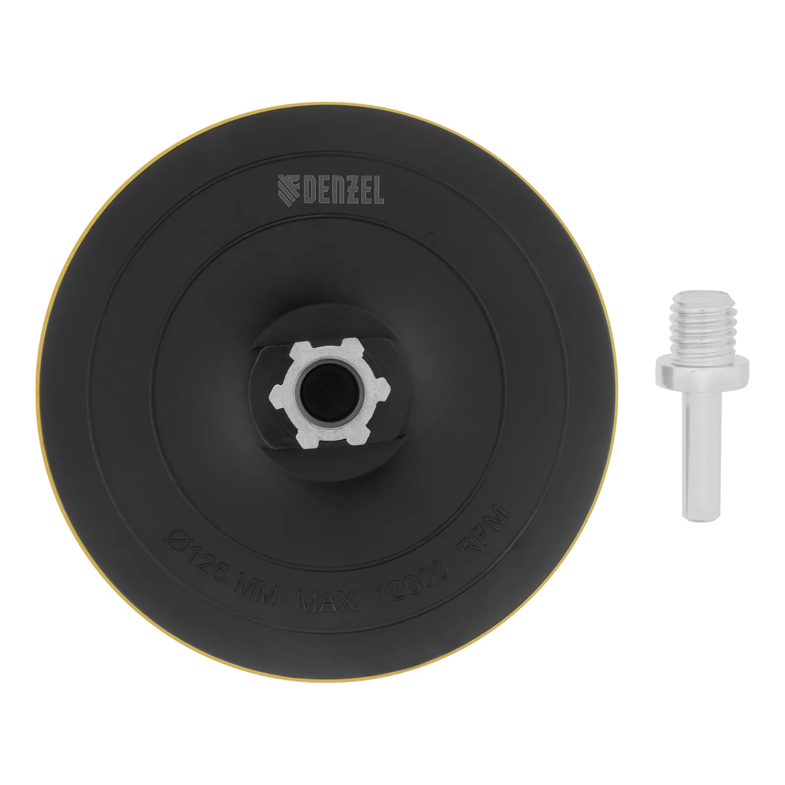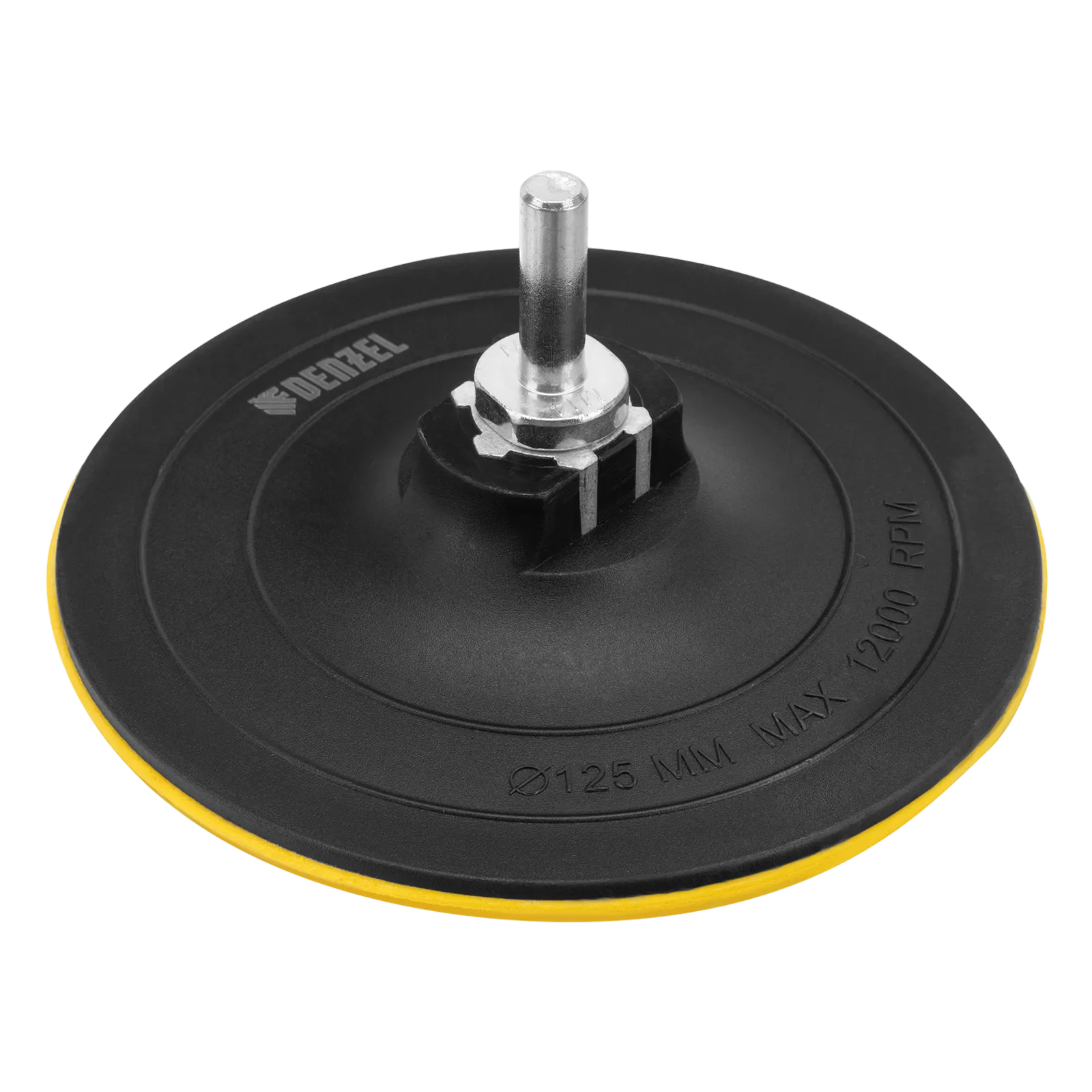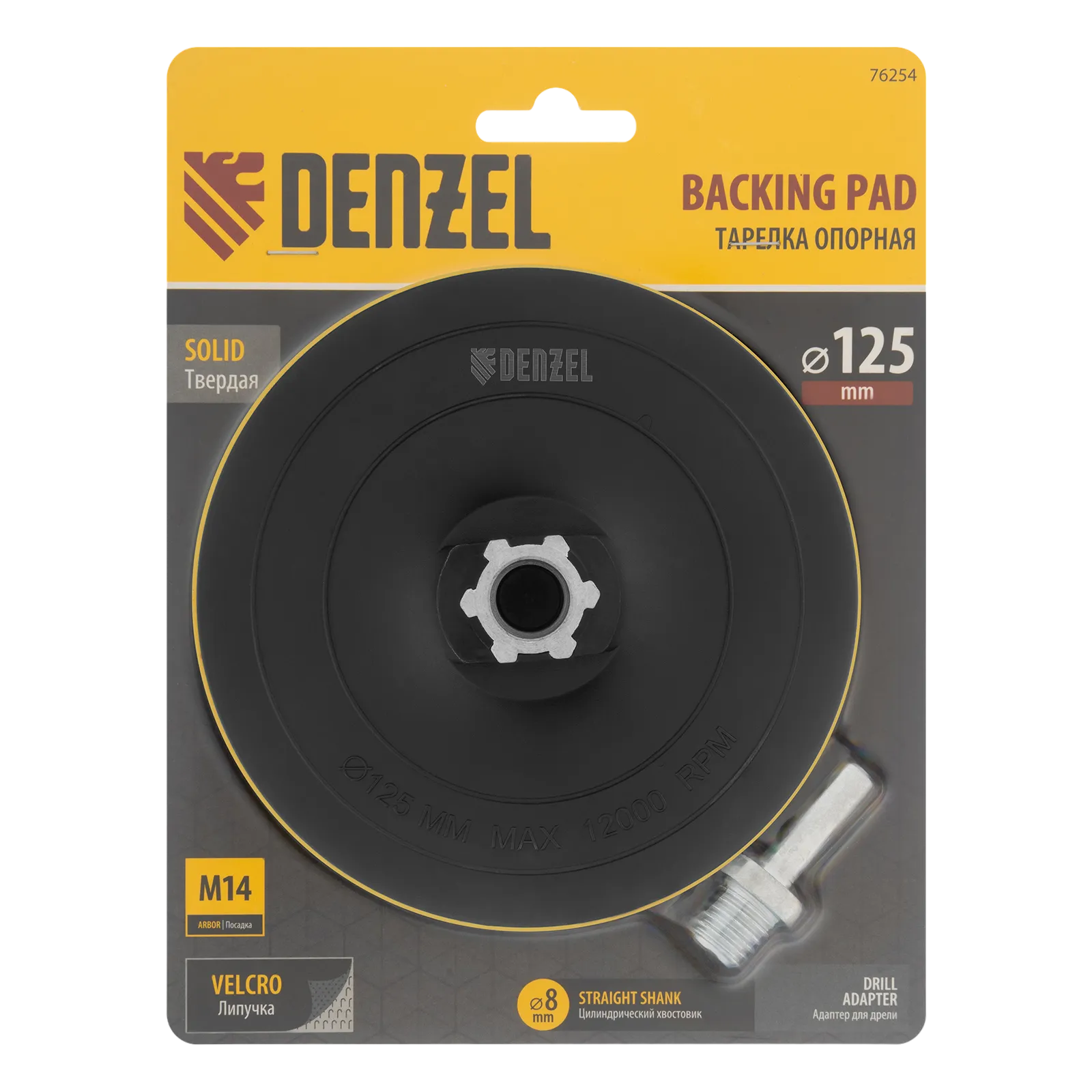 Тарелка опорная Denzel 76254 диаметром 125 мм, с липучкой и адаптером с М14 на d8, твердая, устанавливается на дрель или углошлифовальную машину (УШМ). Используется для крепления абразивных или полировальных кругов на ворсовой основе, позволяет подготовить поверхность для дальнейшей обработки или придать ей финишную гладкость.