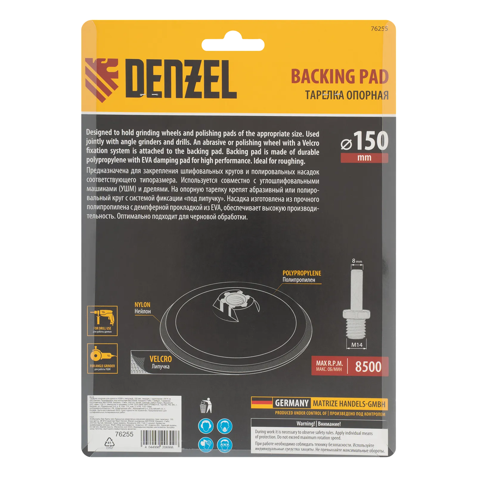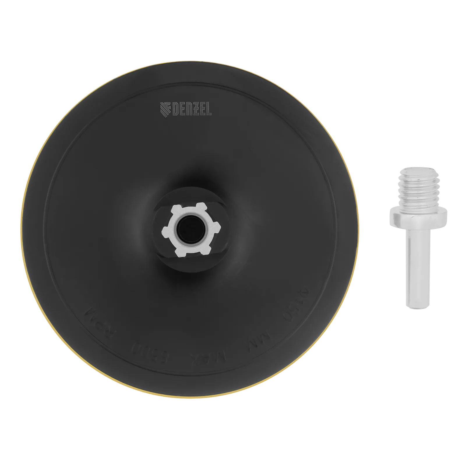 Тарелка опорная Denzel 76255 диаметром 150 мм, с липучкой и адаптером с М14 на d8, твердая, устанавливается на дрель или углошлифовальную машину (УШМ). Используется для крепления абразивных или полировальных кругов на ворсовой основе, позволяет подготовить поверхность для дальнейшей обработки или придать ей финишную гладкость.