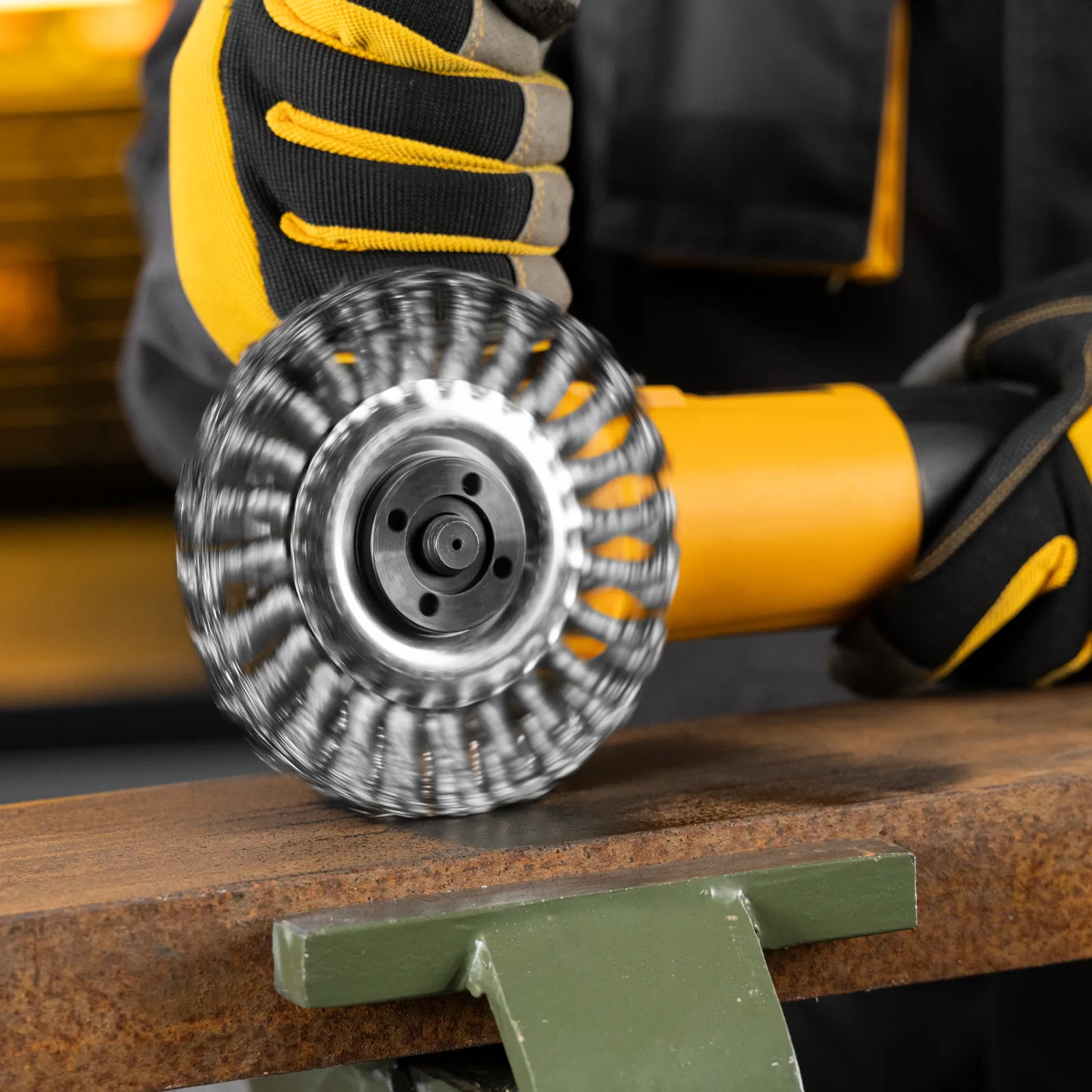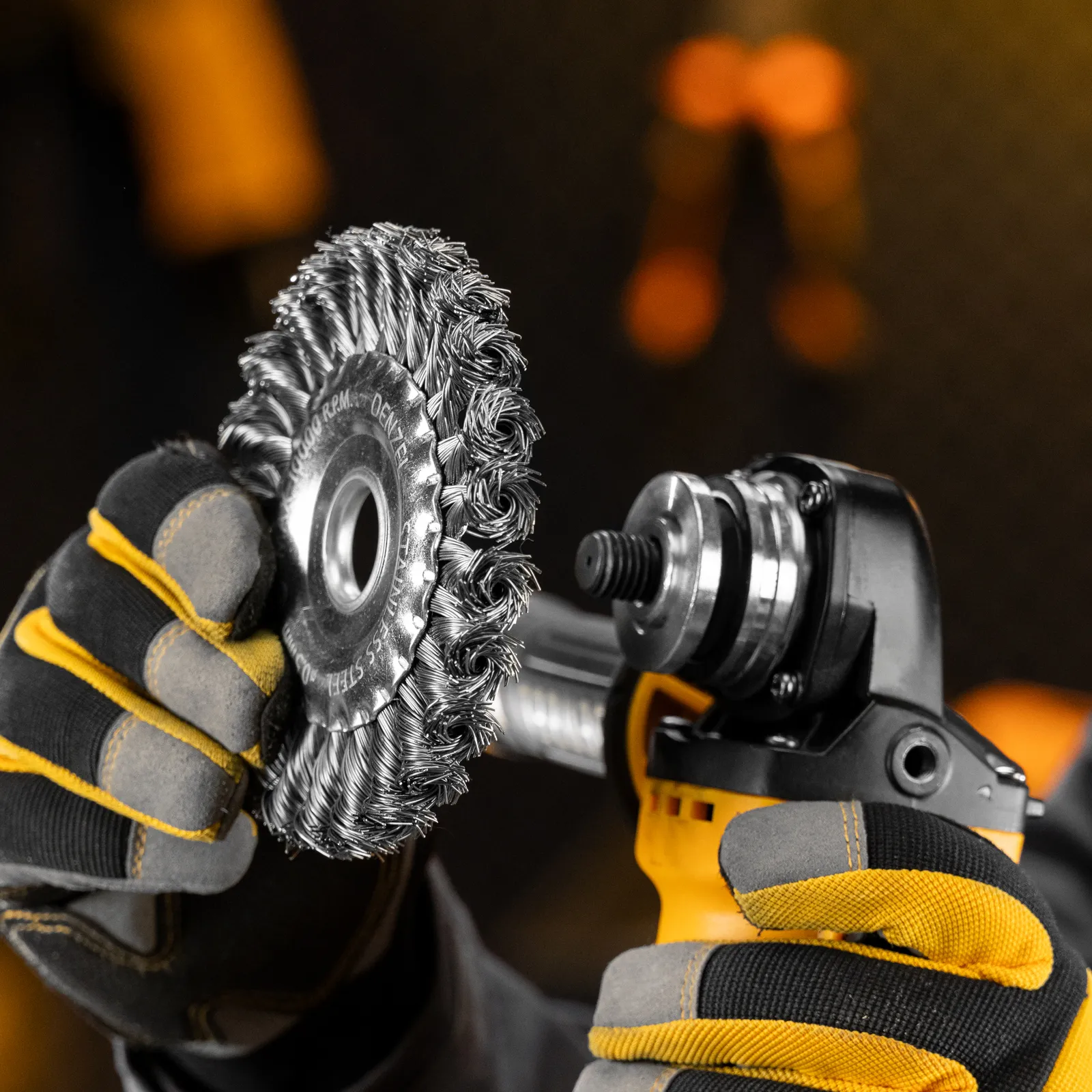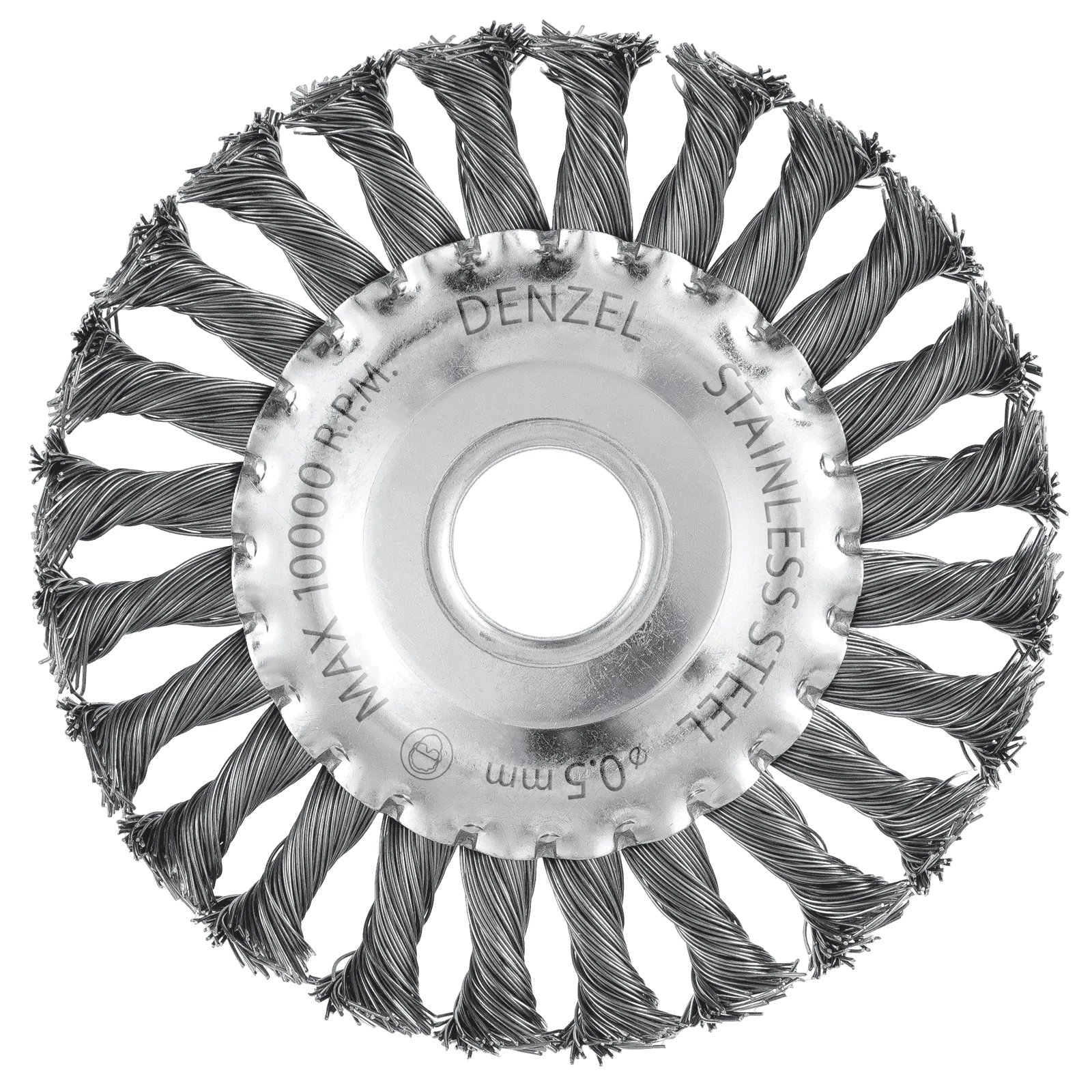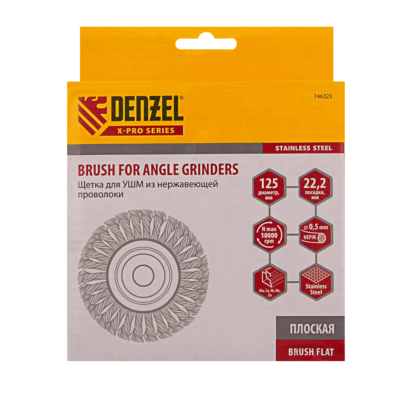 Плоская щетка для УШМ Denzel 746323 диаметром 125 мм, с посадкой 22,2 мм, с щетиной из крученой нержавеющей проволоки 0,5 мм, предназначена для снятия толстого верхнего слоя с металлических, деревянных, бетонных поверхностей. Удаляет загрязнения, ржавчину, старые лакокрасочные покрытия, заусенцы, окалину с ровных поверхностей и в труднодоступных местах. Оптимальна для обработки изделий из нержавеющей стали, а также зачистки сварных швов. Щетку устанавливают на фланец углошлифовальной машины, что удобно для выполнения большого объема работ, не требующих частой смены насадок. Рекомендуемая максимальная скорость вращения 10000 об/мин. Во время работы обязательно использование средств индивидуальной защиты. Щетка будет полезна на строительной площадке, производственном предприятии, а также пригодится в быту.