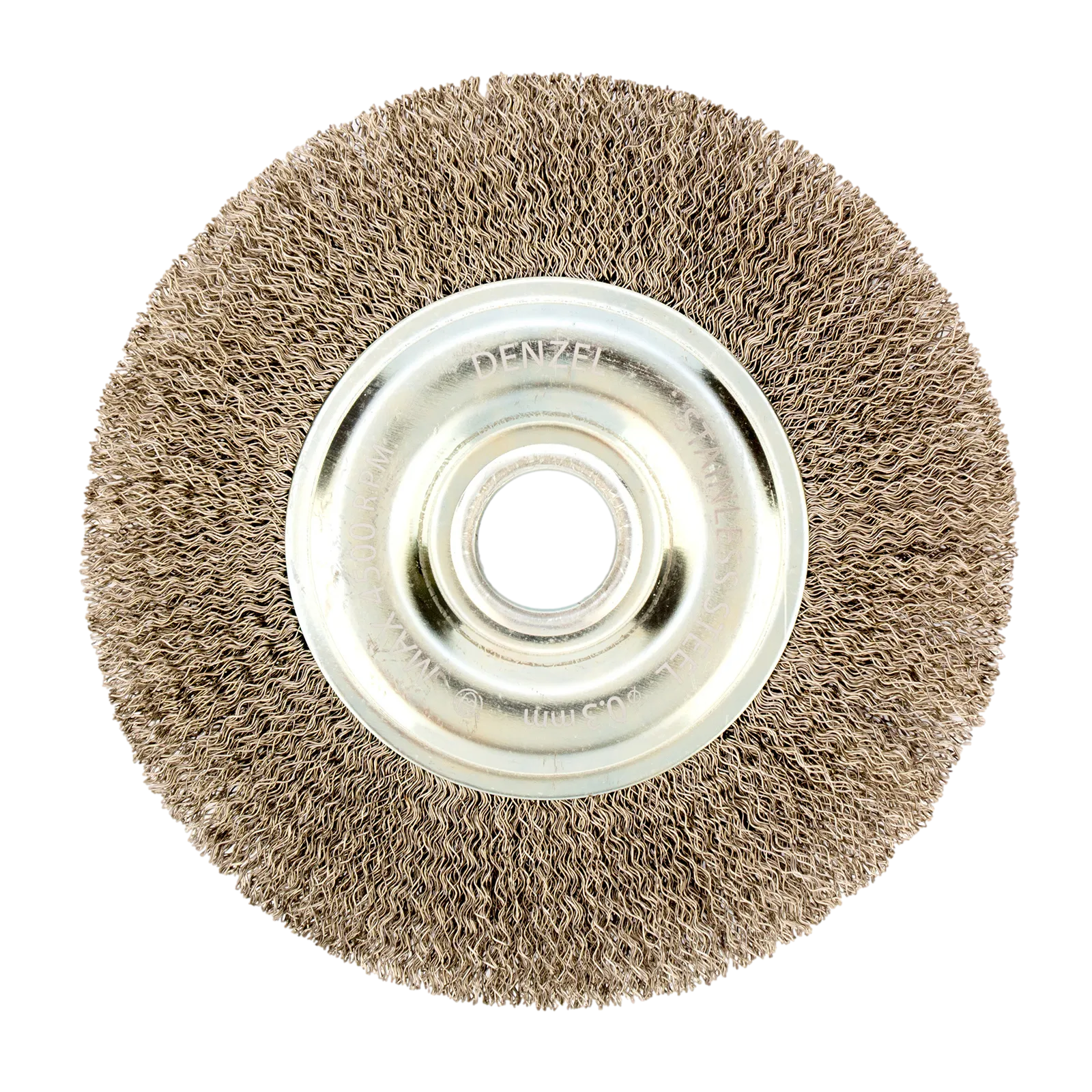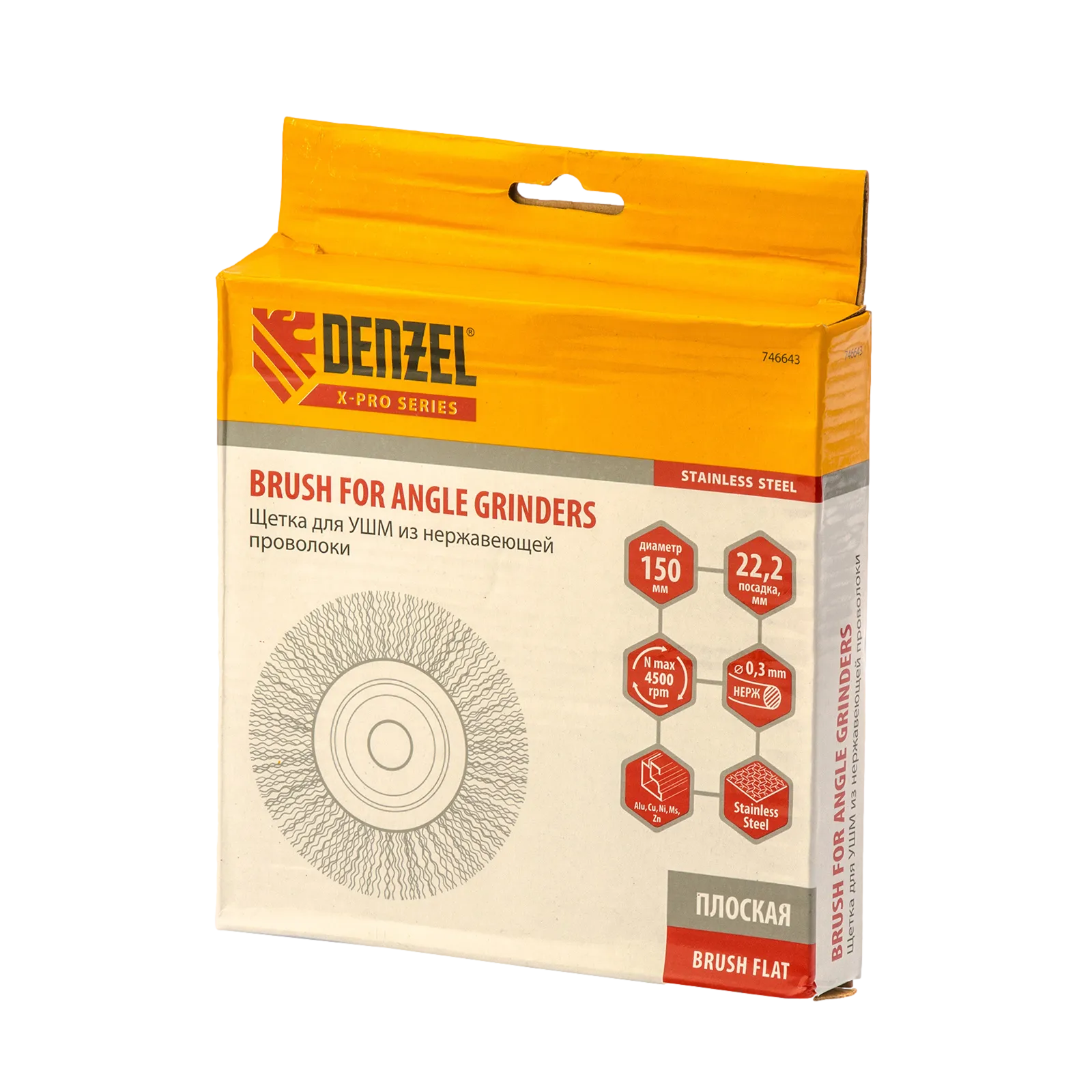 Плоская щетка для УШМ Denzel 746643 диаметром 150 мм, с щетиной из витой нержавеющей проволоки 0,3 мм, с посадкой 22,2 мм, постепенно снимает тонкий слой материала, поэтому ее используют для щадящей обработки металлических, деревянных, пластиковых поверхностей, а также изделий из нержавеющей стали. Щетка удаляет ржавчину, загрязнения, остатки лакокрасочных покрытий из труднодоступных мест, пазов и углов. Оснастка с посадкой 22,2 мм устанавливается на фланец углошлифовальной машины, что удобно для длительной работы без смены насадок. Рекомендуемая максимальная скорость вращения составляет 4500 об/мин. Во время работы следует использовать средства индивидуальной защиты. Щетку применяют в строительстве, машиностроении, а также в быту.