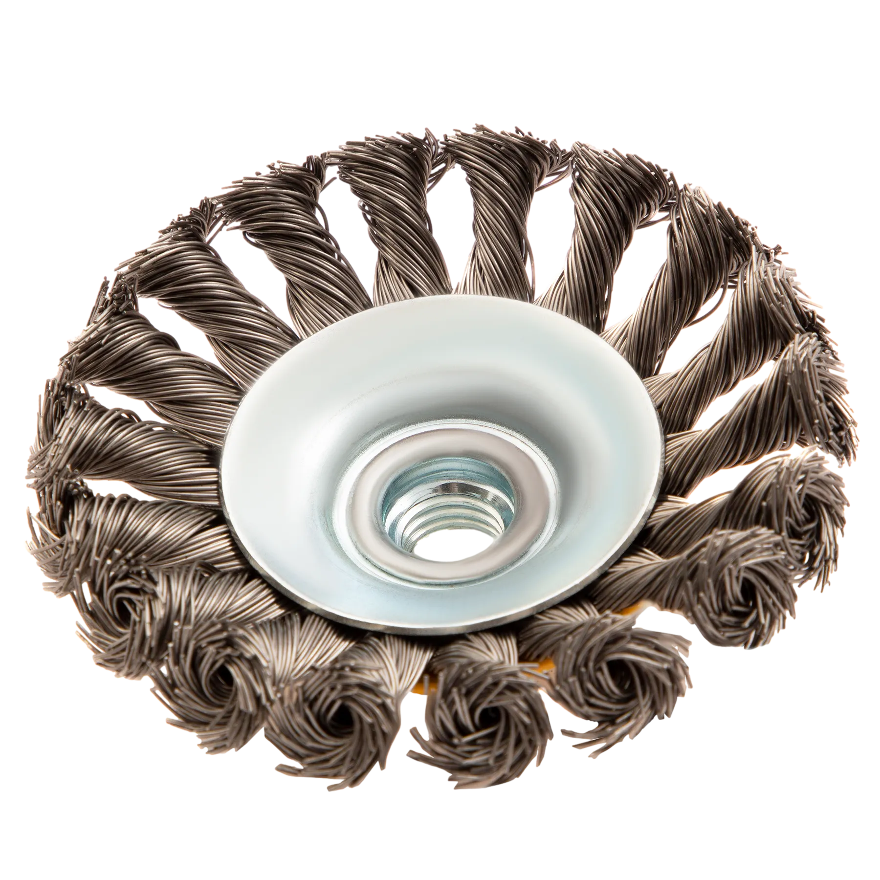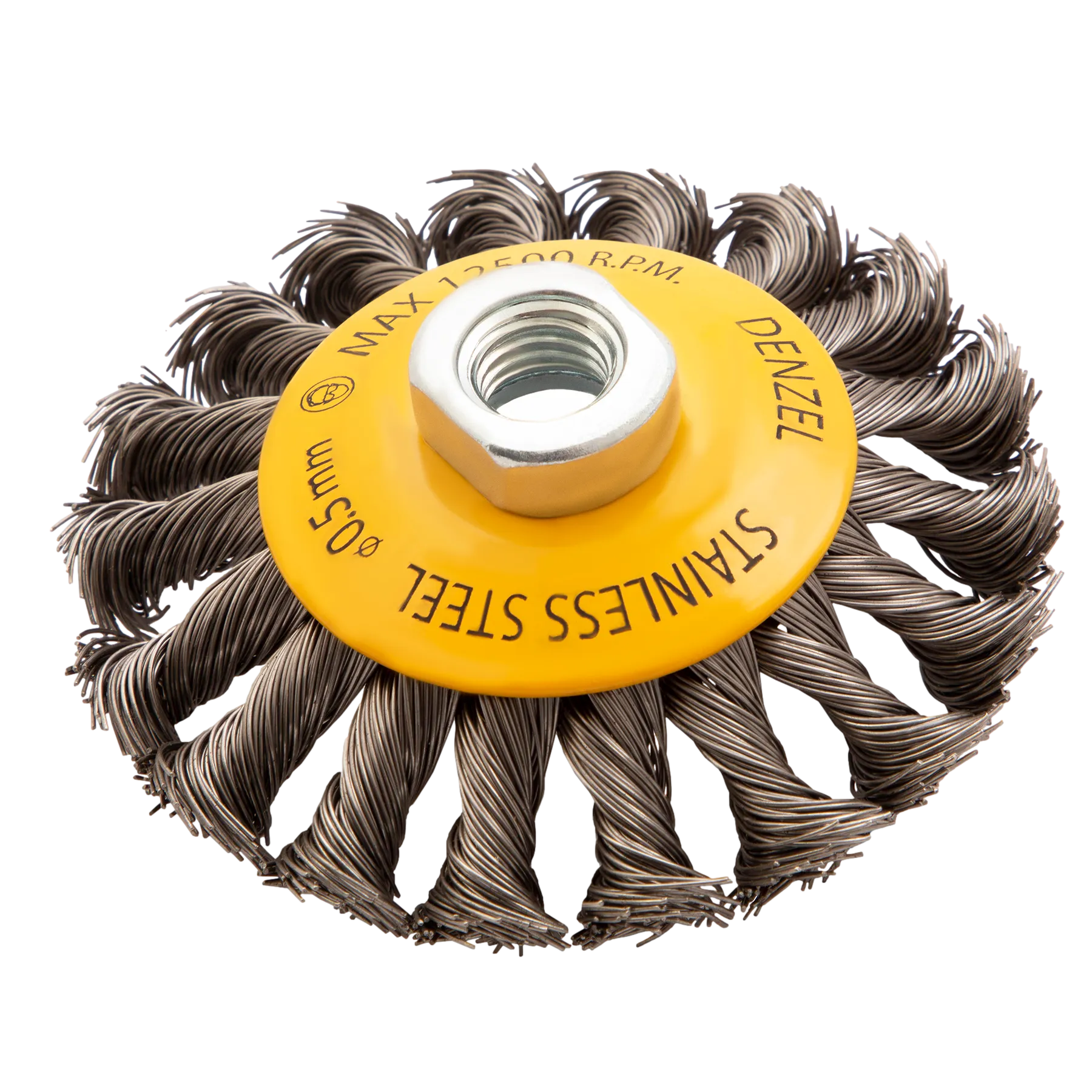 Щетка для УШМ Denzel «Тарелка» 746093, 100 мм, М14, с щетиной из крученой нержавеющей проволоки 0,5 мм, предназначена для снятия толстого слоя краски, лака, ржавчины, для удаления заусенцев и окалины, зачистки сварных швов. Щеткой обрабатывают твердые, преимущественно металлические поверхности, в том числе из нержавеющей стали. Она удобна для очистки как плоских изделий, так и внутренних углов, пазов, изгибов. Щетка совместима с углошлифовальными машинами, поддерживающими работу на скорости до 12500 об/мин. Во время работы необходимо использовать средства индивидуальной защиты. Щетка пригодится во время строительства, на производстве, а также будет полезна в быту.