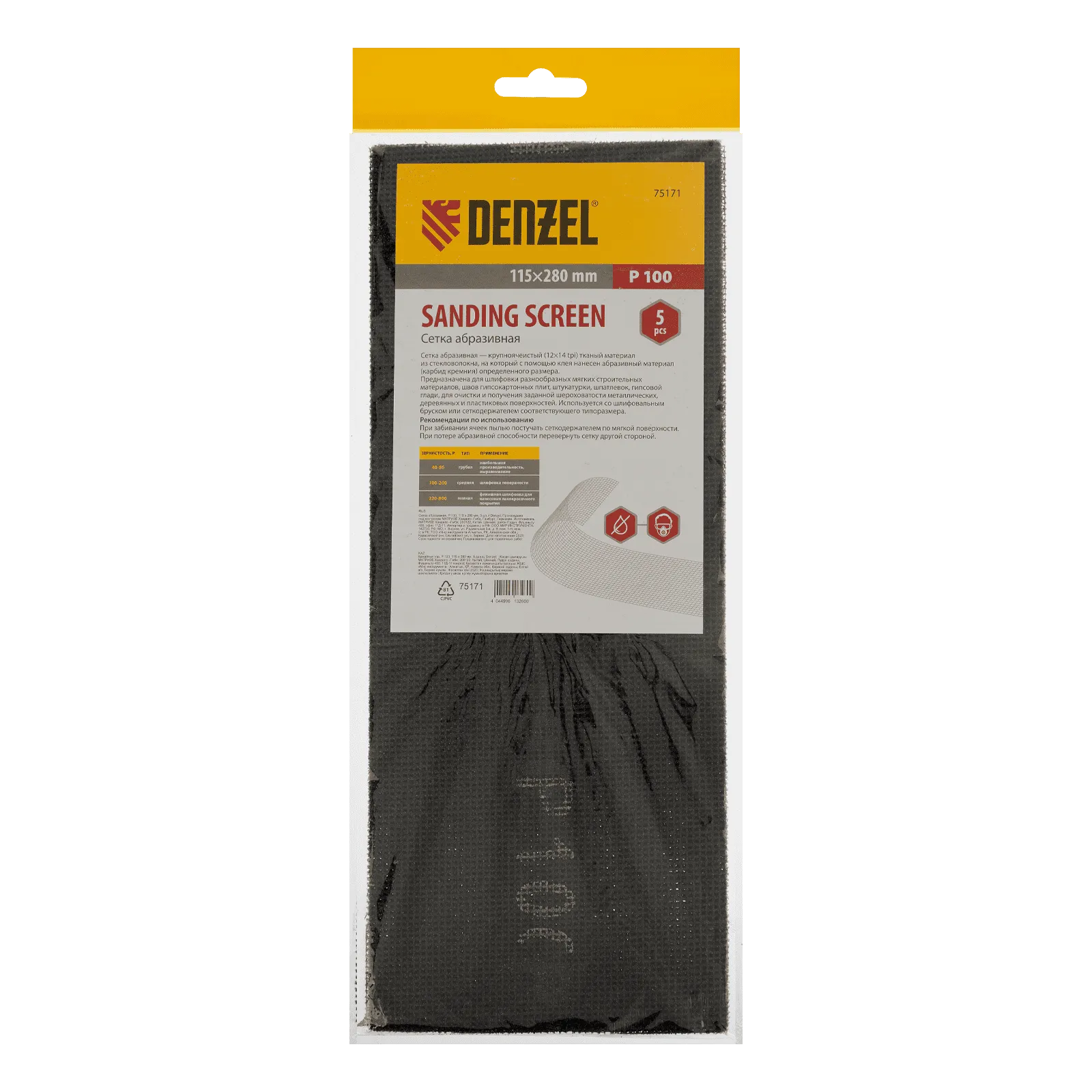 Абразивная сетка Denzel 75171 размером 115 х 280 мм, с зернистостью P 100, 5 шт. в упаковке, применяется для промежуточной шлифовки шпаклеванных поверхностей, а также твердой древесины и металла. Эффективно удаляет верхний слой материала, ржавчину и лакокрасочные покрытия, сглаживает заусенцы. Частицы карбида кремния долго не стачиваются и обеспечивают высокий рабочий ресурс сетки. Полотно совместимо с ручными шлифовальными приспособлениями — брусками и сеткодержателями соответствующего типоразмера.