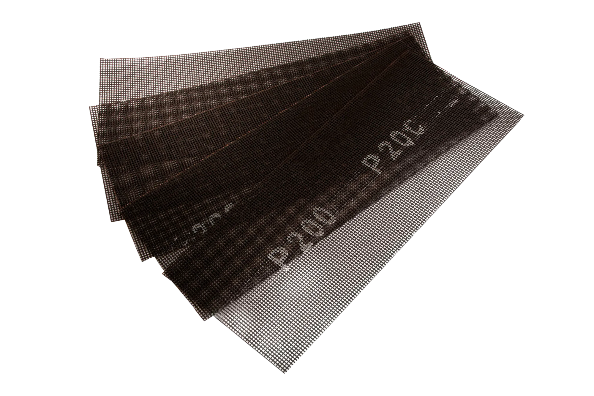 Абразивная сетка Denzel 75179 размером 115 х 280 мм, с зернистостью P 200, 5 шт. в упаковке, применяется для чистовой обработки и придания гладкости зашпаклеванным поверхностям, а также твердой древесине и металлу. Бережно снимает тонкий слой материала и лакокрасочного покрытия, удаляет ржавчину и заусенцы, сглаживает неровности. Обладает высоким ресурсом, т.к. заостренные зерна карбида кремния стачиваются медленно. Сетку устанавливают на ручное шлифовальное приспособление — брусок или сеткодержатель соответствующего типоразмера.