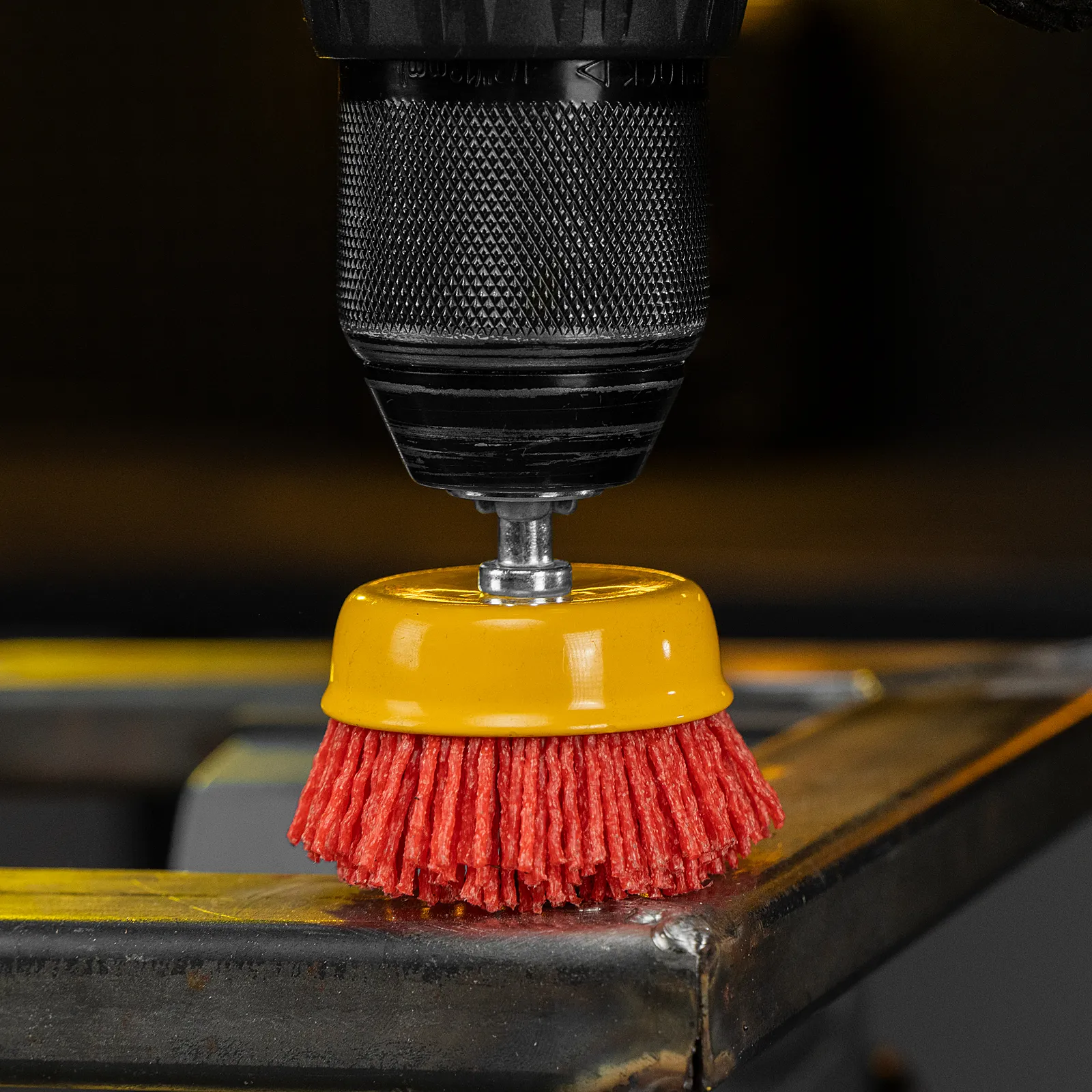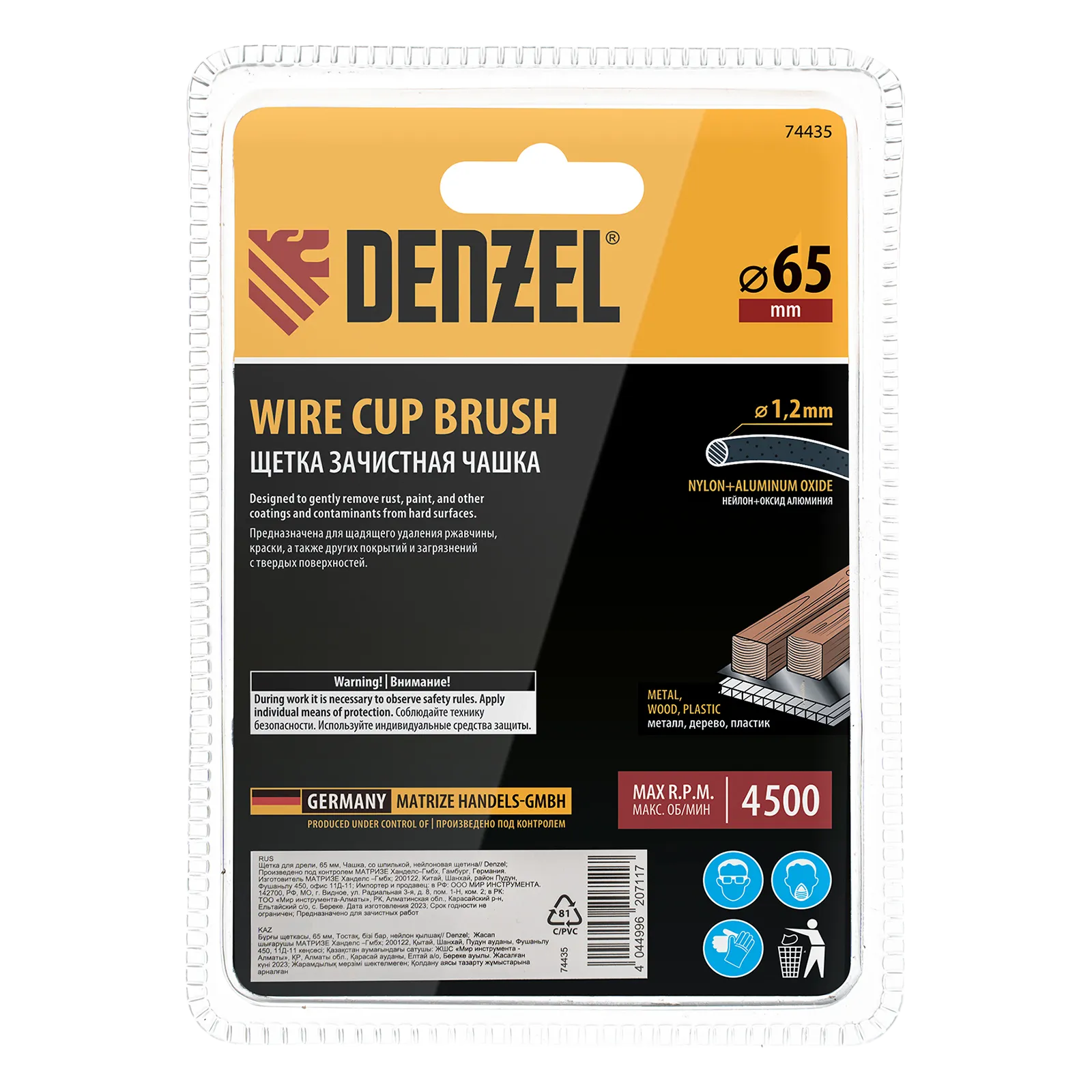 Щетка Denzel 74435 в форме чашки диаметром 65 мм, со шпилькой и нейлоновой щетиной, — насадка для дрели, предназначенная для выполнения шлифовальных работ по пластику, древесине, стали и цветным металлам. Щетина изготовлена из высококачественного нейлона с нанесенным абразивом из оксида алюминия. Щетка оптимальна для деликатного удаления загрязнений, краски, пятен ржавчины с твердых поверхностей. Позволяет придать шероховатость поверхности, подходит для браширования древесины. Насадка удобна для обработки плоских деталей большой площади.
