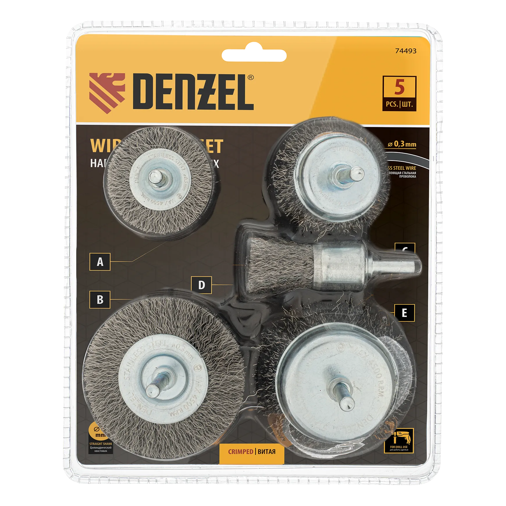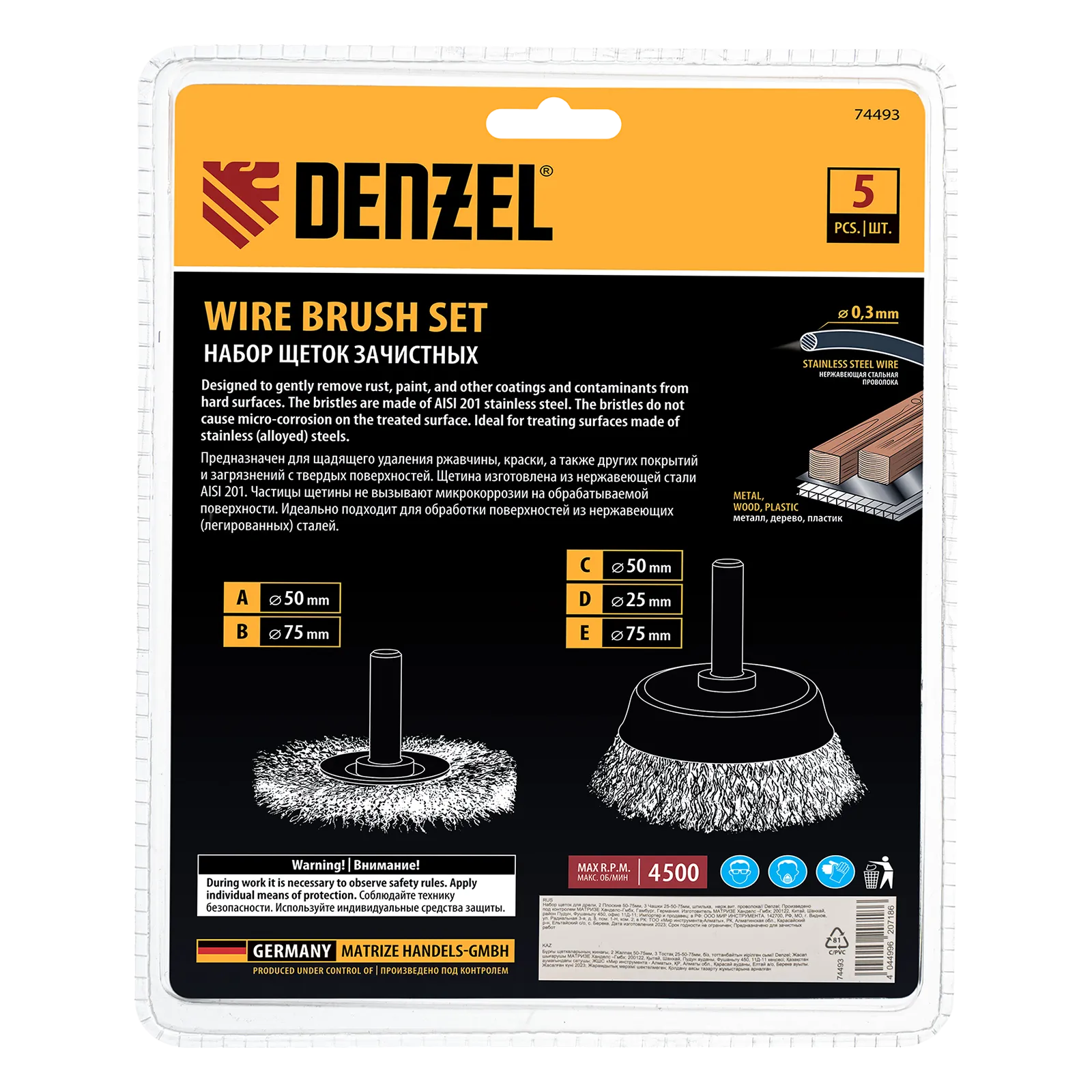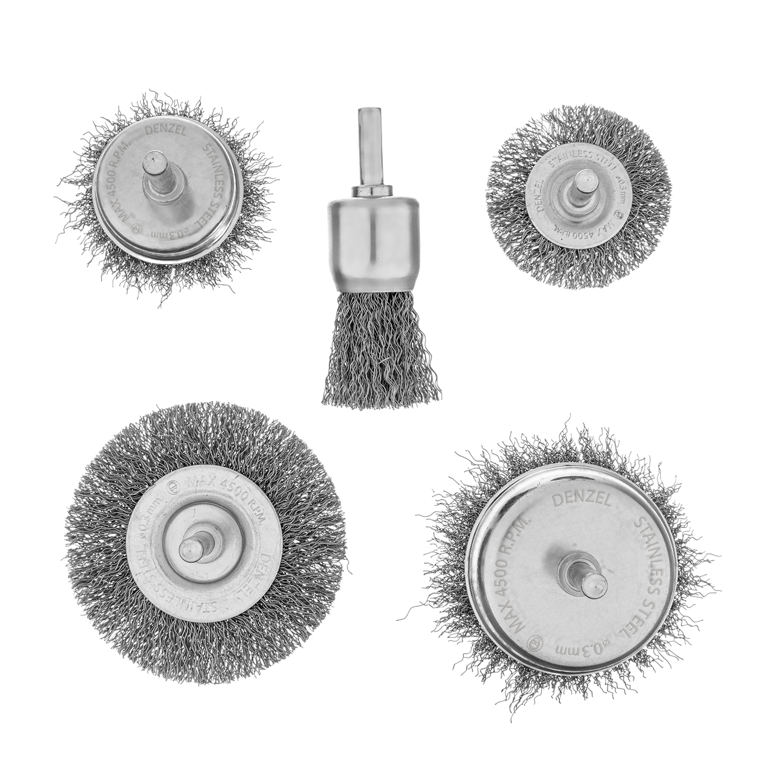 Набор щеток для дрели Denzel 74493 со шпилькой и щетиной из нержавеющей витой проволоки включает в себя 2 плоские насадки диаметром 50-75 мм и 3 «Чашки» диаметром 25-50-75 мм. Набор используется для щадящей обработки твердых поверхностей: металла, стали (в том числе нержавеющей), древесины, пластика, позволяет удалять старые лакокрасочные покрытия, ржавчину и загрязнения. Щетки в форме чашки оптимальны для обработки плоских поверхностей большой площади, плоская насадка удобна для зачистки пазов, изгибов и углов.