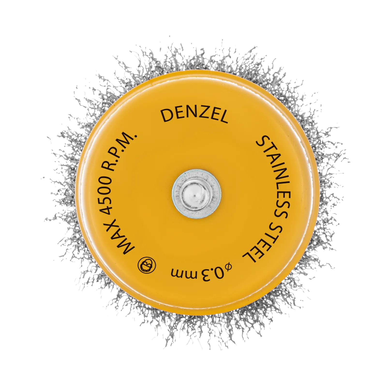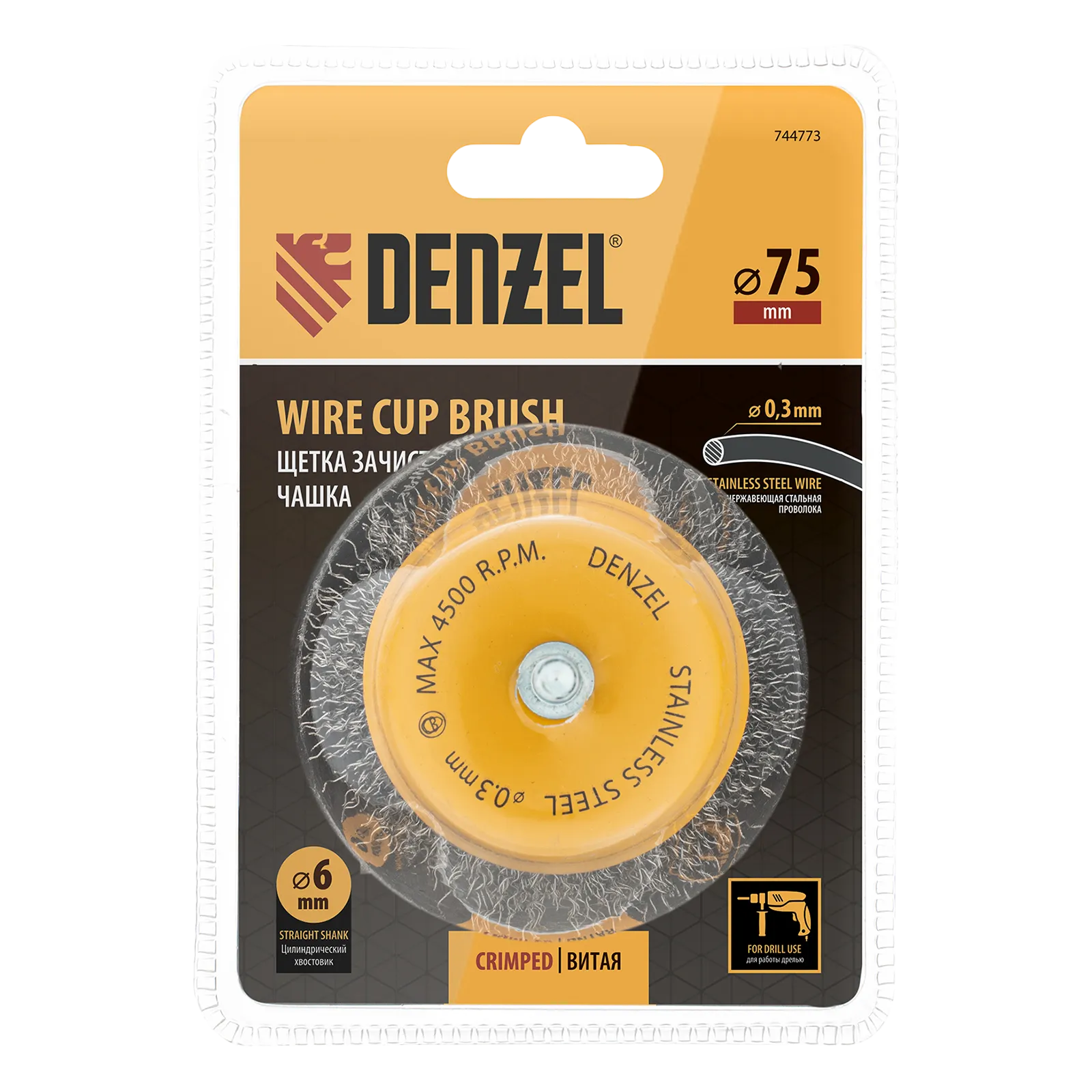 Щетка для дрели «Чашка» Denzel 744773 диаметром 75 мм, со шпилькой и щетиной из нержавеющей витой проволоки, используется для щадящей обработки плоских твердых поверхностей из металла, древесины, пластика, идеально подходит для нержавеющей стали. Оптимальна для снятия тонкого слоя старой краски, ржавчины, удаления загрязнений. Имеет хвостовик диаметром 6 мм и устанавливается в патрон дрели или прямошлифовальной машины (ПШМ).