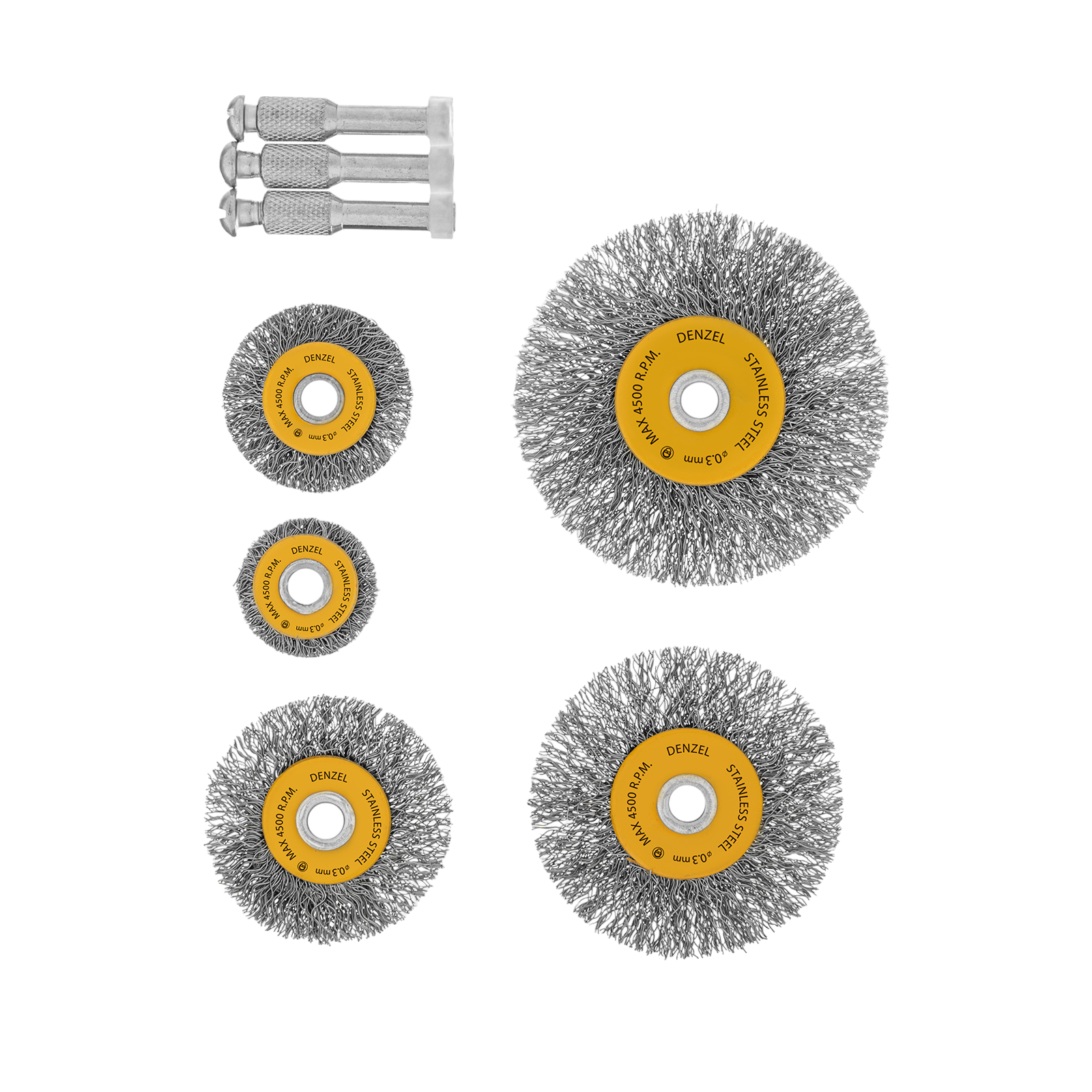 Набор щеток для дрели Denzel 74495 со шпилькой и щетиной из нержавеющей витой проволоки включает в себя 5 плоских щеток диаметром 25-38-50-63-75 мм. Набор используется для щадящей обработки твердых поверхностей: металла, стали (в том числе нержавеющей), древесины, пластика, позволяет удалять старые лакокрасочные покрытия, ржавчину и загрязнения. Плоская насадка удобна для зачистки пазов, изгибов и углов.