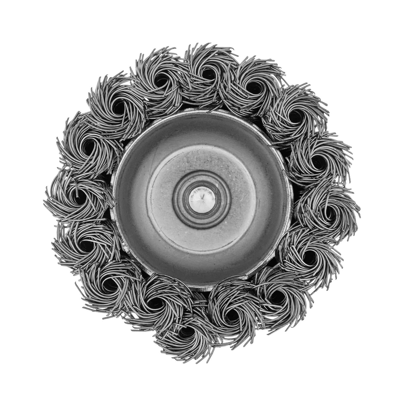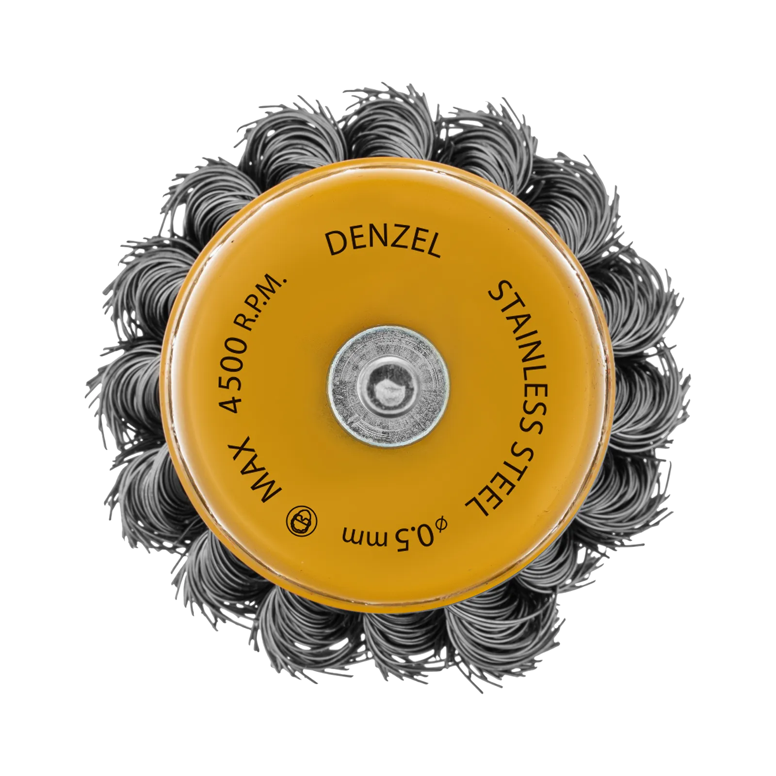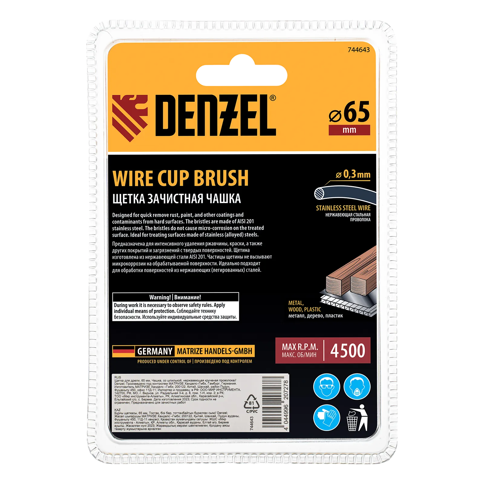 Щетка для дрели «Чашка» Denzel 744643 диаметром 65 мм, со шпилькой и щетиной из нержавеющей крученой проволоки, используется для грубой обработки плоских твердых поверхностей из металла, древесины, пластика, идеально подходит для нержавеющей стали. Оптимальна для снятия толстого слоя старой краски, ржавчины, удаления загрязнений. Имеет хвостовик диаметром 6 мм и устанавливается в патрон дрели или прямошлифовальной машины (ПШМ).