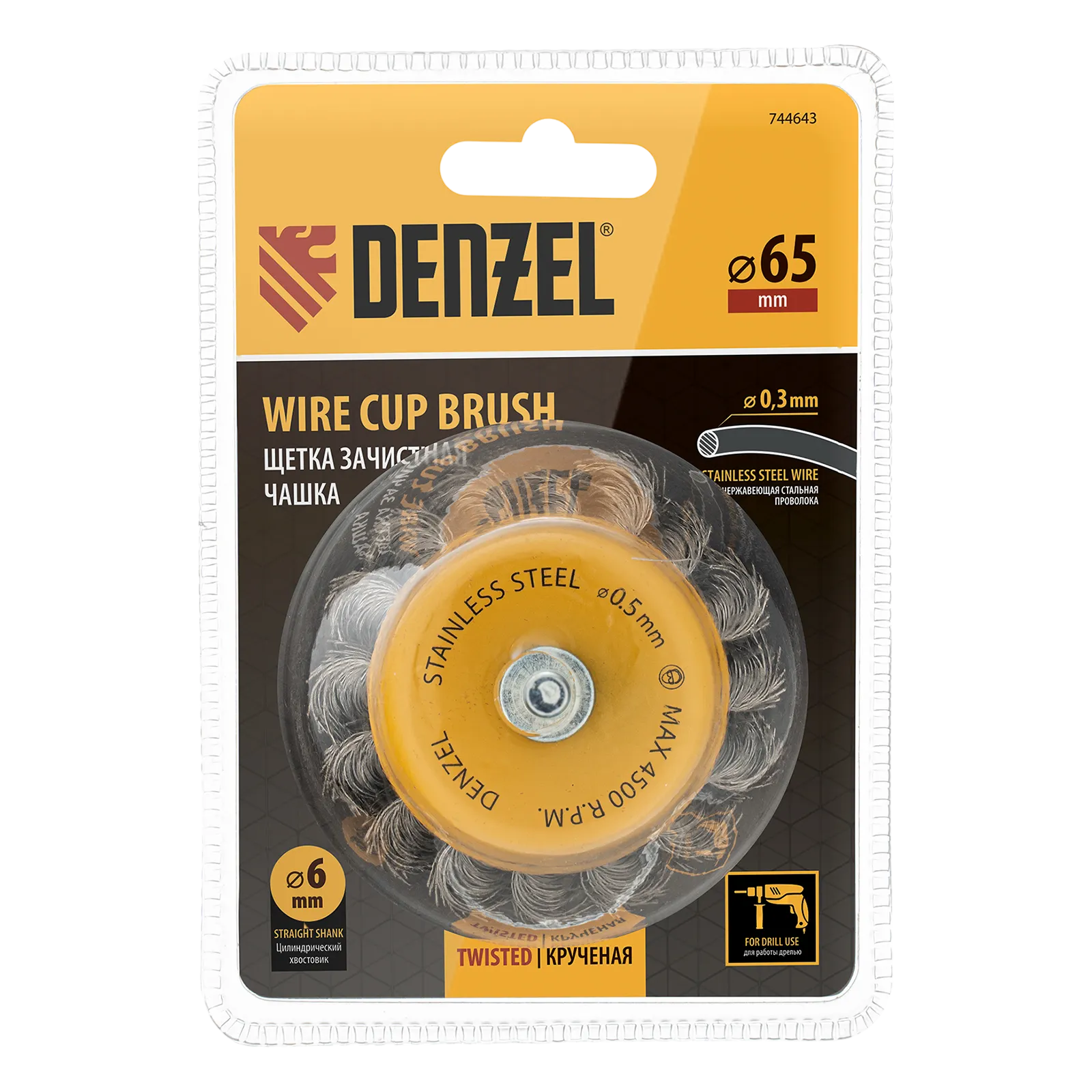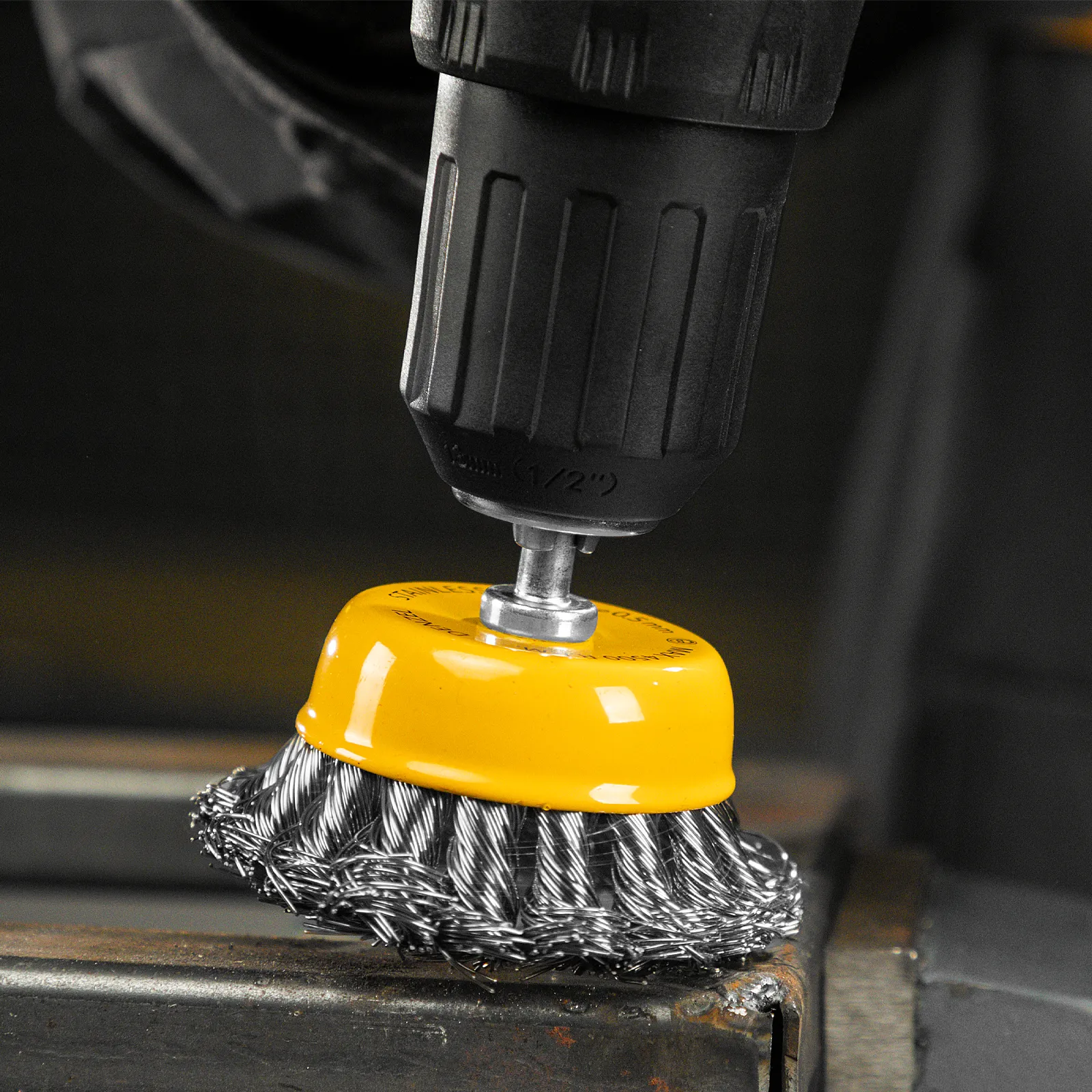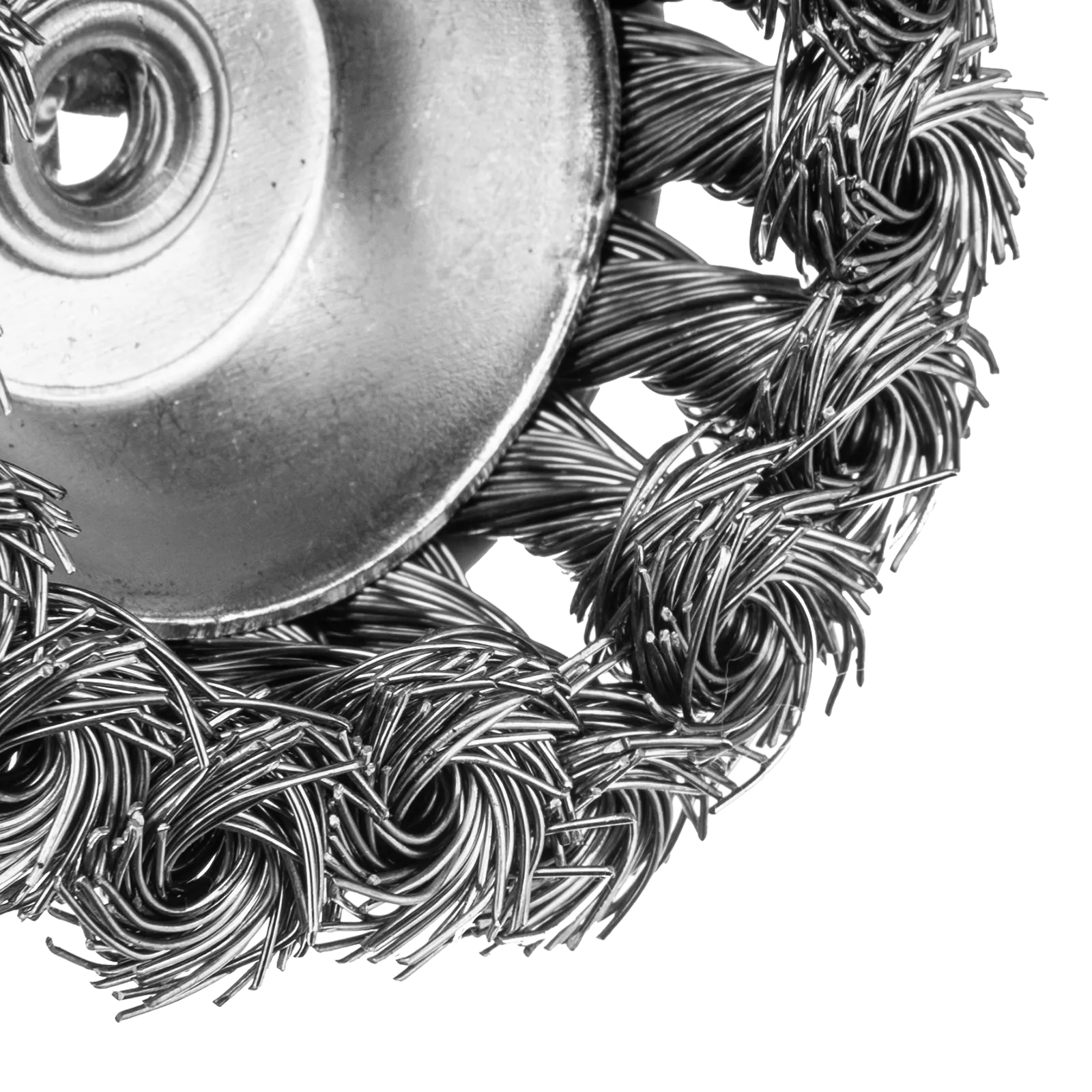 Щетка для дрели «Чашка» Denzel 744643 диаметром 65 мм, со шпилькой и щетиной из нержавеющей крученой проволоки, используется для грубой обработки плоских твердых поверхностей из металла, древесины, пластика, идеально подходит для нержавеющей стали. Оптимальна для снятия толстого слоя старой краски, ржавчины, удаления загрязнений. Имеет хвостовик диаметром 6 мм и устанавливается в патрон дрели или прямошлифовальной машины (ПШМ).