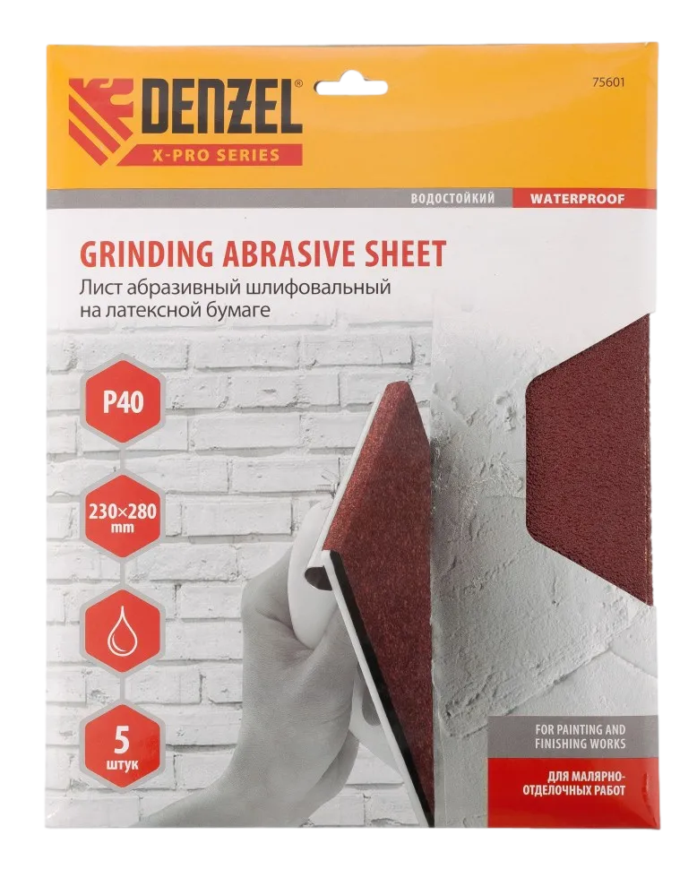 Шлифлист на бумажной основе Denzel Р40 арт. 75601 применяется для выравнивания шпатлеванных и оштукатуренных поверхностей на основе гипсовых и известковых составов, а также для обработки дерева, металла, пластика, удаления ржавчины, загрязнений, заусенцев, старых лакокрасочных покрытий.;Абразив Р40 с крупными зернами 400-500 мкм легко справится с грубой (черновой) обработкой поверхностей.
