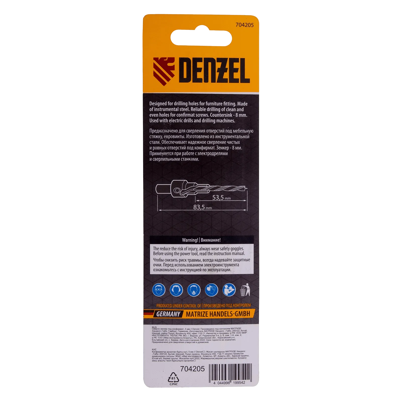 Сверло-зенкер Denzel 704205 диаметром 5 мм предназначено для получения точных и ровных отверстий под мебельную стяжку (евровинты, конфирмат) без дополнительного зенкования. Устанавливается в патрон дрели или сверлильного станка, подходит для работы с изделиями из древесины, ДСП, ЛДСП, фанеры. Оснастка пригодится во время сборки мебели и проведения ремонтных работ.