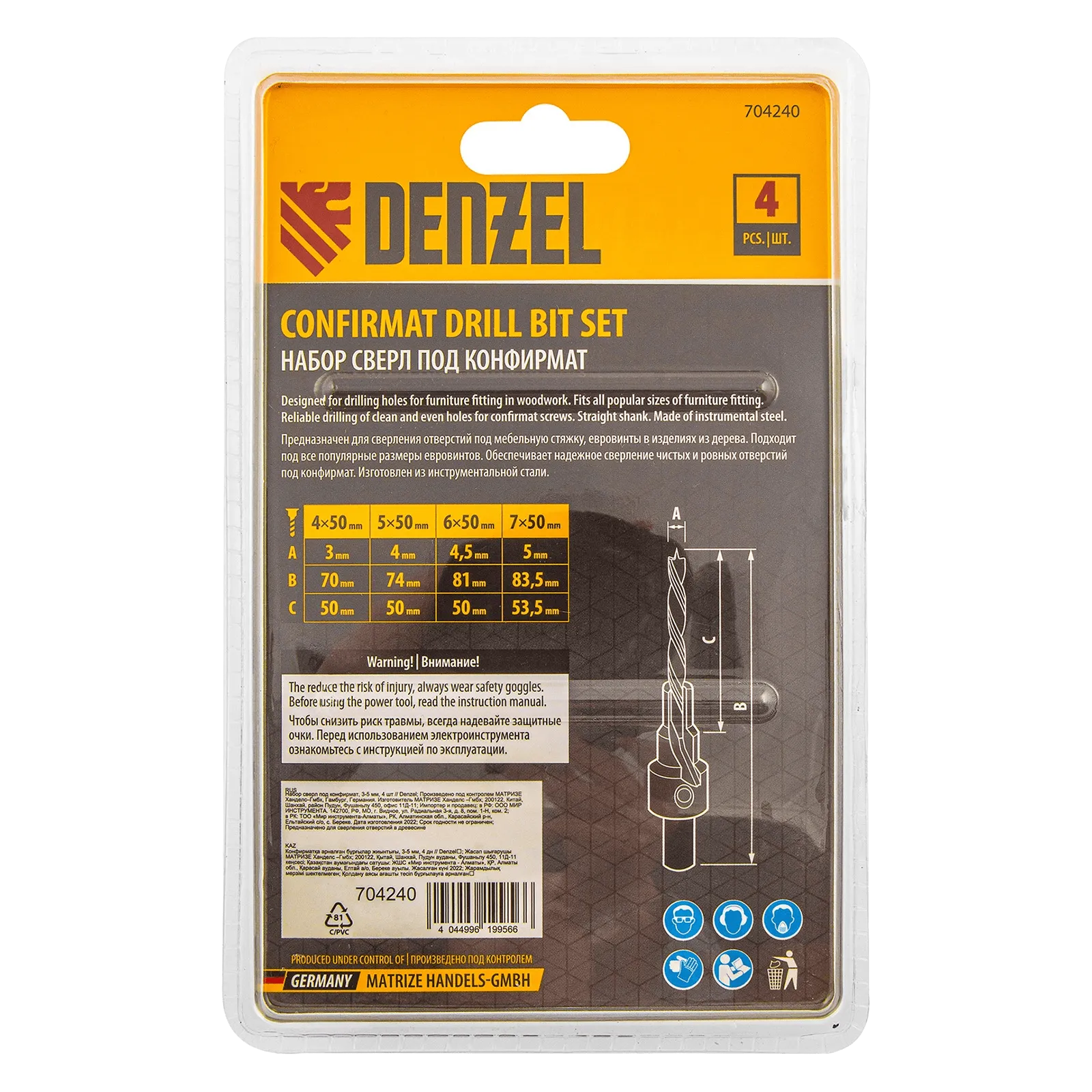 Набор сверл под конфирмат Denzel 704240 включает 4 оснастки диаметром 3-5 мм, предназначенные для получения отверстий под евровинты в древесине, фанере и ДСП. Сверла устанавливаются в патрон электрической дрели или сверлильного станка и подходят для конфирматов размером 4 х 50, 5 х 50, 6 х 50 и 7 х 50 мм. Набор используется в мебельном производстве.