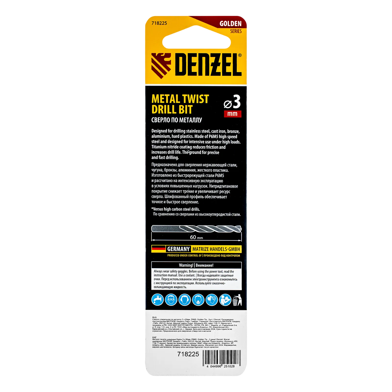 Спиральное сверло по металлу Denzel Golden Tip 718225 из стали P6M5, размером 3 х 60 мм, 2 шт. в упаковке, предназначено для получения отверстий в легированных и цветных металлах — меди, алюминии, мягкой бронзе, титане, латуни. Оснастка позволяет эффективно справляться с поставленными задачами благодаря оптимальному углу заточки 135°. Класс точности A гарантирует высокое качество полученных отверстий. Сверло используется для проведения монтажно-сборочных работ.