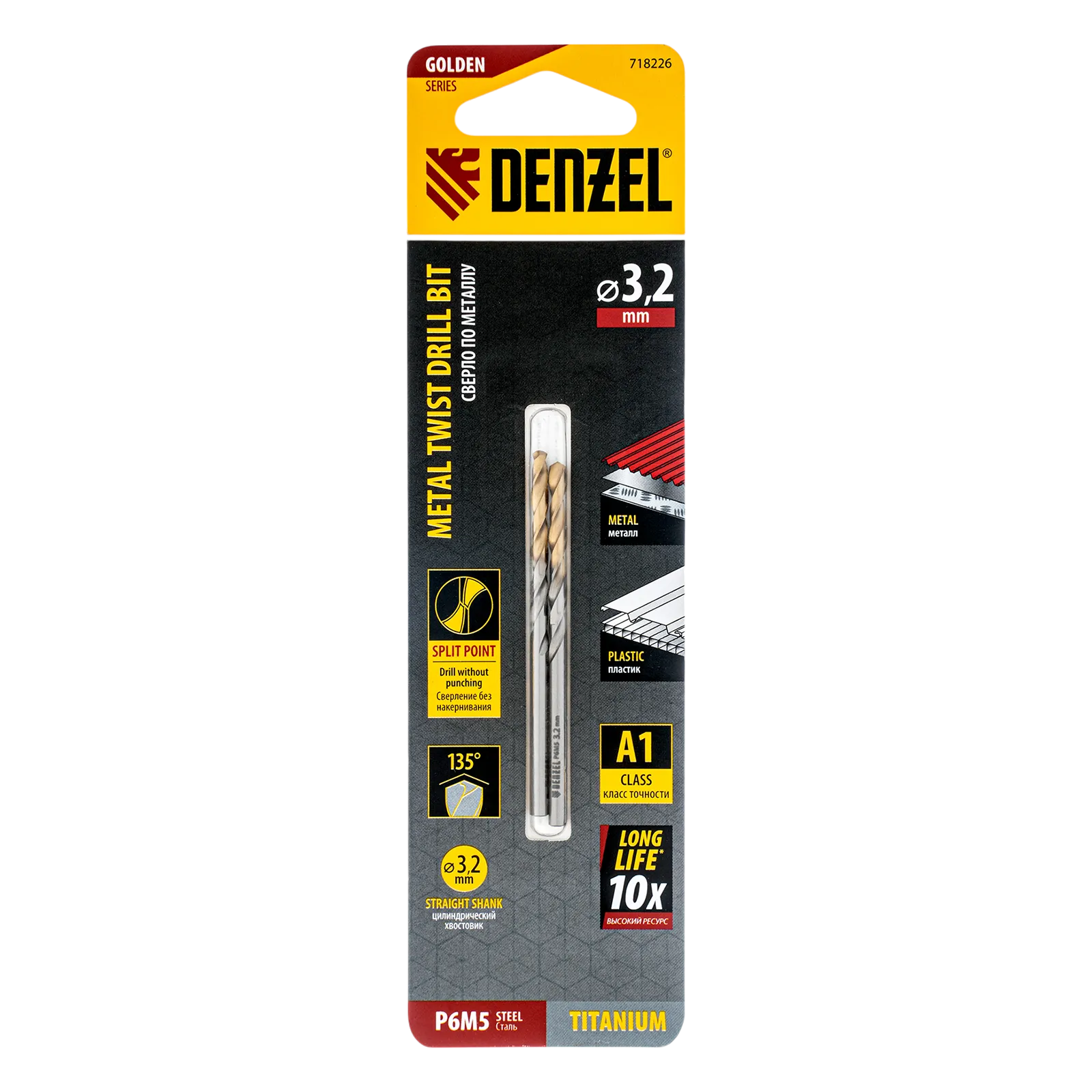 Спиральное сверло по металлу Denzel Golden Tip 718226 из стали P6M5, размером 3,2 х 65 мм, 2 шт. в упаковке, предназначено для получения отверстий в легированных и цветных металлах — меди, алюминии, мягкой бронзе, титане, латуни. Оснастка позволяет эффективно справляться с поставленными задачами благодаря оптимальному углу заточки 135°. Класс точности A гарантирует высокое качество полученных отверстий. Сверло используется для проведения монтажно-сборочных работ.