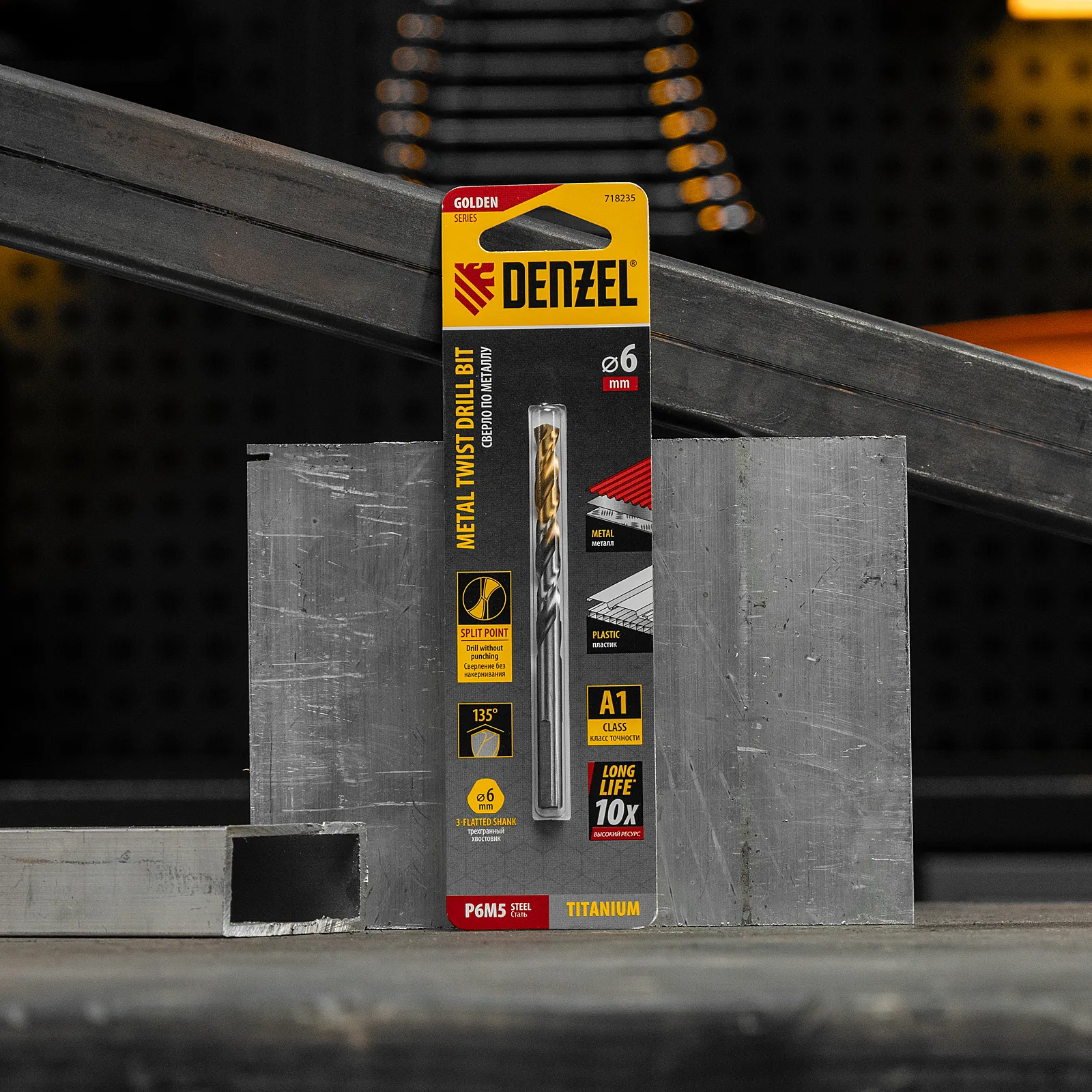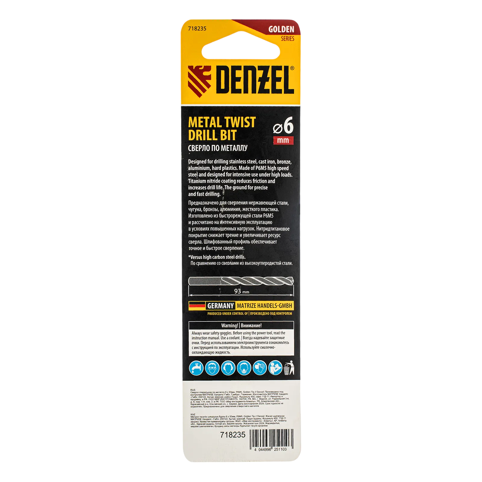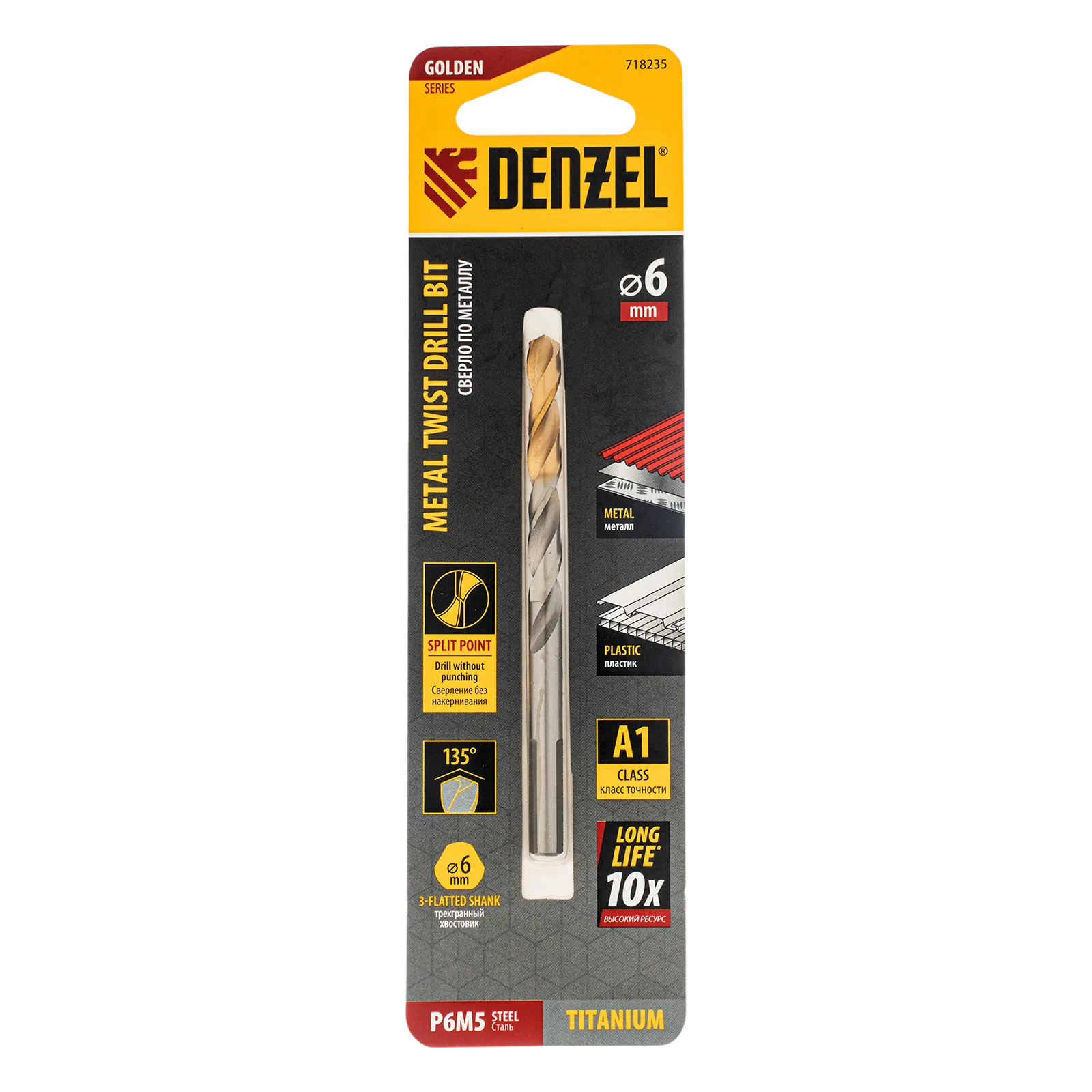 Спиральное сверло по металлу Denzel Golden Tip 718235 из стали P6M5, размером 6 х 93 мм, предназначено для получения отверстий в легированных и цветных металлах — меди, алюминии, мягкой бронзе, титане, латуни. Оснастка позволяет эффективно справляться с поставленными задачами благодаря оптимальному углу заточки 135°. Класс точности A гарантирует высокое качество полученных отверстий. Сверло используется для проведения монтажно-сборочных работ.