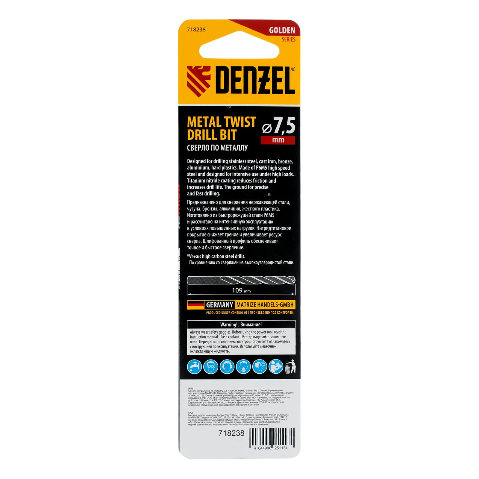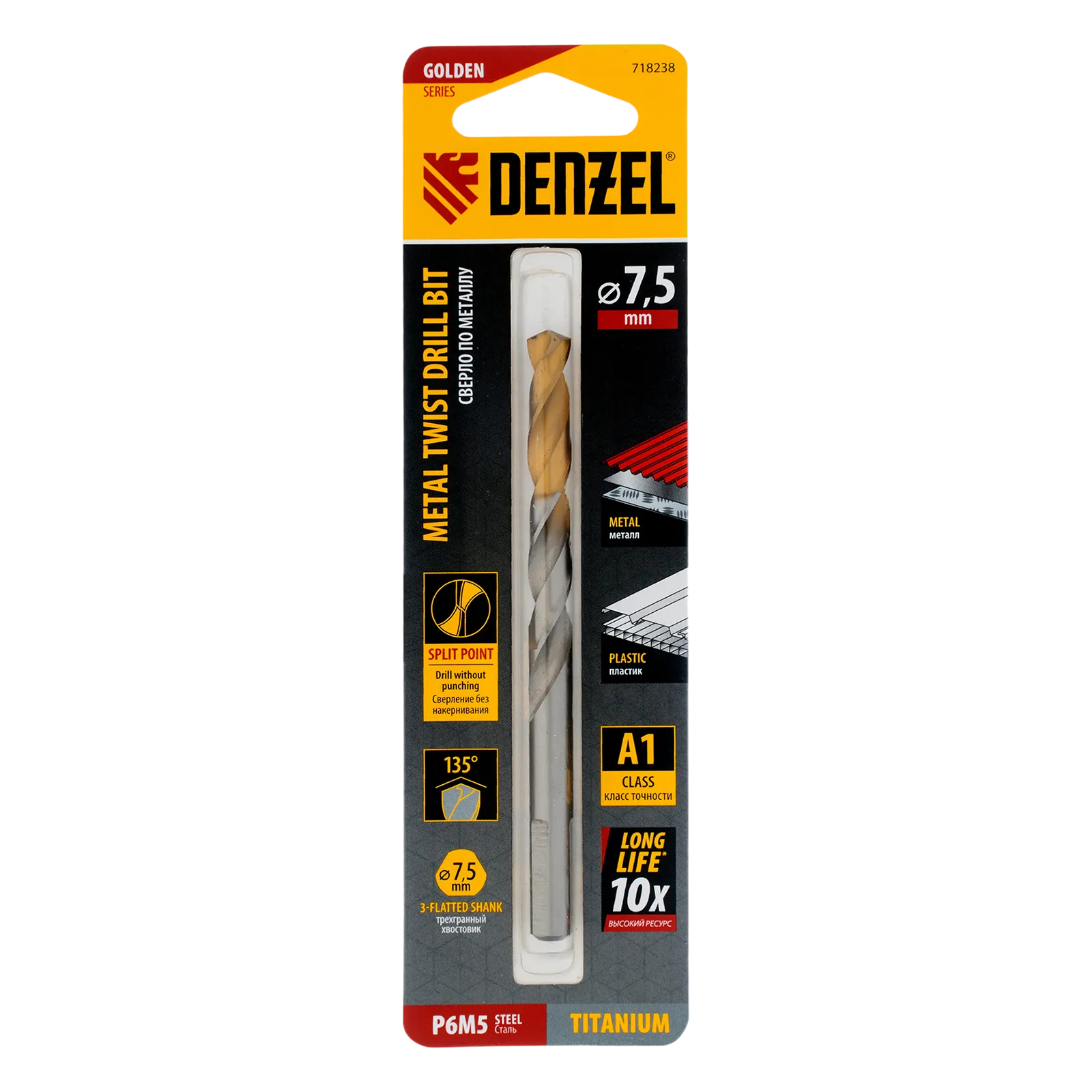 Спиральное сверло по металлу Denzel Golden Tip 718238 из стали P6M5, размером 7,5 х 109 мм, предназначено для получения отверстий в легированных и цветных металлах — меди, алюминии, мягкой бронзе, титане, латуни. Оснастка позволяет эффективно справляться с поставленными задачами благодаря оптимальному углу заточки 135°. Класс точности A гарантирует высокое качество полученных отверстий. Сверло используется для проведения монтажно-сборочных работ.