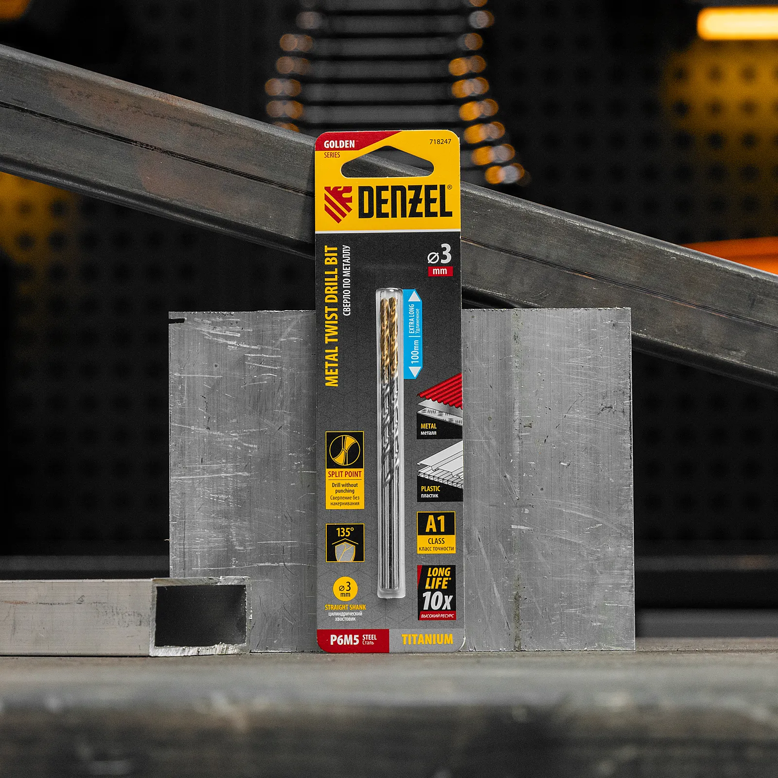 Удлиненное спиральное сверло по металлу Denzel Golden Tip 718247 из стали P6M5, размером 3 х 100 мм, 2 шт. в упаковке, предназначено для получения отверстий в легированных и цветных металлах — меди, алюминии, мягкой бронзе, титане, латуни. Оснастка позволяет эффективно справляться с этими задачами благодаря оптимальному углу заточки 135°. Класс точности A гарантирует высокое качество работ, а удлиненный профиль позволяет сверлить глубокие отверстия. Сверло используется для проведения монтажно-сборочных работ.
