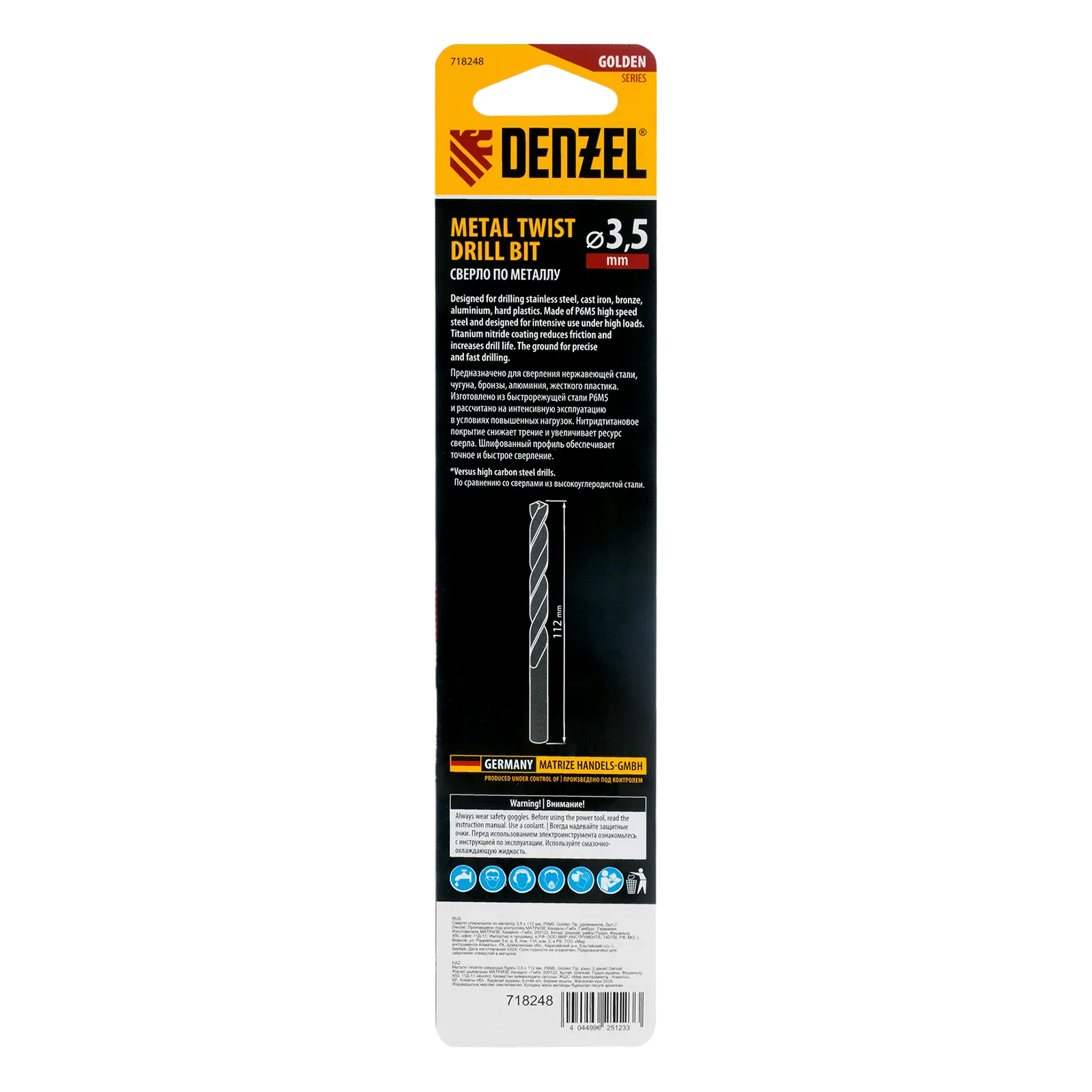 Удлиненное спиральное сверло по металлу Denzel Golden Tip 718248 из стали P6M5, размером 3,5 х 112 мм, 2 шт. в упаковке, предназначено для получения отверстий в легированных и цветных металлах — меди, алюминии, мягкой бронзе, титане, латуни. Оснастка позволяет эффективно справляться с этими задачами благодаря оптимальному углу заточки 135°. Класс точности A гарантирует высокое качество работ, а удлиненный профиль позволяет сверлить глубокие отверстия. Сверло используется для проведения монтажно-сборочных работ.