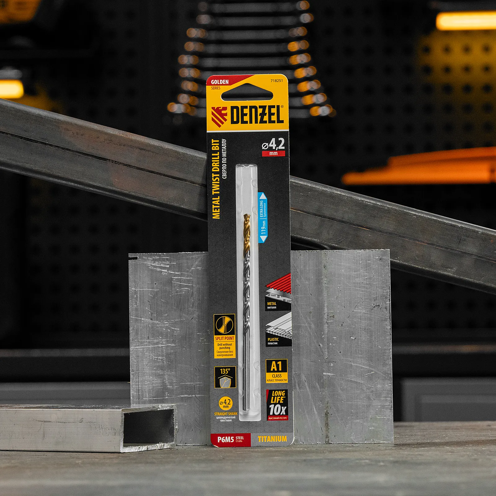 Удлиненное спиральное сверло по металлу Denzel Golden Tip 718251 из стали P6M5, размером 4,2 х 119 мм, предназначено для получения отверстий в легированных и цветных металлах — меди, алюминии, мягкой бронзе, титане, латуни. Оснастка позволяет эффективно справляться с этими задачами благодаря оптимальному углу заточки 135°. Класс точности A гарантирует высокое качество работ, а удлиненный профиль позволяет сверлить глубокие отверстия. Сверло используется для проведения монтажно-сборочных работ.