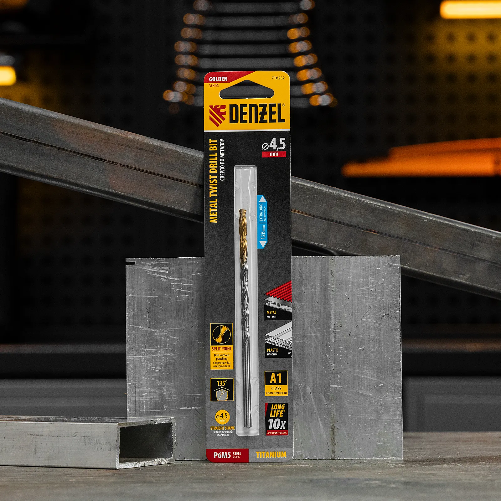 Удлиненное спиральное сверло по металлу Denzel Golden Tip 718252 из стали P6M5, размером 4,5 х 126 мм, предназначено для получения отверстий в легированных и цветных металлах — меди, алюминии, мягкой бронзе, титане, латуни. Оснастка позволяет эффективно справляться с этими задачами благодаря оптимальному углу заточки 135°. Класс точности A гарантирует высокое качество работ, а удлиненный профиль позволяет сверлить глубокие отверстия. Сверло используется для проведения монтажно-сборочных работ.