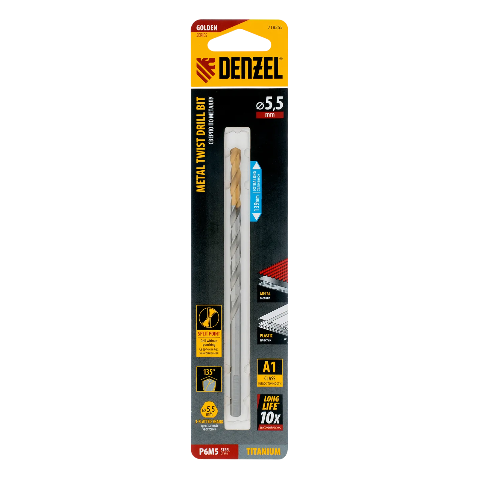 Удлиненное спиральное сверло по металлу Denzel Golden Tip 718255 из стали P6M5, размером 5,5 х 139 мм, предназначено для получения отверстий в легированных и цветных металлах — меди, алюминии, мягкой бронзе, титане, латуни. Оснастка позволяет эффективно справляться с этими задачами благодаря оптимальному углу заточки 135°. Класс точности A гарантирует высокое качество работ, а удлиненный профиль позволяет сверлить глубокие отверстия. Сверло используется для проведения монтажно-сборочных работ.