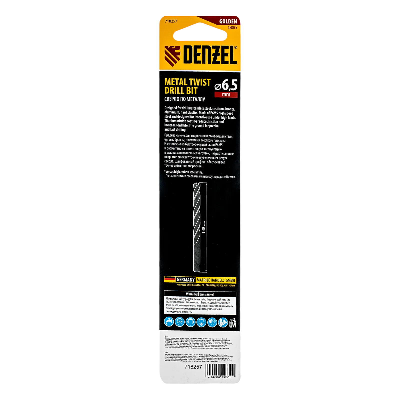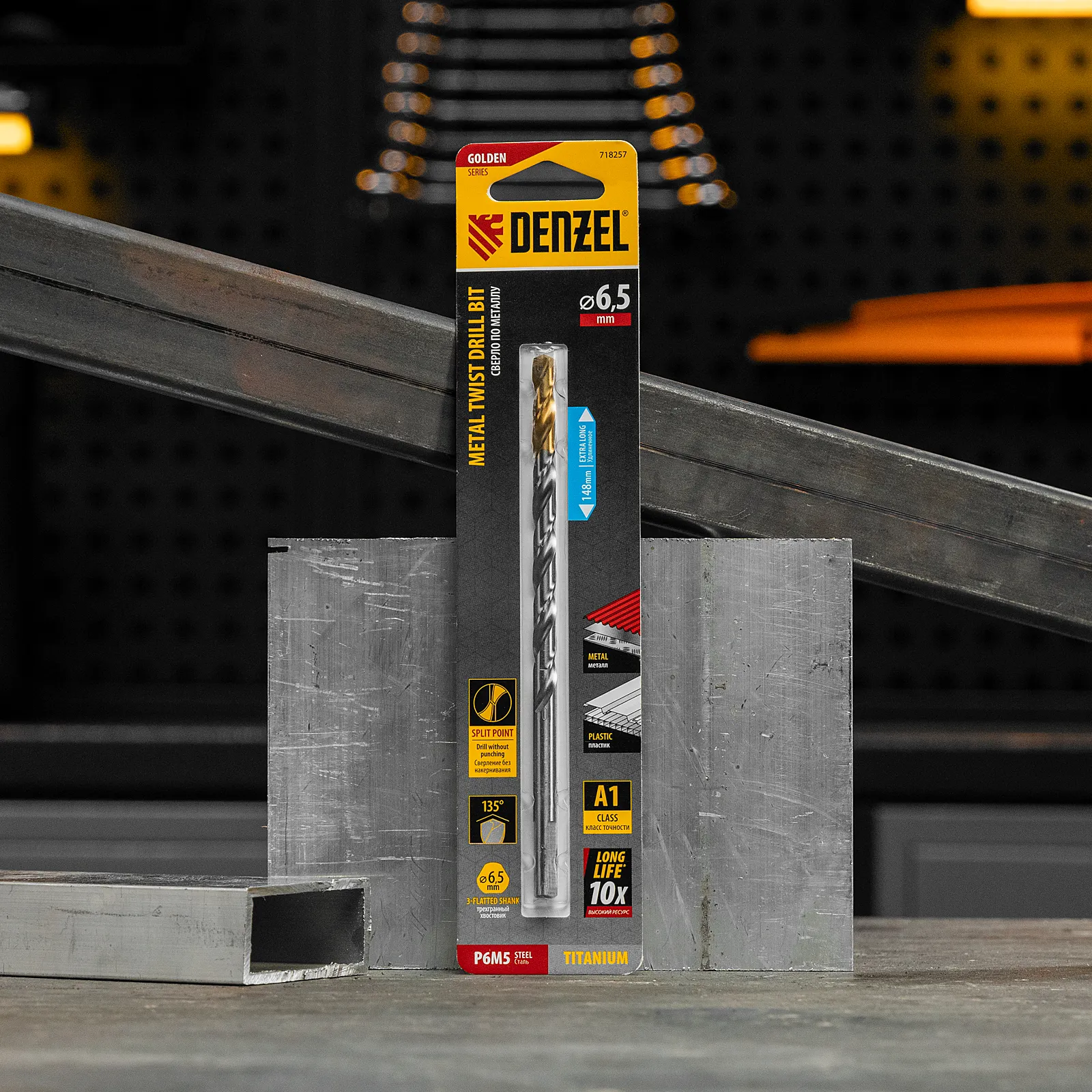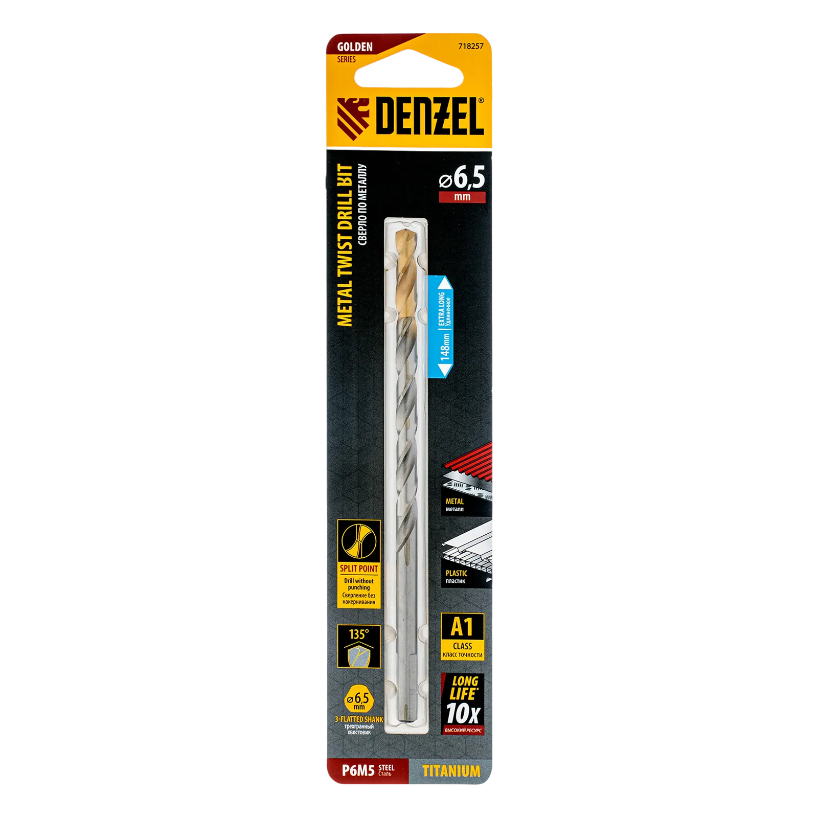 Удлиненное спиральное сверло по металлу Denzel Golden Tip 718257 из стали P6M5, размером 6,5 х 148 мм, предназначено для получения отверстий в легированных и цветных металлах — меди, алюминии, мягкой бронзе, титане, латуни. Оснастка позволяет эффективно справляться с этими задачами благодаря оптимальному углу заточки 135°. Класс точности A гарантирует высокое качество работ, а удлиненный профиль позволяет сверлить глубокие отверстия. Сверло используется для проведения монтажно-сборочных работ.
