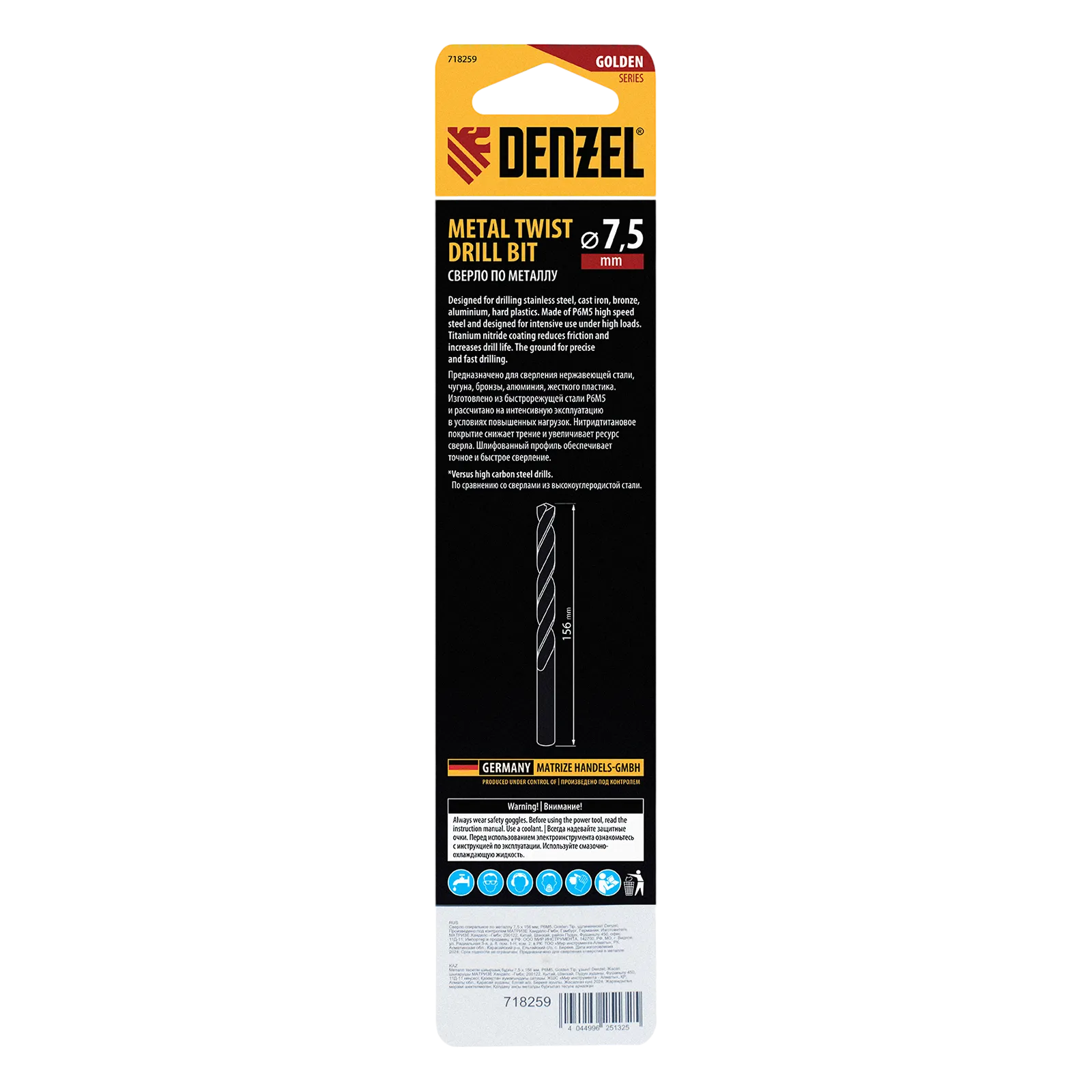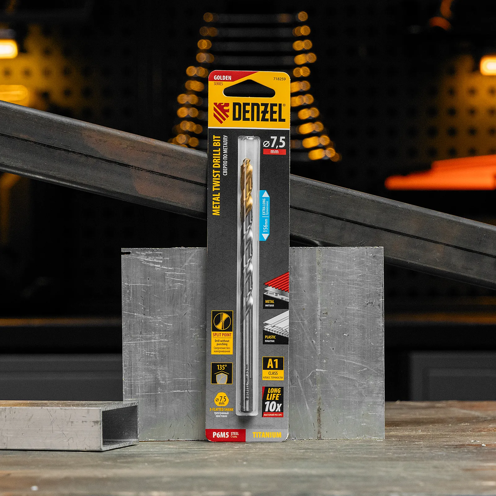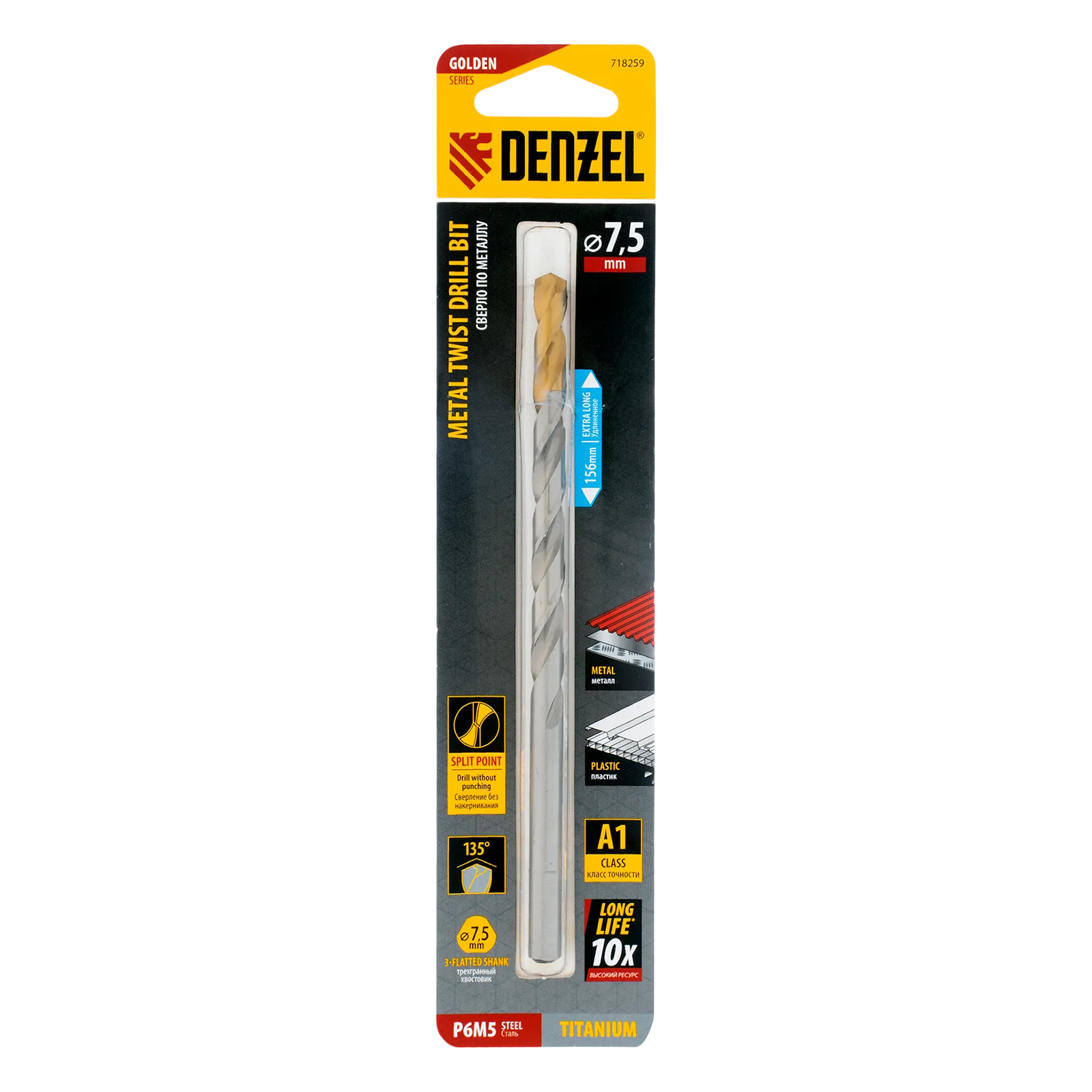 Удлиненное спиральное сверло по металлу Denzel Golden Tip 718259 из стали P6M5, размером 7,5 х 156 мм, предназначено для получения отверстий в легированных и цветных металлах — меди, алюминии, мягкой бронзе, титане, латуни. Оснастка позволяет эффективно справляться с этими задачами благодаря оптимальному углу заточки 135°. Класс точности A гарантирует высокое качество работ, а удлиненный профиль позволяет сверлить глубокие отверстия. Сверло используется для проведения монтажно-сборочных работ.