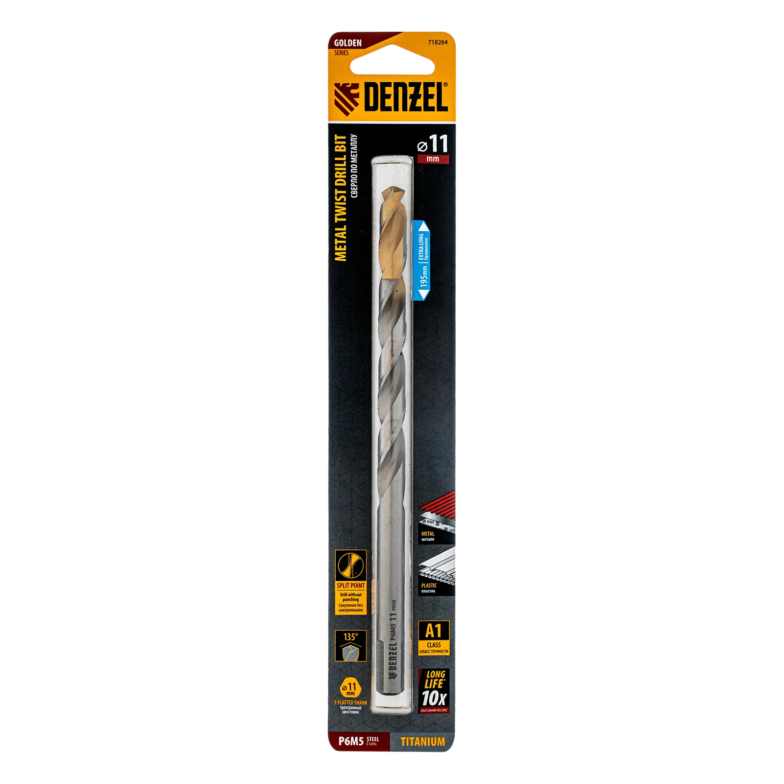 Удлиненное спиральное сверло по металлу Denzel Golden Tip 718264 из стали P6M5, размером 11 х 195 мм, предназначено для получения отверстий в легированных и цветных металлах — меди, алюминии, мягкой бронзе, титане, латуни. Оснастка позволяет эффективно справляться с этими задачами благодаря оптимальному углу заточки 135°. Класс точности A гарантирует высокое качество работ, а удлиненный профиль позволяет сверлить глубокие отверстия. Сверло используется для проведения монтажно-сборочных работ.