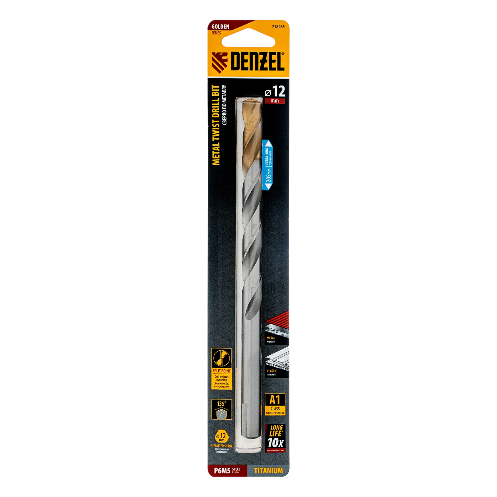 Удлиненное спиральное сверло по металлу Denzel Golden Tip 718265 из стали P6M5, размером 12 х 205 мм, предназначено для получения отверстий в легированных и цветных металлах — меди, алюминии, мягкой бронзе, титане, латуни. Оснастка позволяет эффективно справляться с этими задачами благодаря оптимальному углу заточки 135°. Класс точности A гарантирует высокое качество работ, а удлиненный профиль позволяет сверлить глубокие отверстия. Сверло используется для проведения монтажно-сборочных работ.