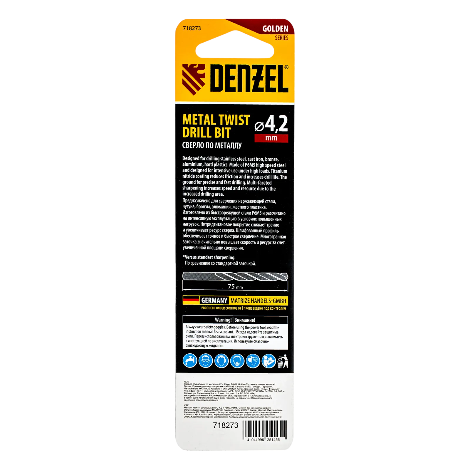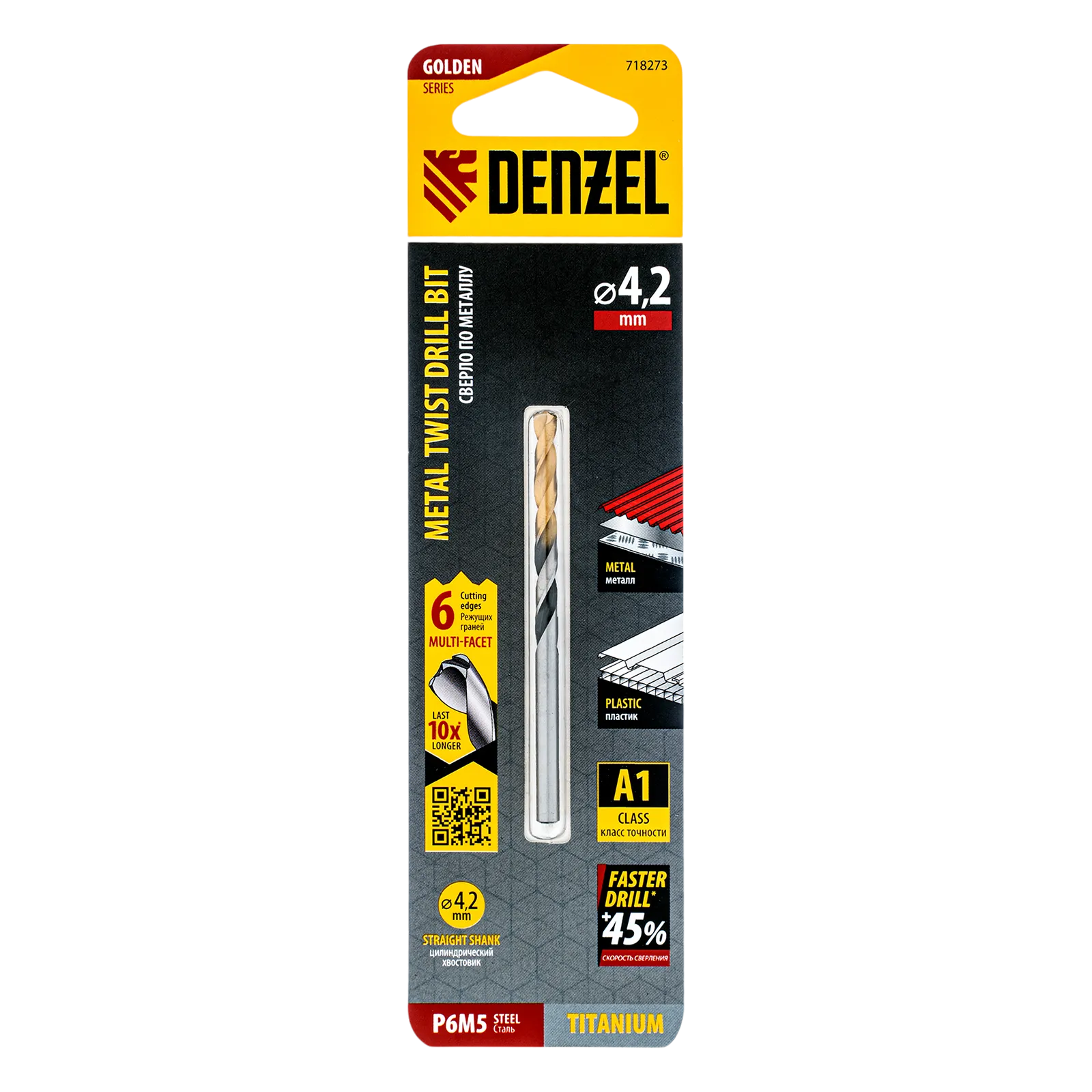 Спиральное сверло по металлу Denzel Golden Tip 718273 из стали P6M5, размером 4,2 х 75 мм, с многогранной заточкой, предназначено для получения отверстий в легированных сталях и цветных металлах. Многогранная заточка позволяет получать чистые и ровные отверстия практически без заусенцев. Сверлу присвоен класс точности A, что гарантирует высокое качество работ. Оснастка подходит для бытового и профессионального применения.