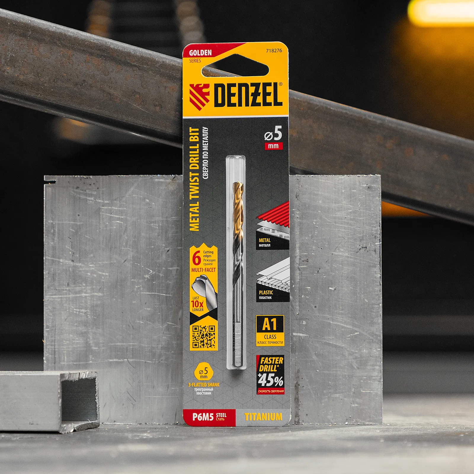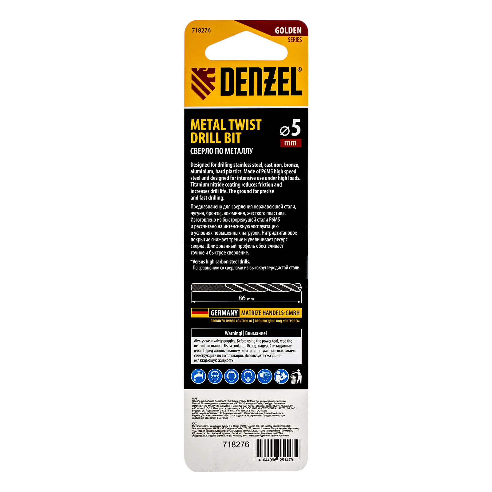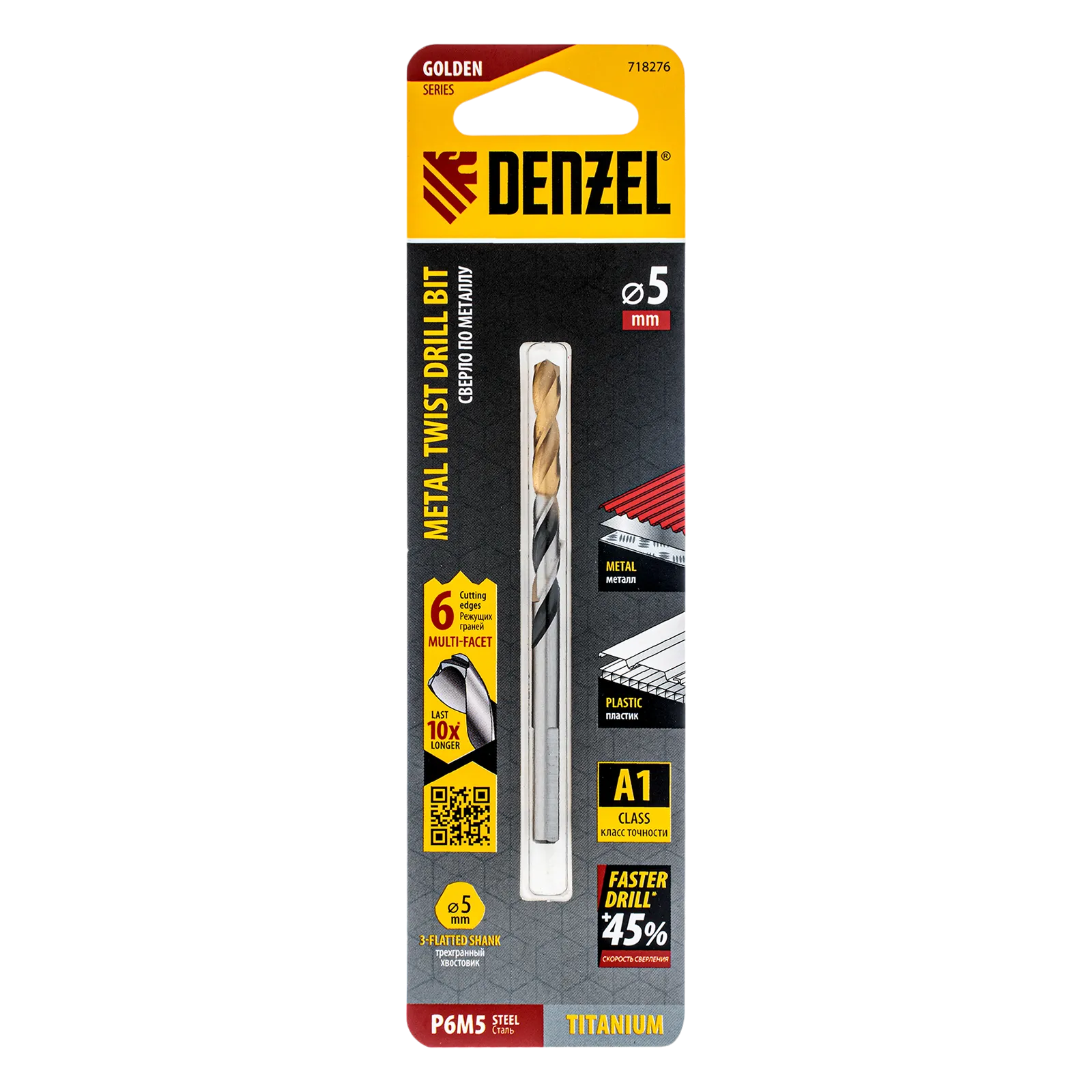 Спиральное сверло по металлу Denzel Golden Tip 718276 из стали P6M5, размером 5 х 86 мм, с многогранной заточкой, предназначено для получения отверстий в легированных сталях и цветных металлах. Многогранная заточка позволяет получать чистые и ровные отверстия практически без заусенцев. Сверлу присвоен класс точности A, что гарантирует высокое качество работ. Оснастка подходит для бытового и профессионального применения.
