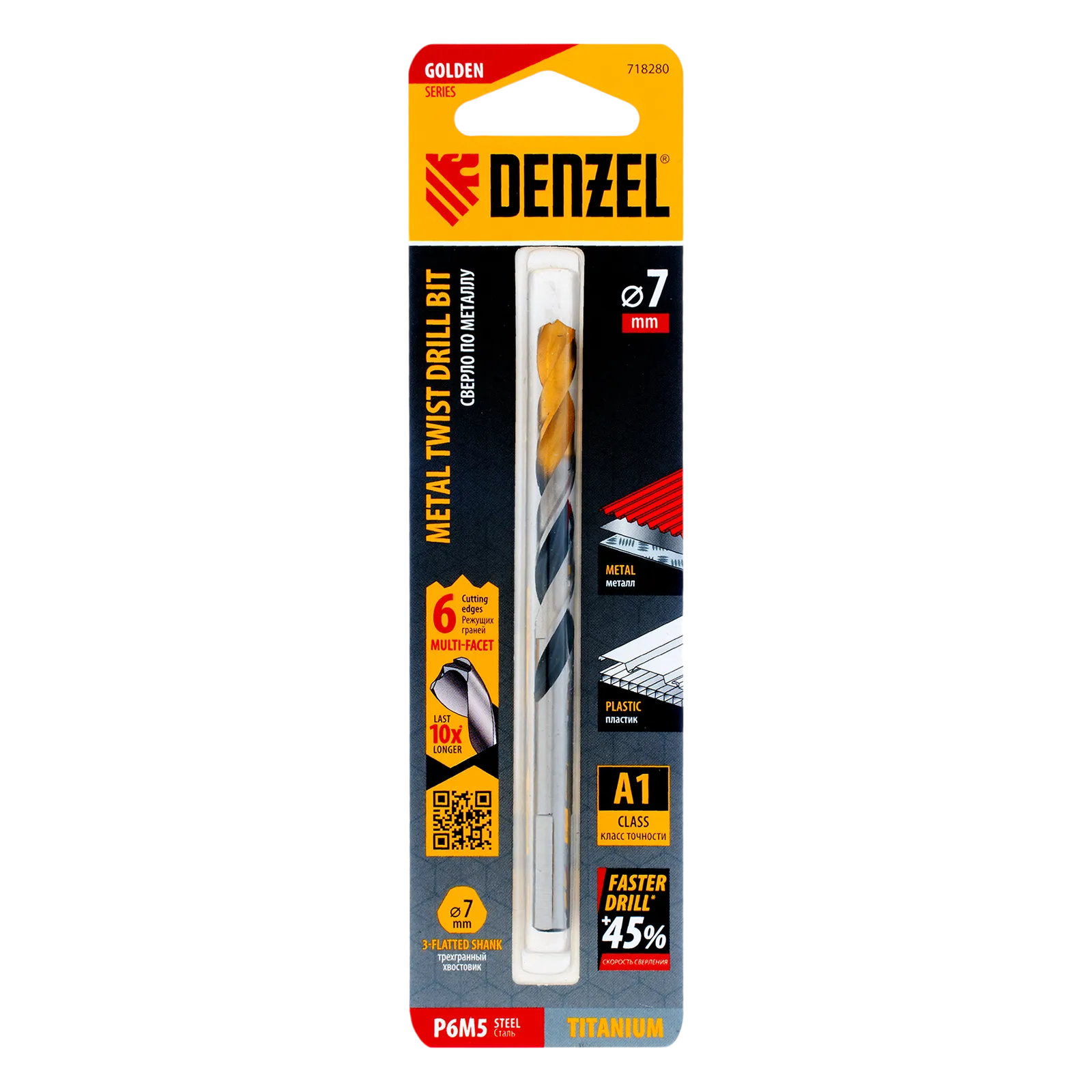 Спиральное сверло по металлу Denzel Golden Tip 718280 из стали P6M5, размером 7 х 109 мм, с многогранной заточкой, предназначено для получения отверстий в легированных сталях и цветных металлах. Многогранная заточка позволяет получать чистые и ровные отверстия практически без заусенцев. Сверлу присвоен класс точности A, что гарантирует высокое качество работ. Оснастка подходит для бытового и профессионального применения.