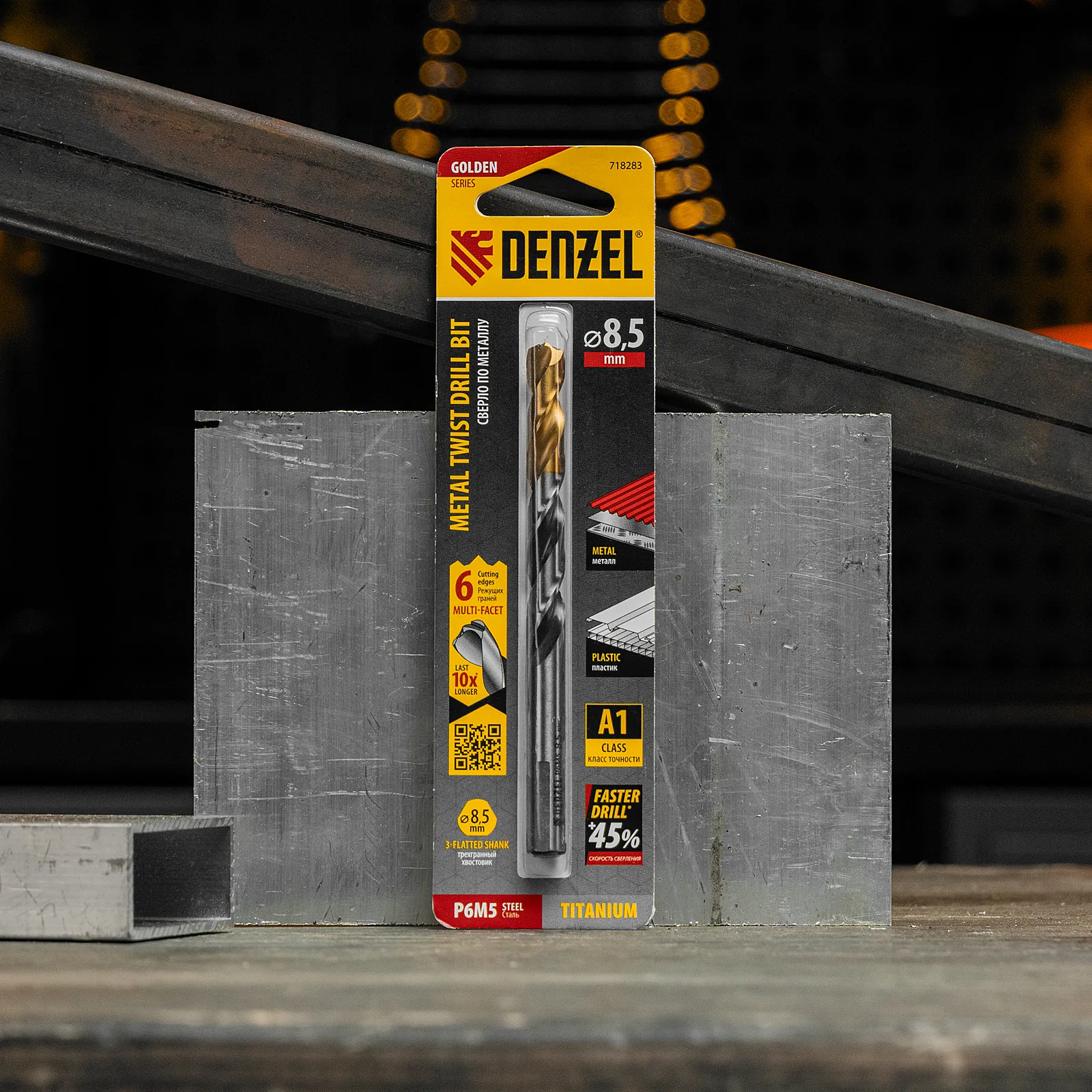 Спиральное сверло по металлу Denzel Golden Tip 718283 из стали P6M5, размером 8,5 х 117 мм, с многогранной заточкой, предназначено для получения отверстий в легированных сталях и цветных металлах. Многогранная заточка позволяет получать чистые и ровные отверстия практически без заусенцев. Сверлу присвоен класс точности A, что гарантирует высокое качество работ. Оснастка подходит для бытового и профессионального применения.
