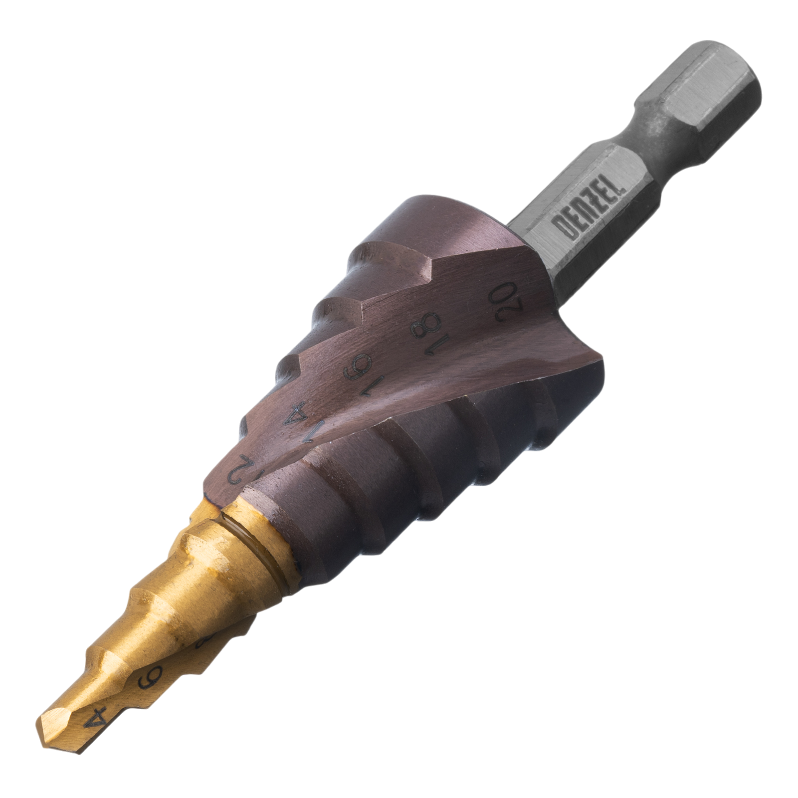 Ступенчатое сверло Denzel 723613 из стали P6M5K5, с 6-гранным хвостовиком, предназначено для сверления отверстий диаметром от 4 до 20 мм в сталях, цветных металлах и пластике. Избавляет от необходимости иметь при себе целый набор традиционных сверл. Позволяет получать отверстия с ровными краями и уже снятой фаской под гайку или болт. Оснастке присвоен класс точности A1. Сверло пригодится дома и в мастерской.
