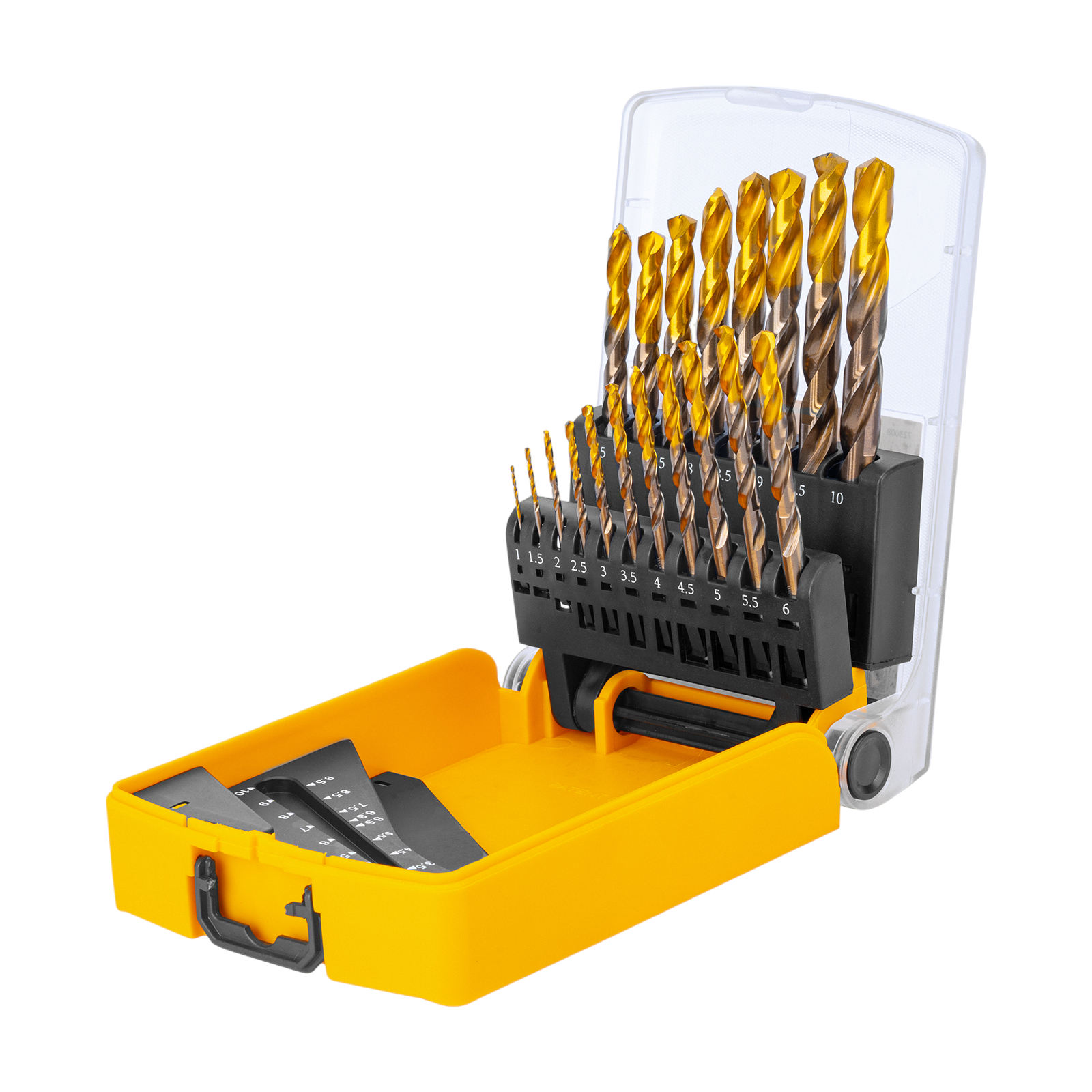 Набор Denzel Golden Tip 723008 состоит из 19 сверл по металлу диаметром 1-10 мм, изготовленных из стали P6M5K8. Угол заточки составляет 135°, что позволяет получать чистые и ровные отверстия в закаленной и нержавеющей стали, цветных и черных металлах, а также жестком пластике. Сверлам присвоен класс точности A1, что гарантирует высокое качество выполняемых работ. Оснастка характеризуется пониженным коэффициентом трения, что облегчает сверление и улучшает отвод стружки. Набор будет полезен дома и в мастерской.